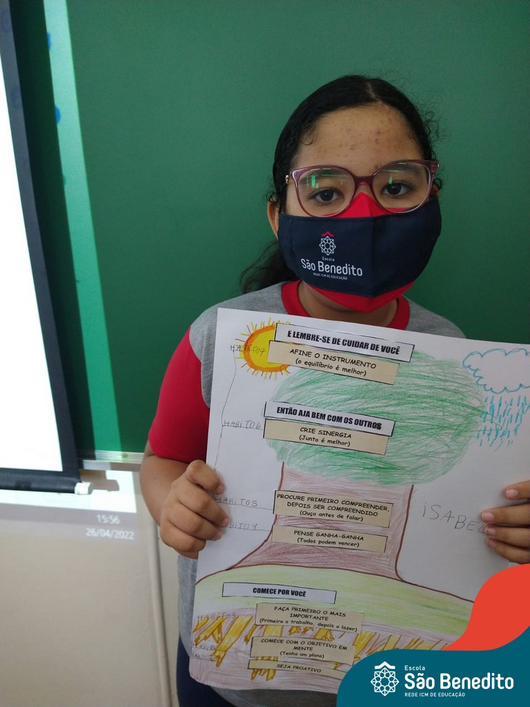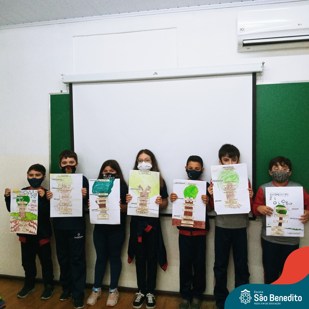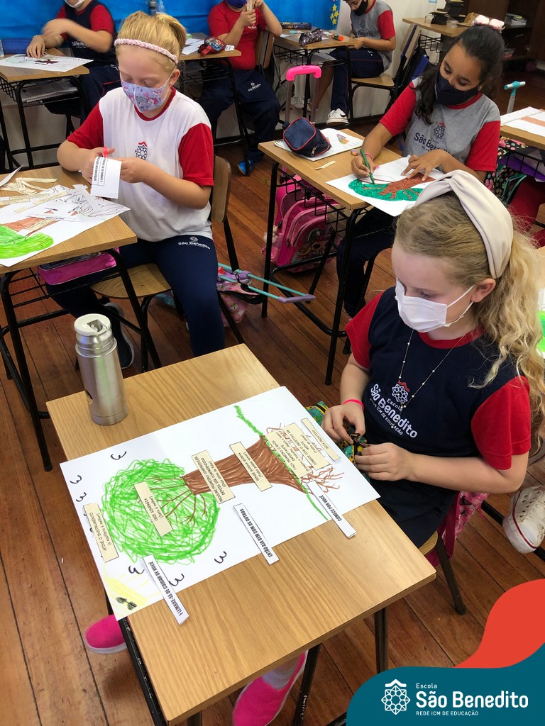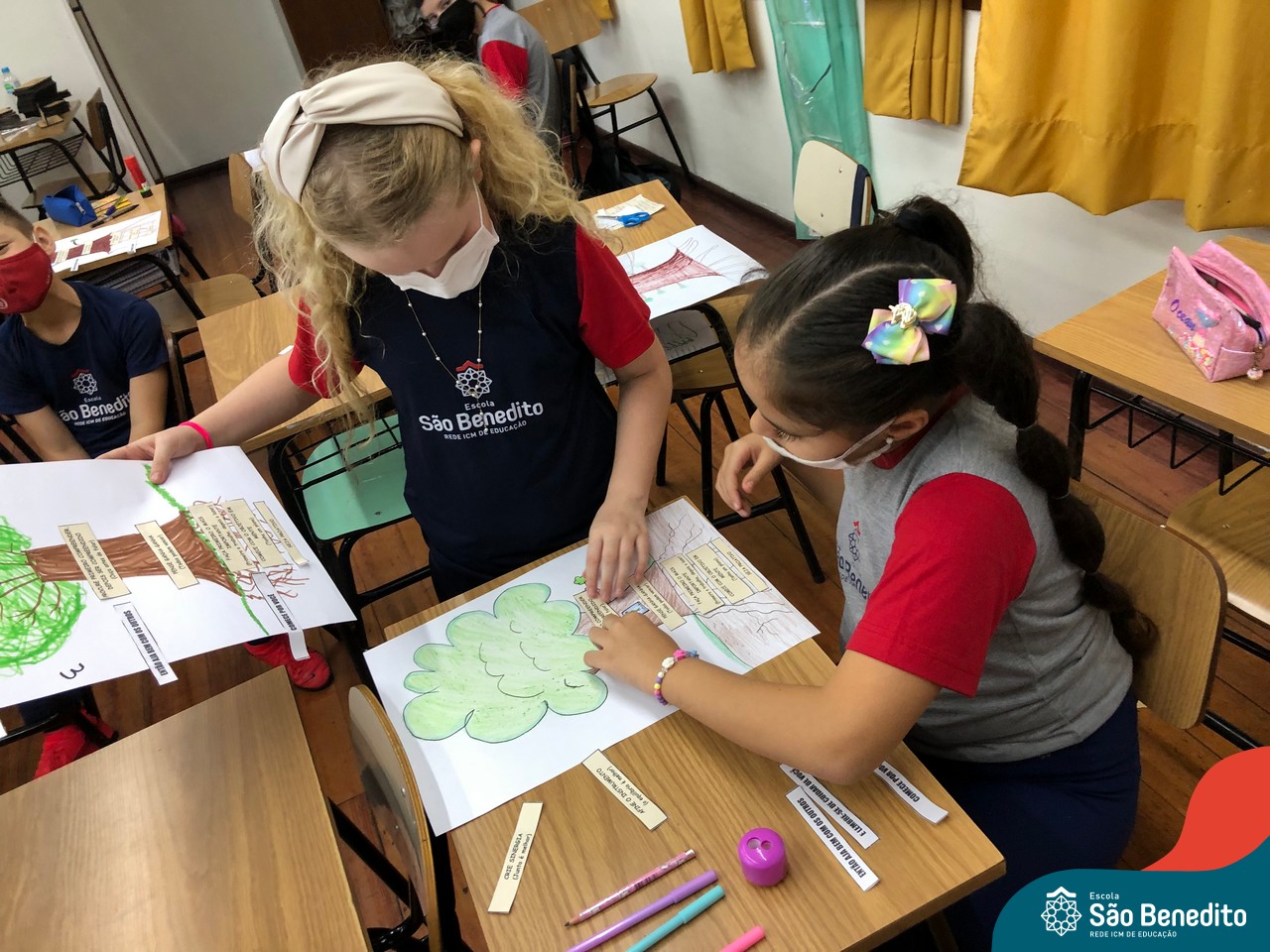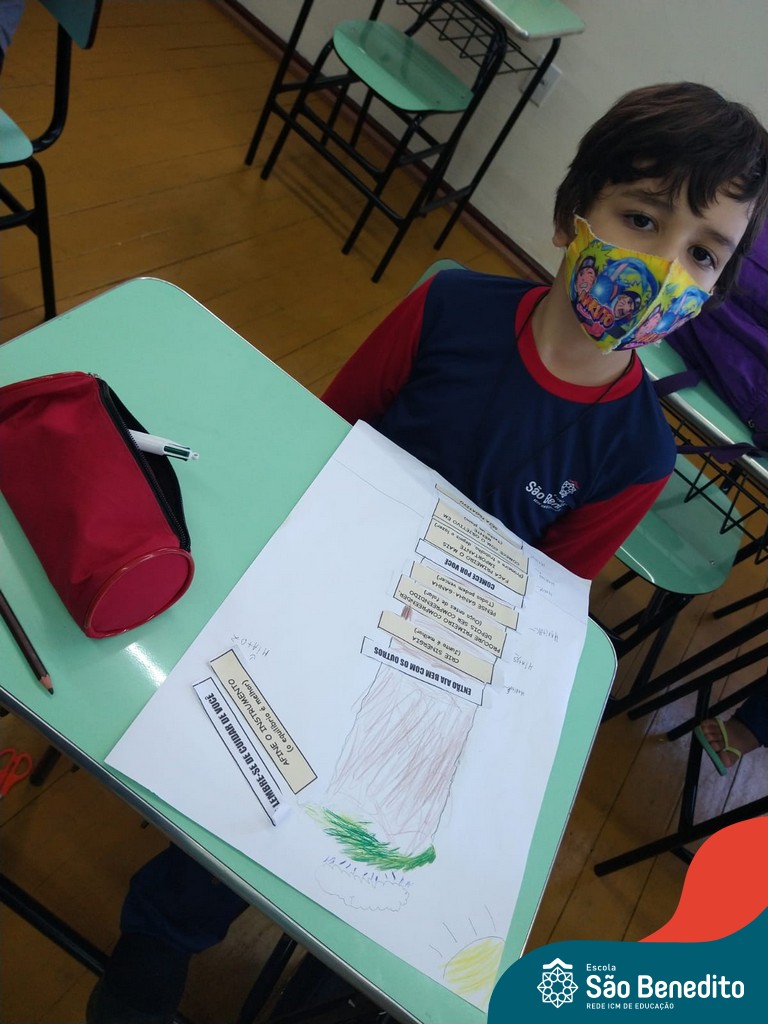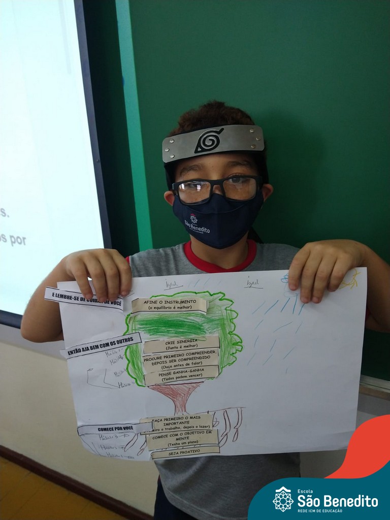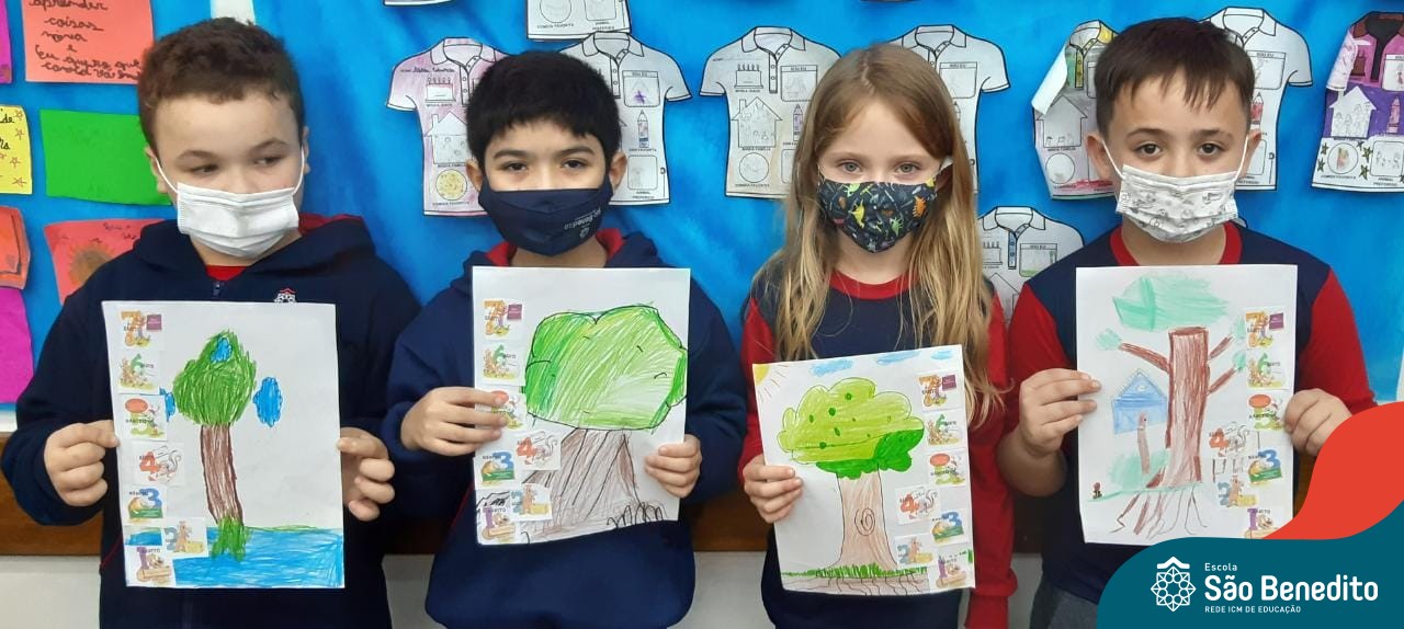Os estudantes do 1º ao 5º Ano construíram a Árvore dos 7 hábitos da criança feliz, que oportuniza a construção de uma boa comunicação, criando uma linguagem comum e envolvendo os colegas, professores e família.