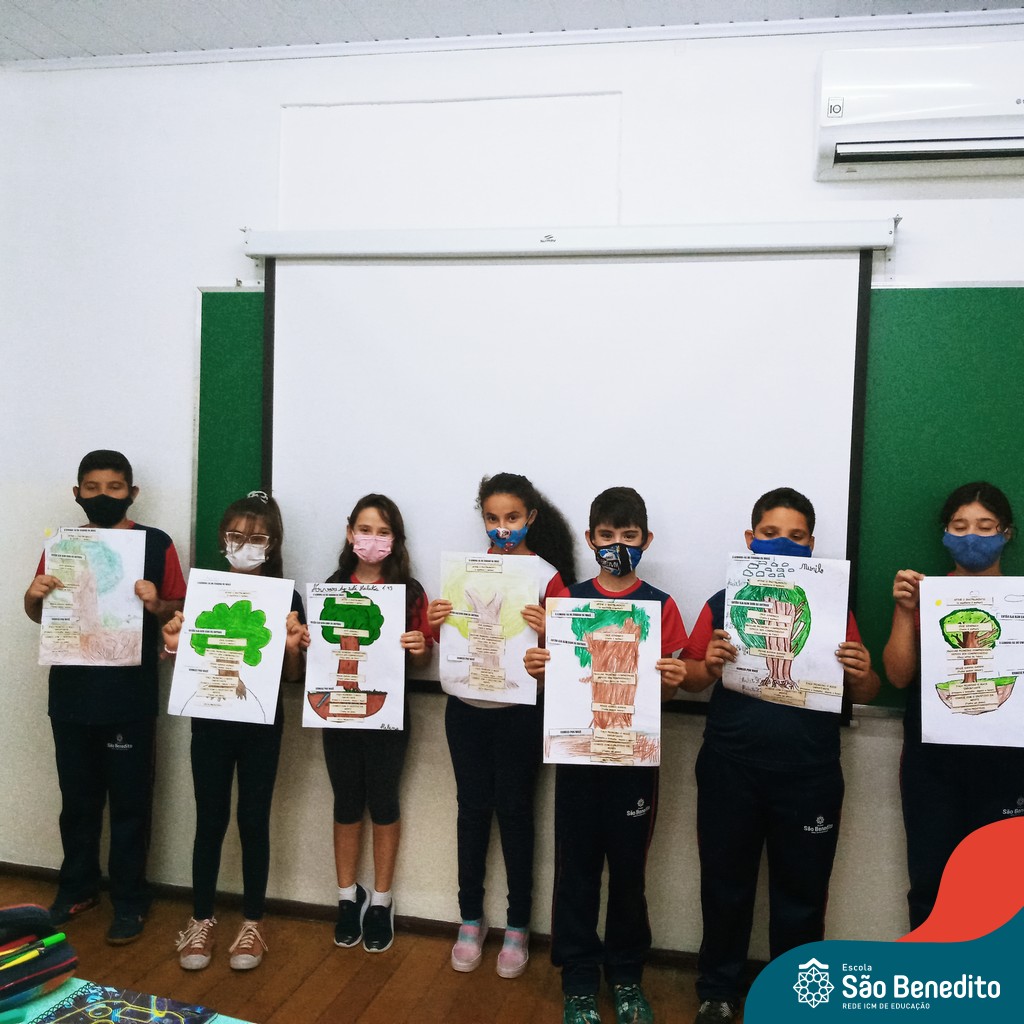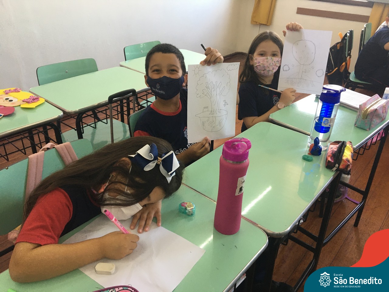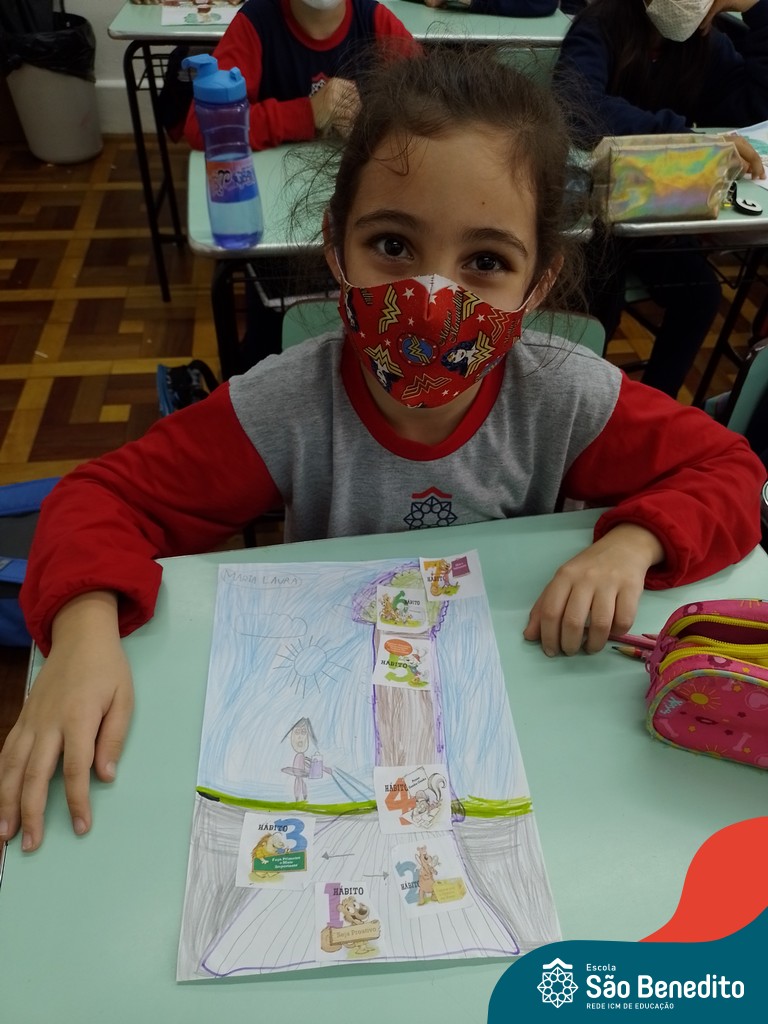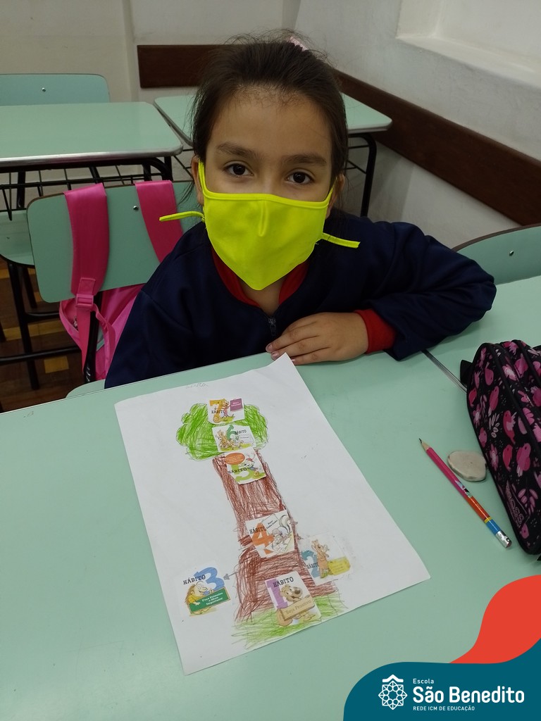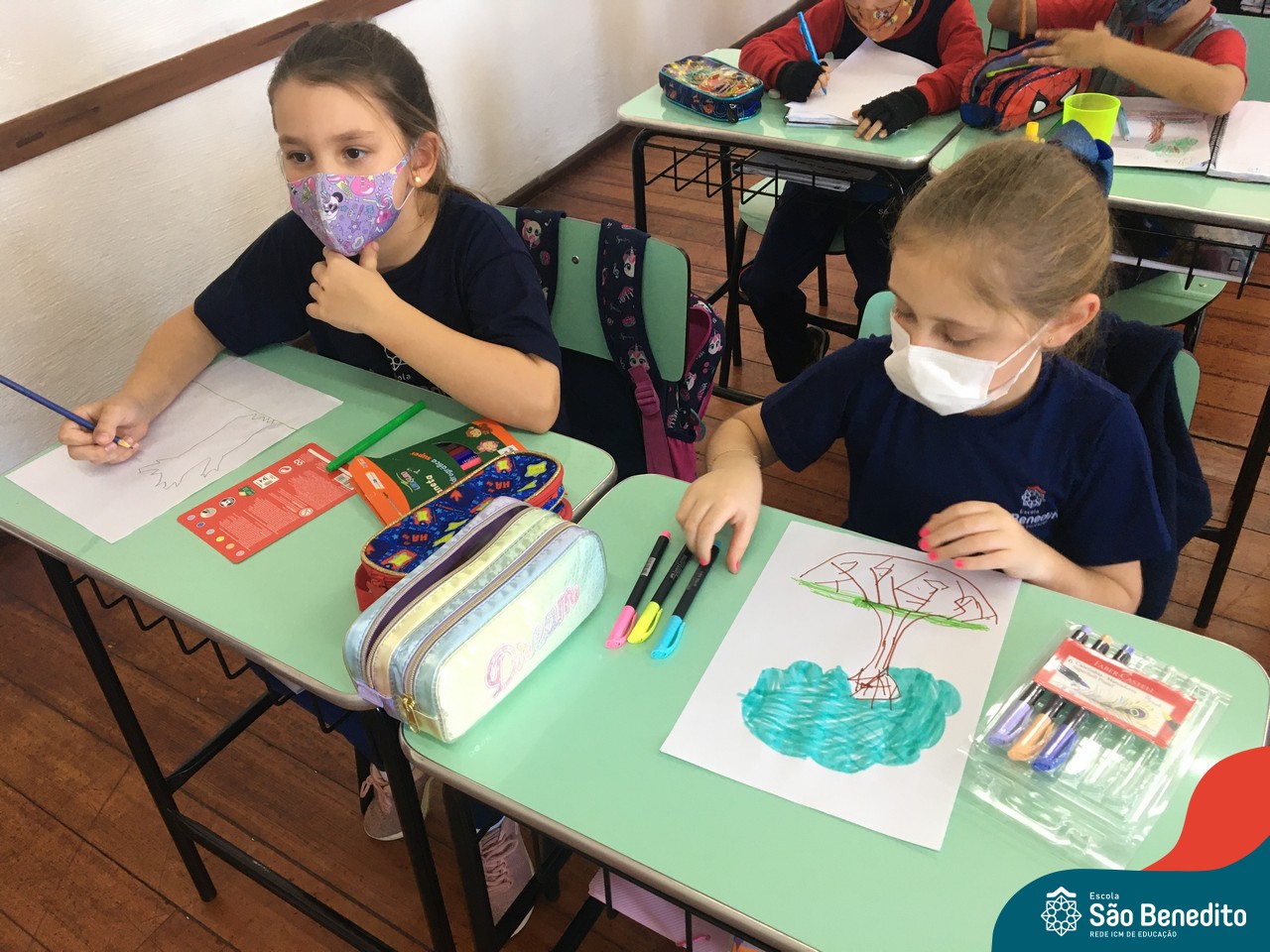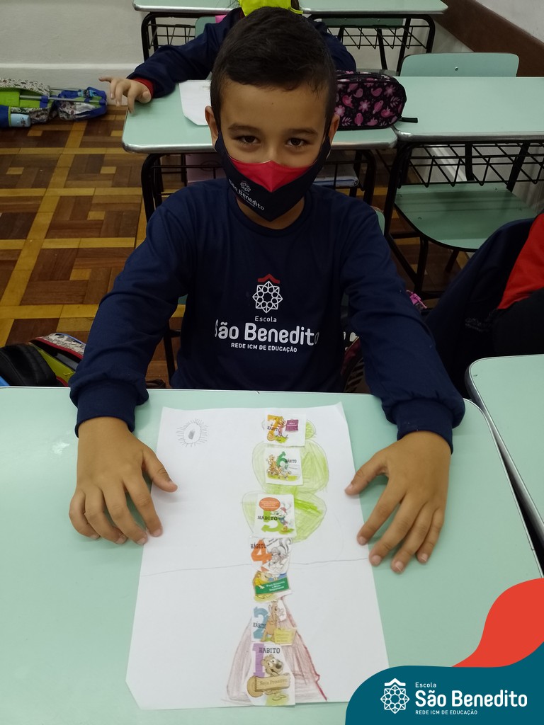 Os estudantes do 1º ao 5º Ano construíram a Árvore dos 7 hábitos da criança feliz, que oportuniza a construção de uma boa comunicação, criando uma linguagem comum e envolvendo os colegas, professores e família.