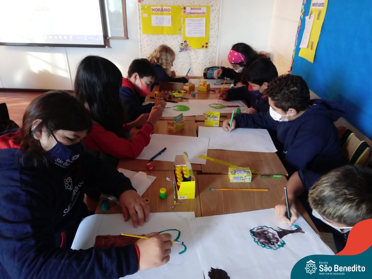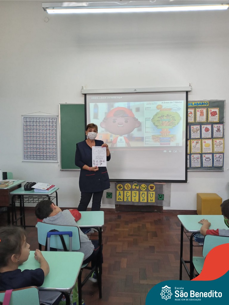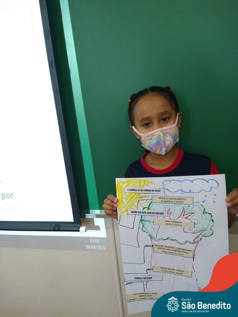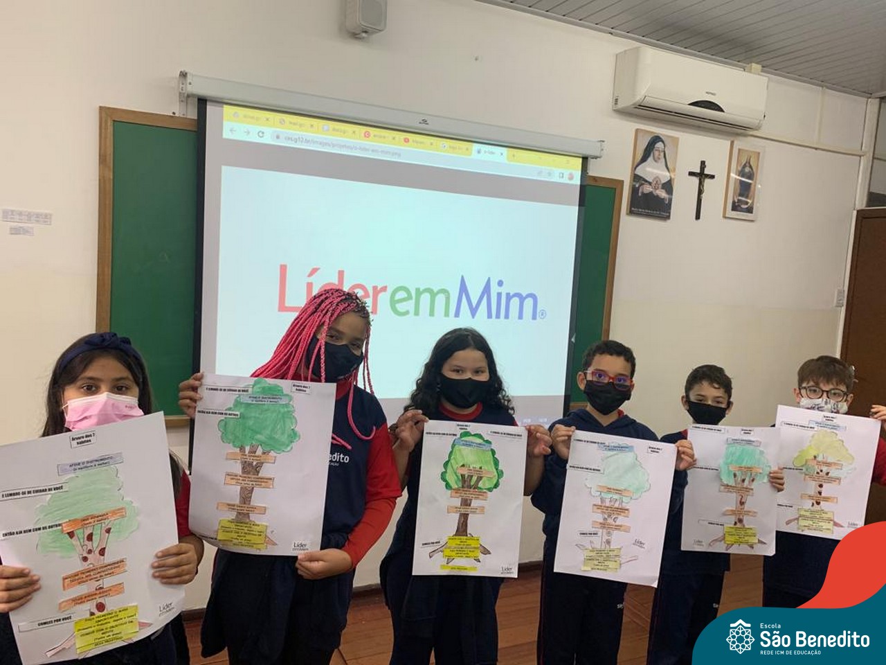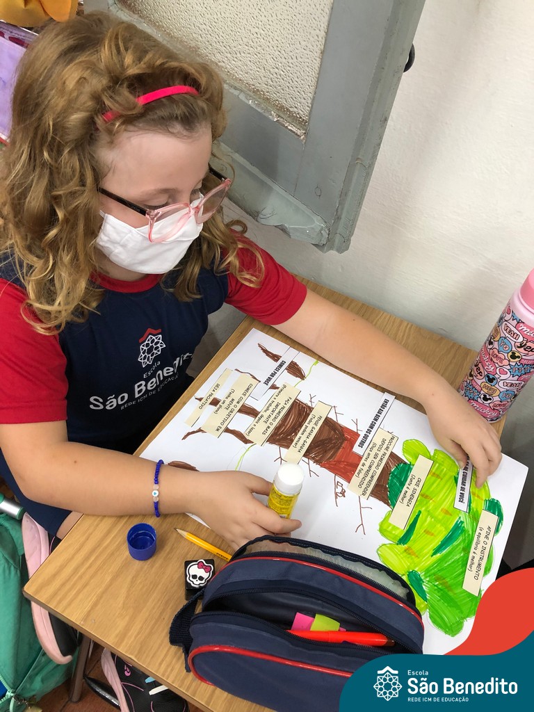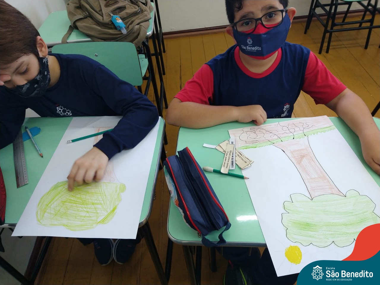 Os estudantes do 1º ao 5º Ano construíram a Árvore dos 7 hábitos da criança feliz, que oportuniza a construção de uma boa comunicação, criando uma linguagem comum e envolvendo os colegas, professores e família.