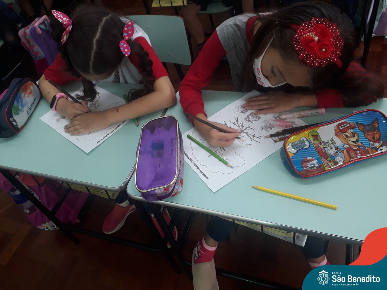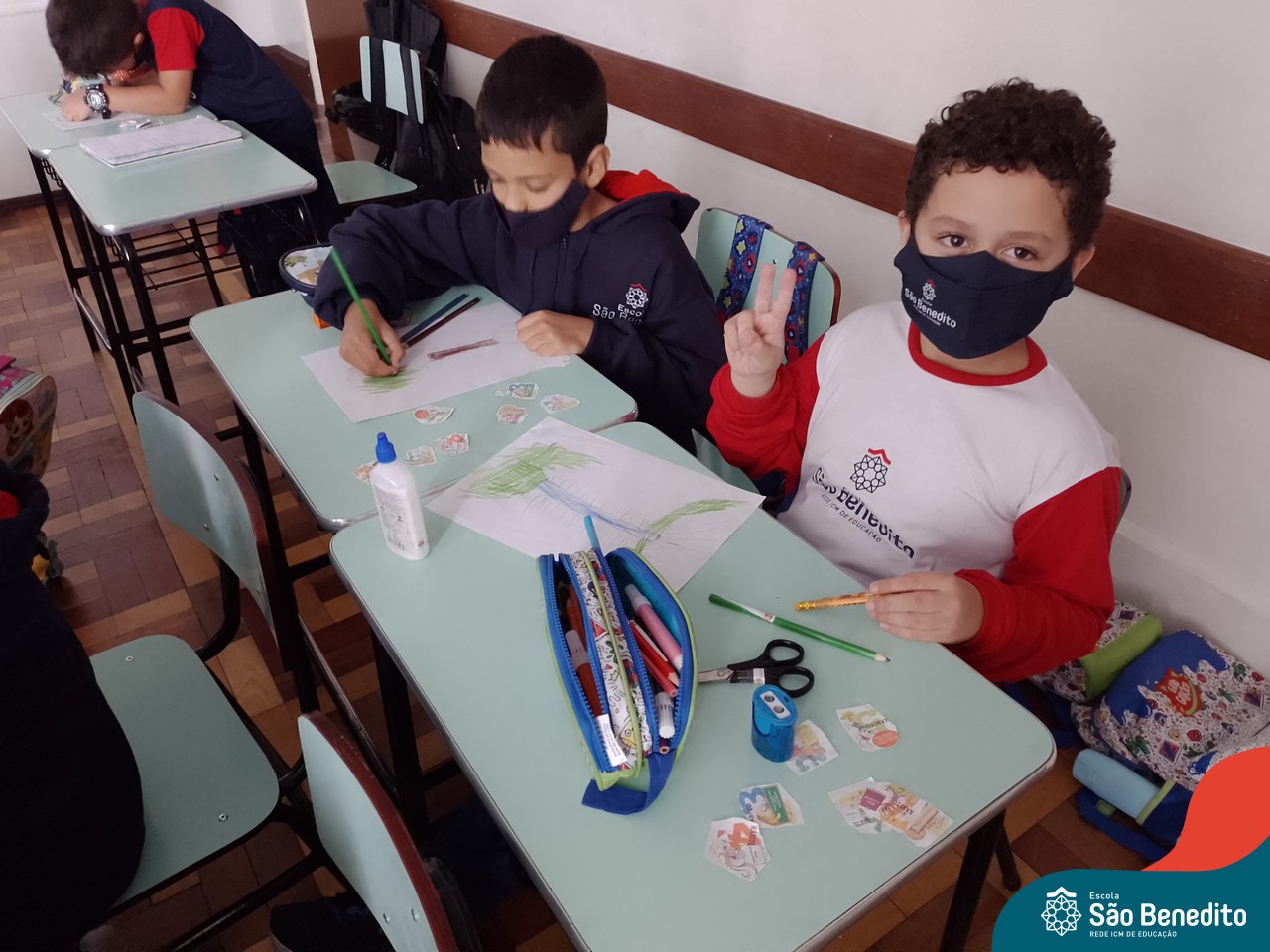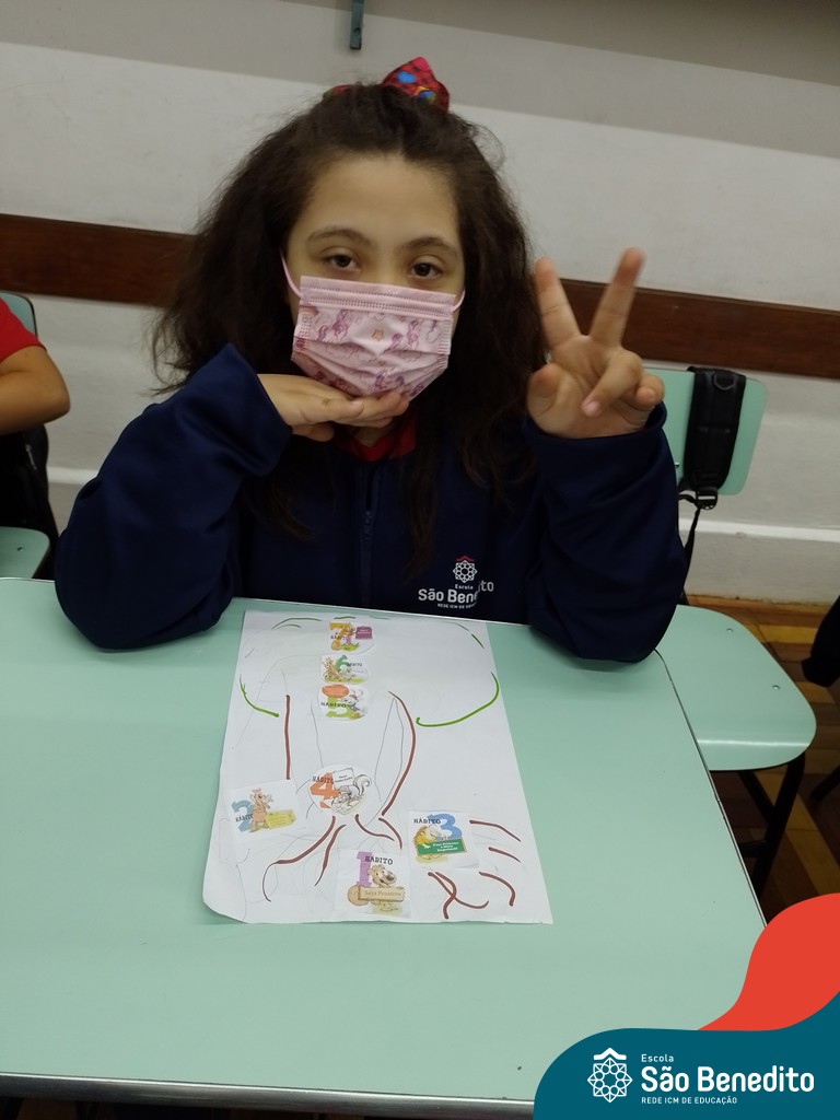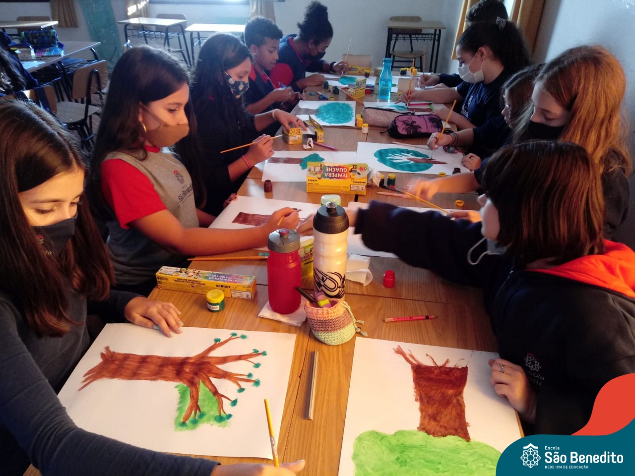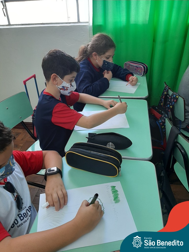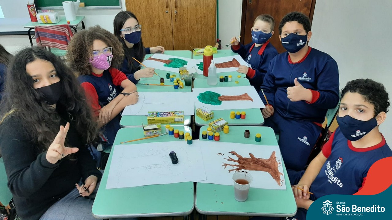 Os estudantes do 1º ao 5º Ano construíram a Árvore dos 7 hábitos da criança feliz, que oportuniza a construção de uma boa comunicação, criando uma linguagem comum e envolvendo os colegas, professores e família.