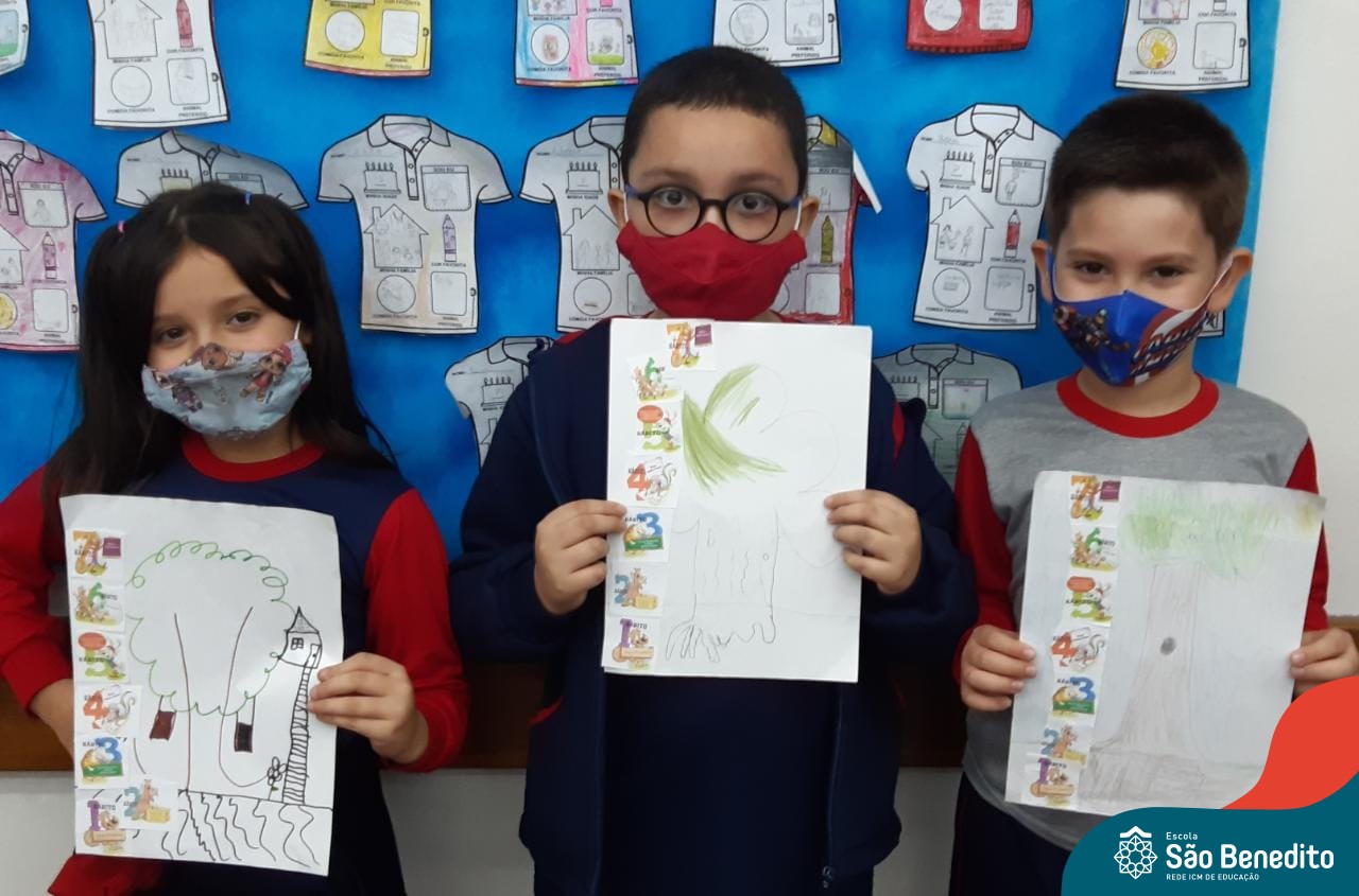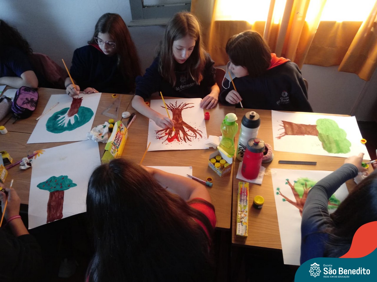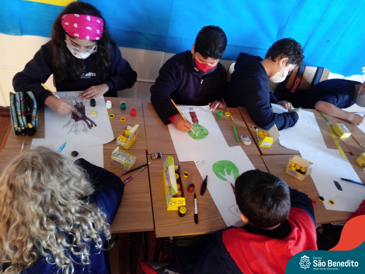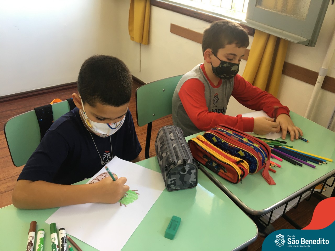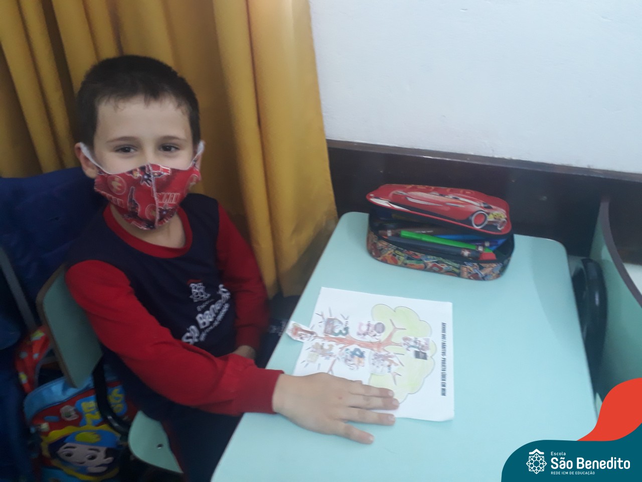 Os estudantes do 1º ao 5º Ano construíram a Árvore dos 7 hábitos da criança feliz, que oportuniza a construção de uma boa comunicação, criando uma linguagem comum e envolvendo os colegas, professores e família.