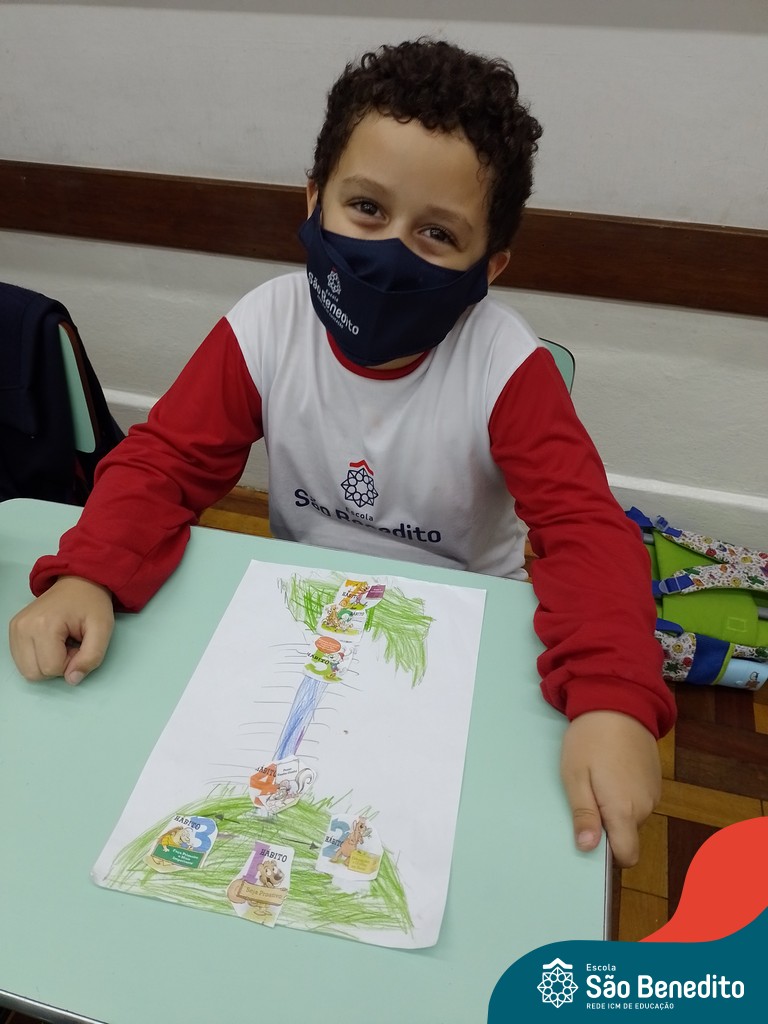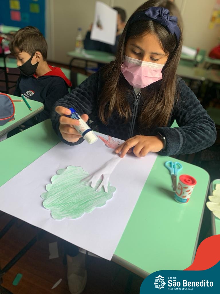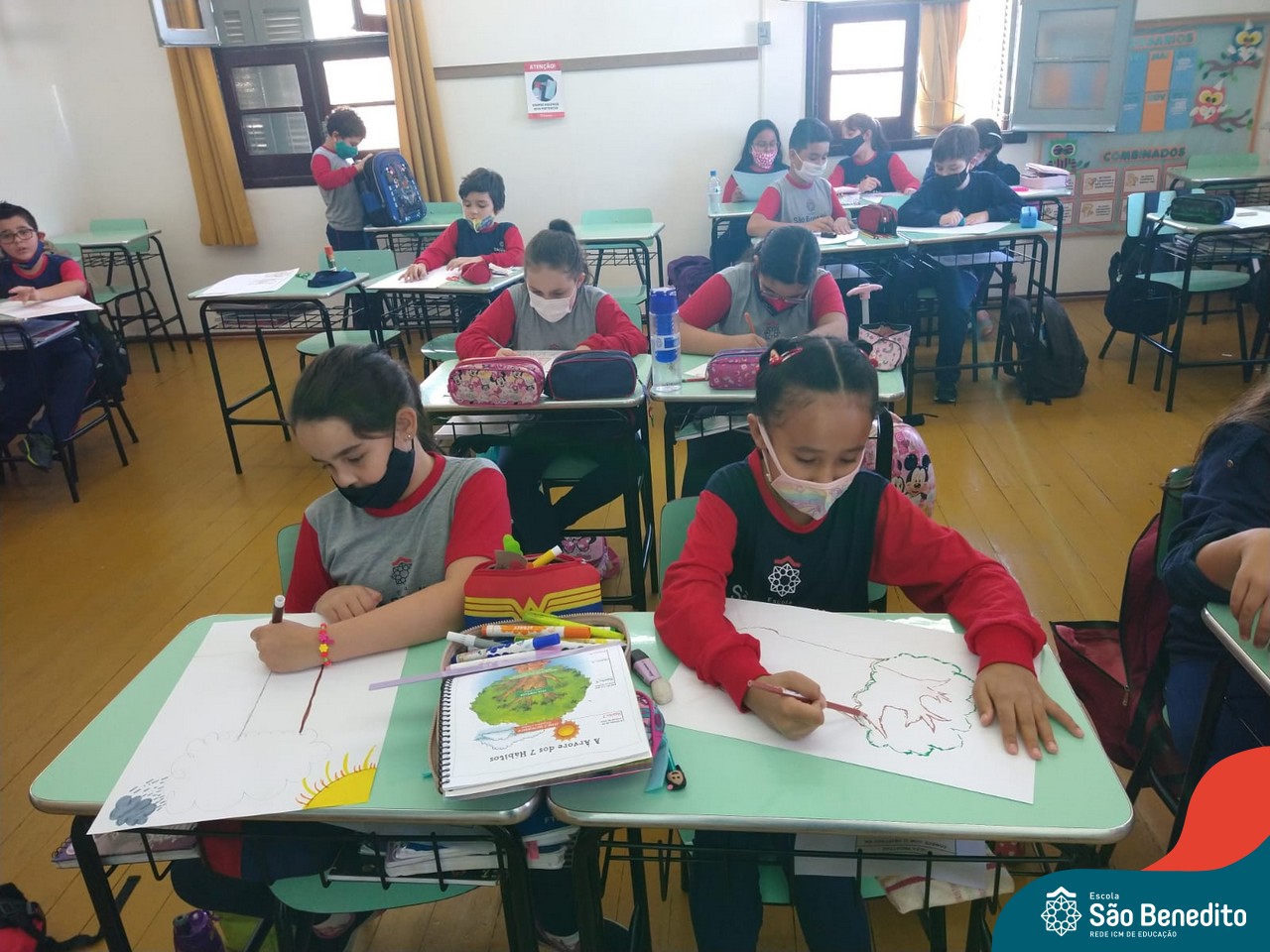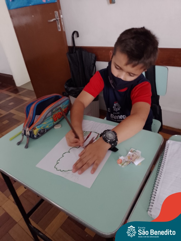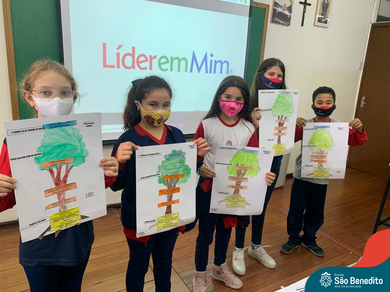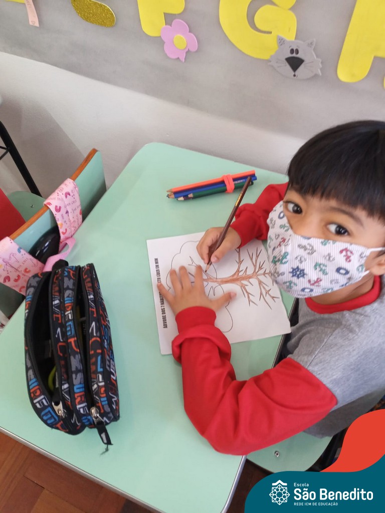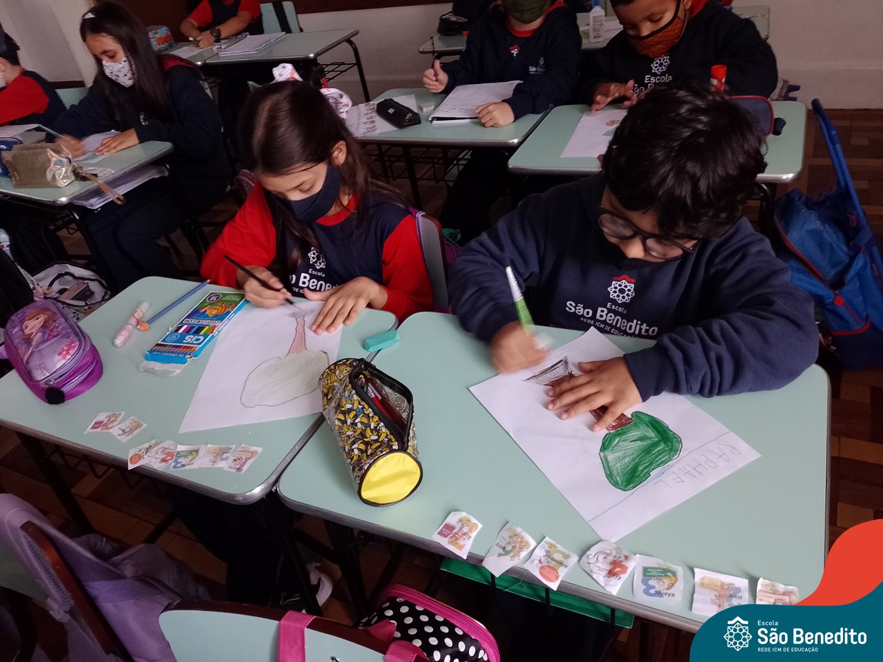 Os estudantes do 1º ao 5º Ano construíram a Árvore dos 7 hábitos da criança feliz, que oportuniza a construção de uma boa comunicação, criando uma linguagem comum e envolvendo os colegas, professores e família.