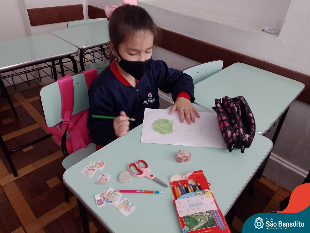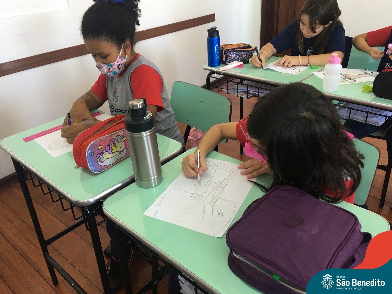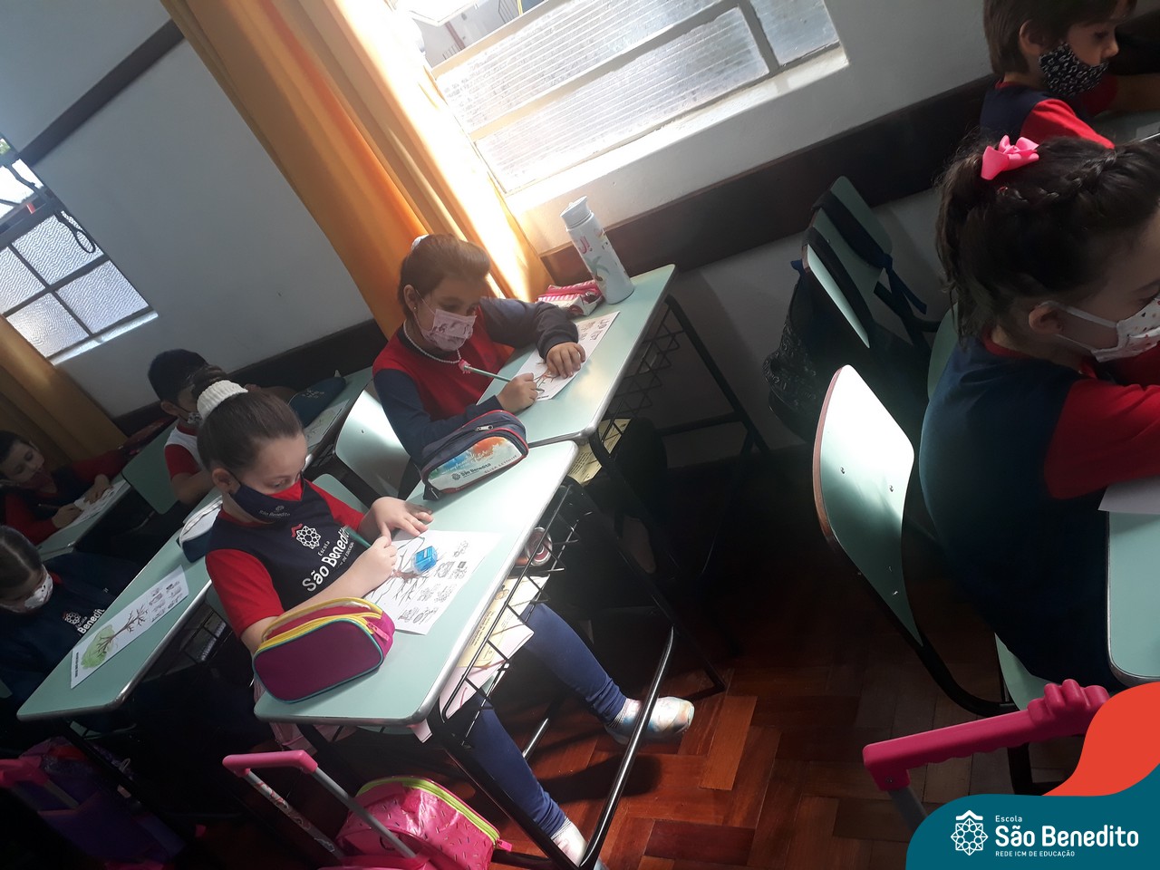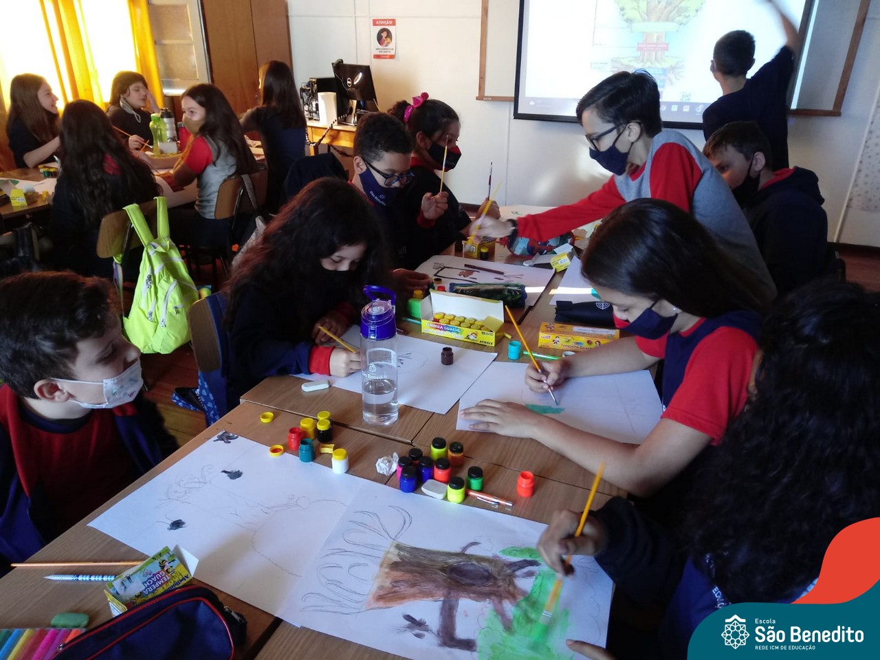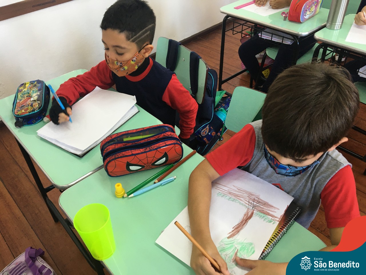 Os estudantes do 1º ao 5º Ano construíram a Árvore dos 7 hábitos da criança feliz, que oportuniza a construção de uma boa comunicação, criando uma linguagem comum e envolvendo os colegas, professores e família.