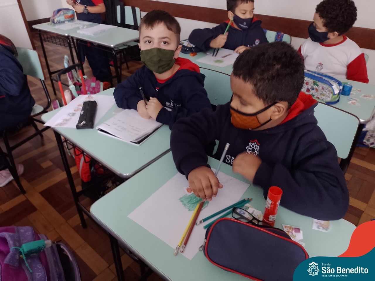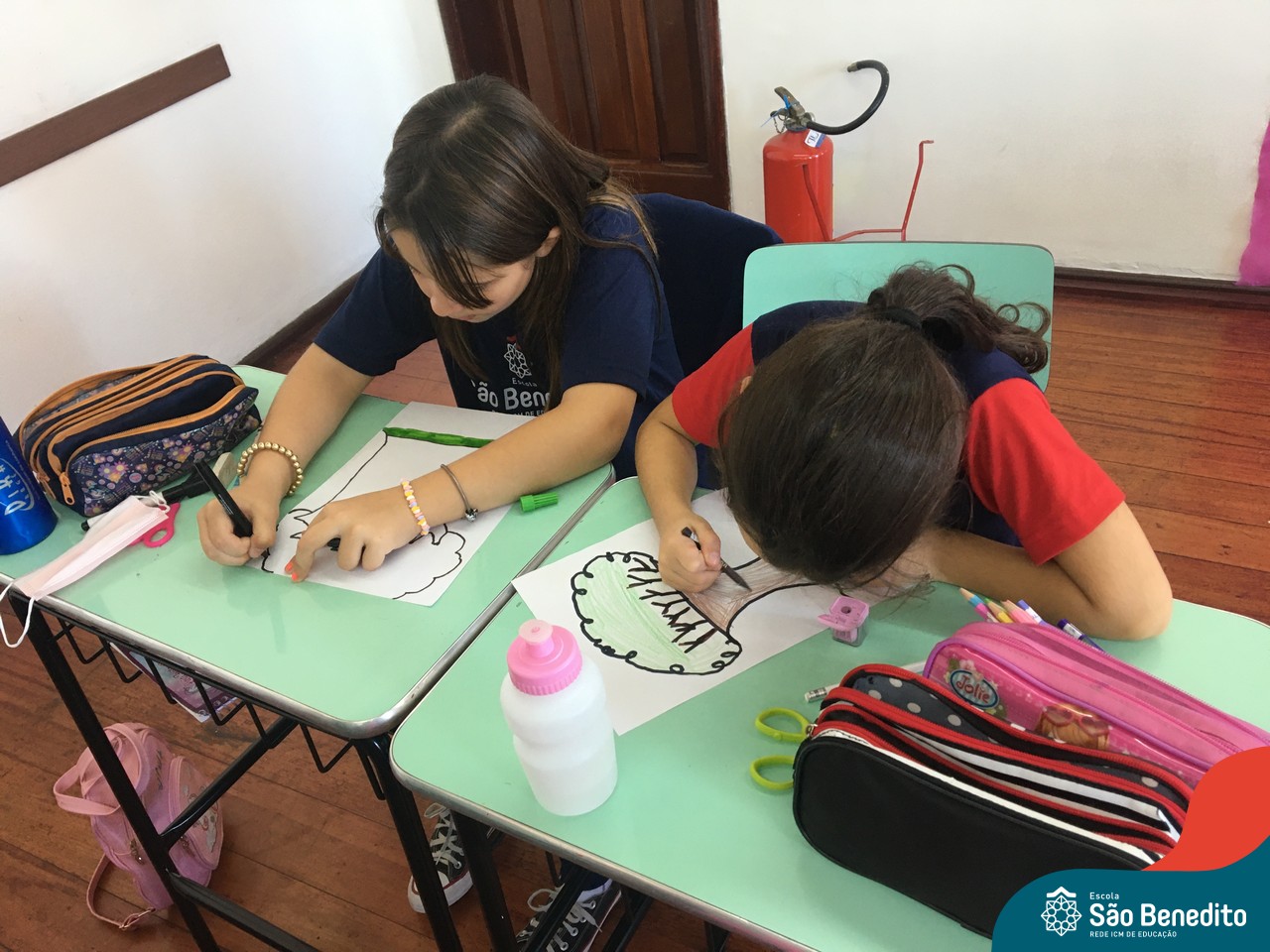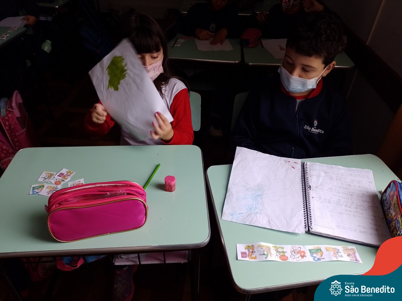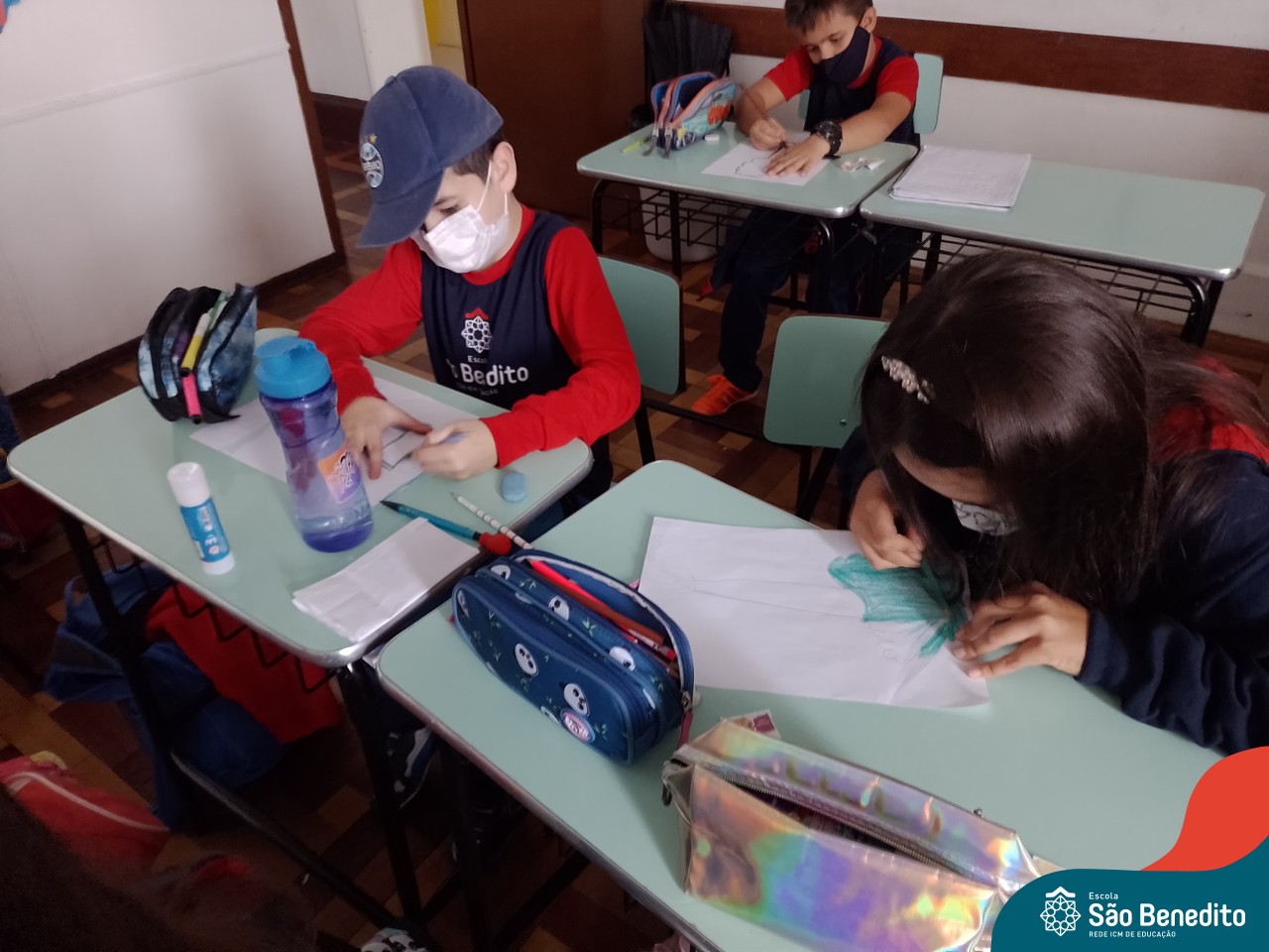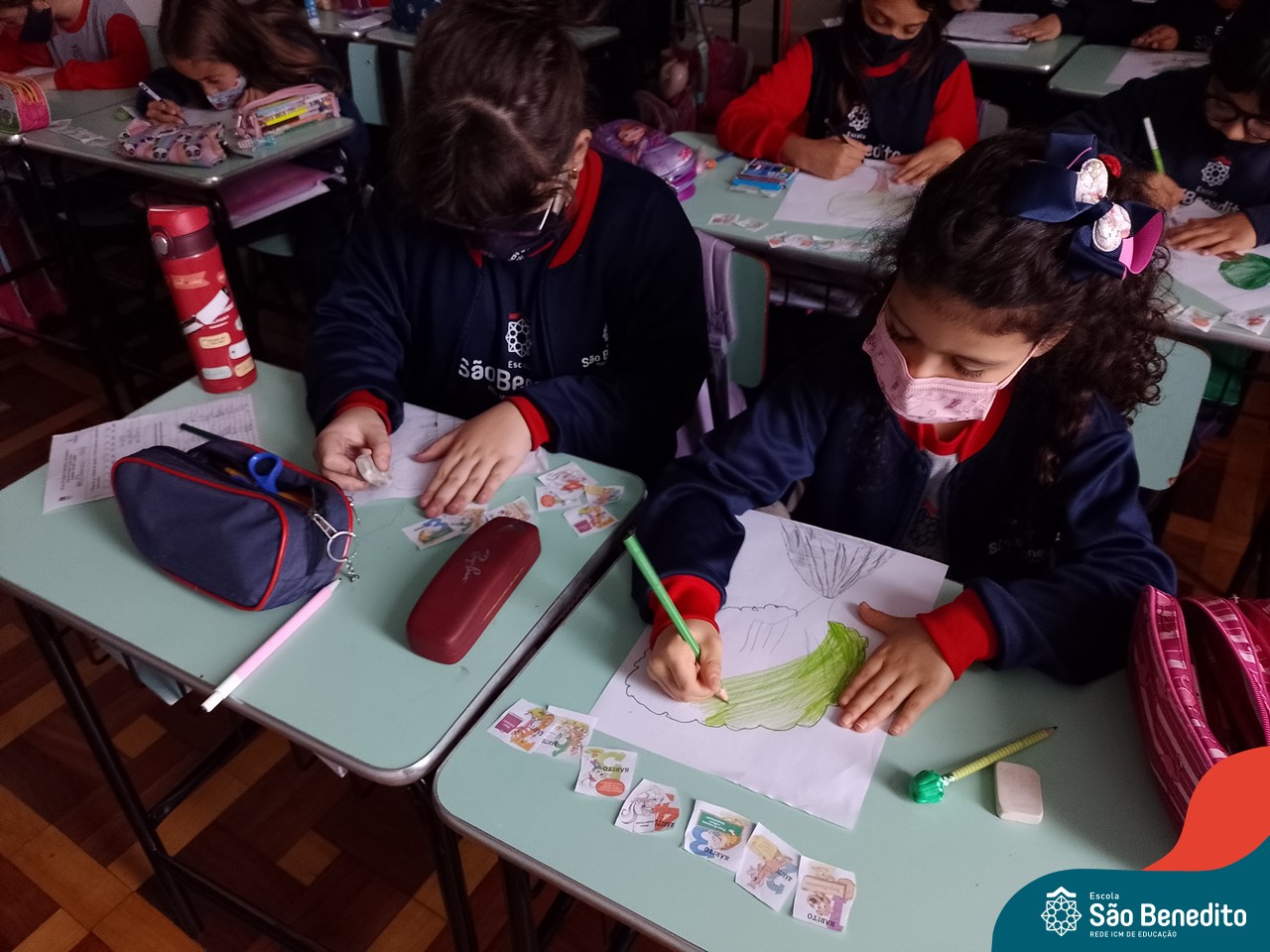 Os estudantes do 1º ao 5º Ano construíram a Árvore dos 7 hábitos da criança feliz, que oportuniza a construção de uma boa comunicação, criando uma linguagem comum e envolvendo os colegas, professores e família.