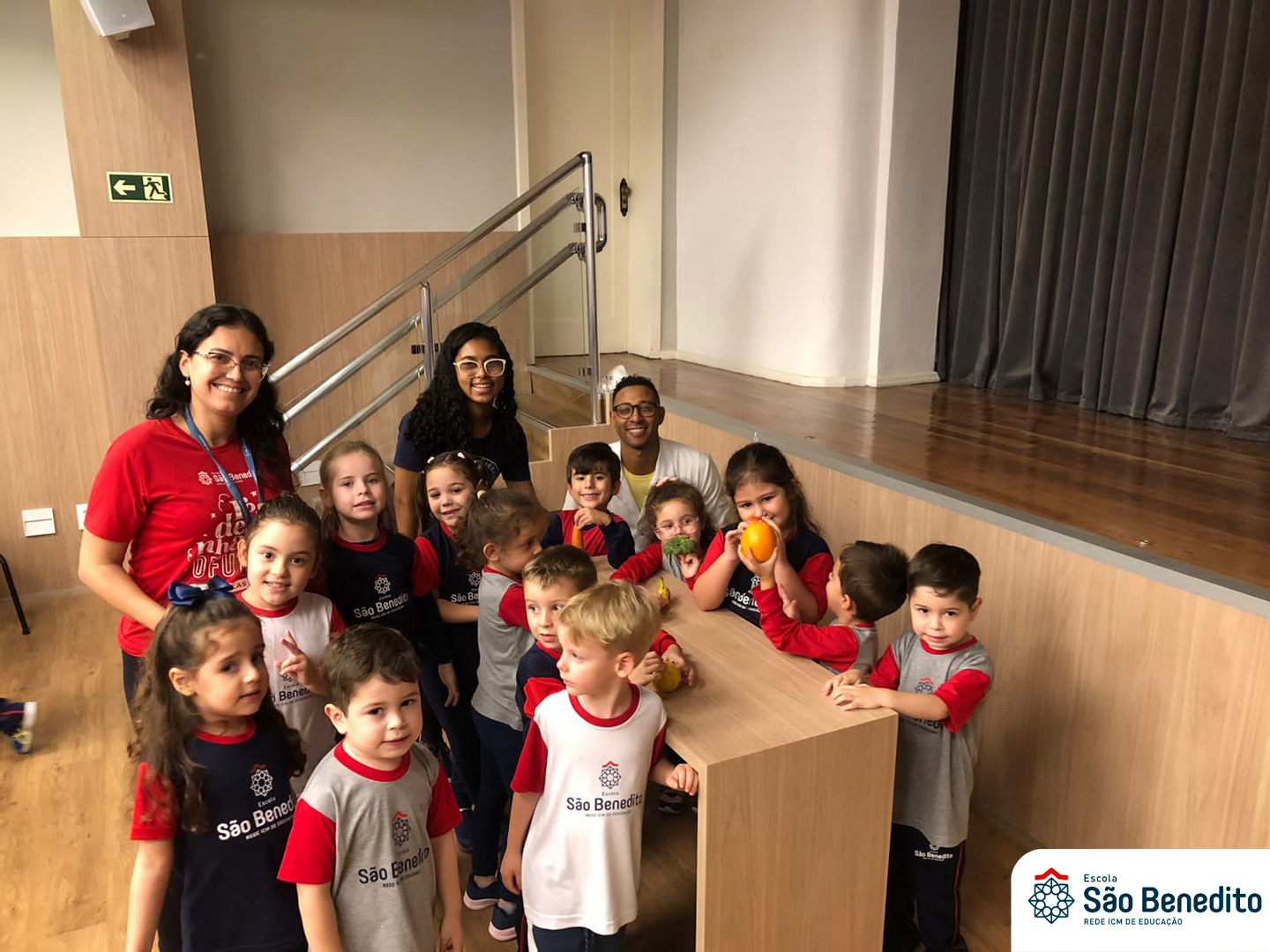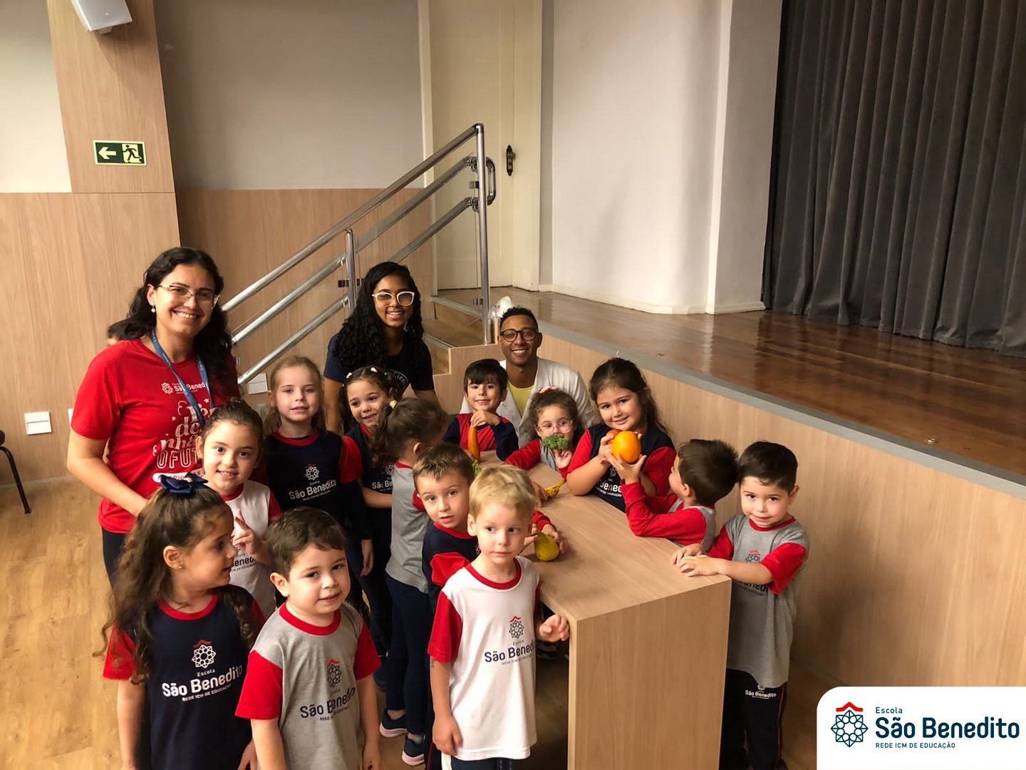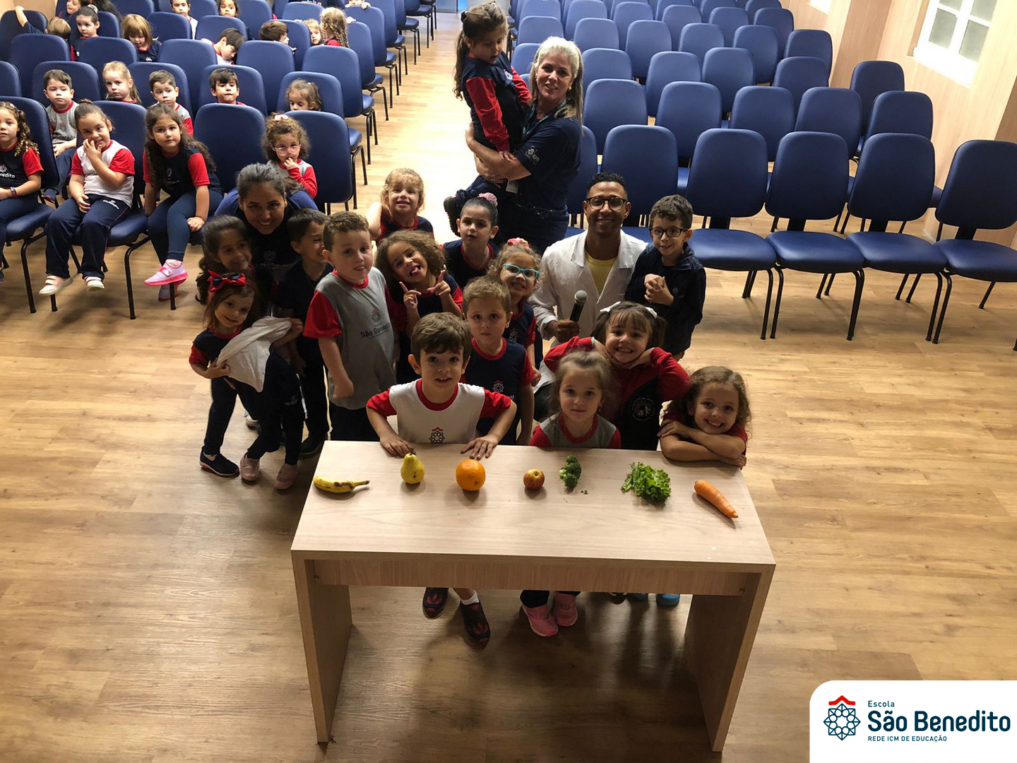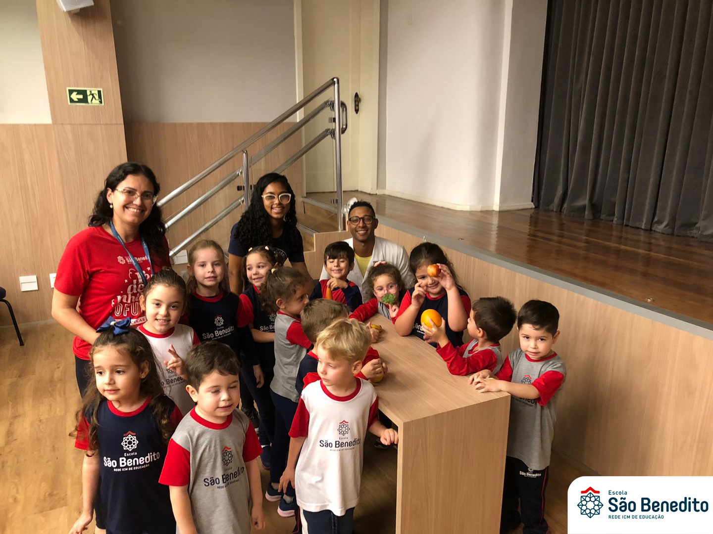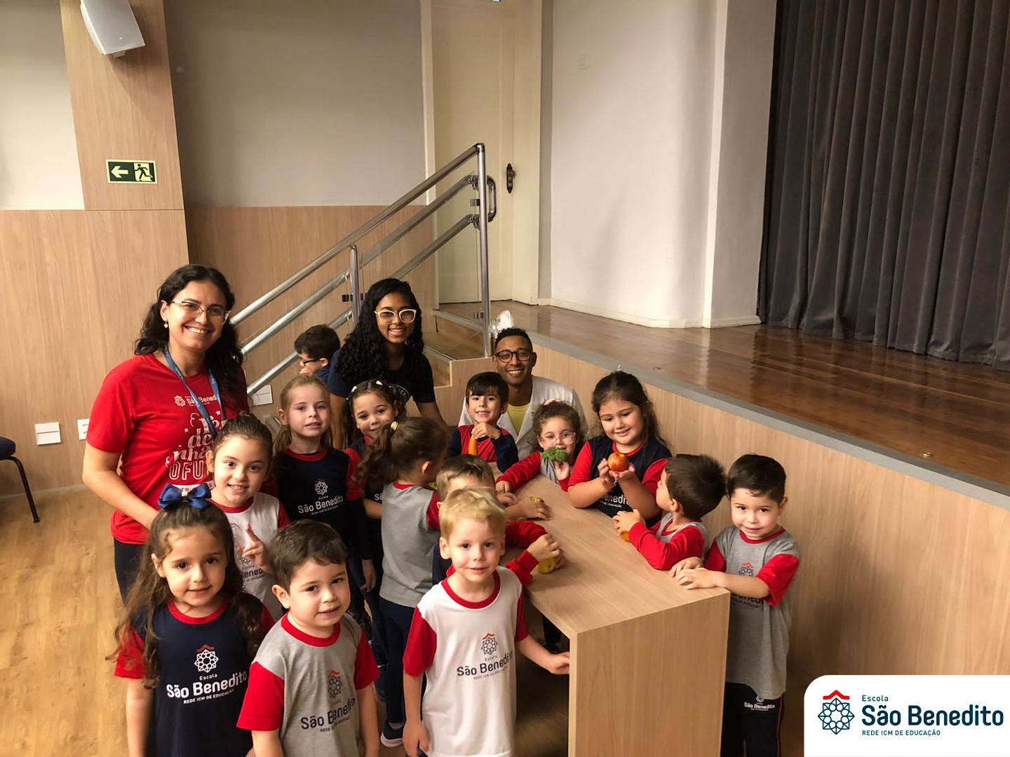 Foi pensando em promover um aprendizado significativo sobre o assunto, que as educadoras do Pré I, Alessandra, Simone e Tieise, junto de seus alunos, participaram de uma conversa com o nutricionista Ranieri Valente, que plantou na vida de cada um, a sementinha da importância de se alimentar de forma equilibrada.