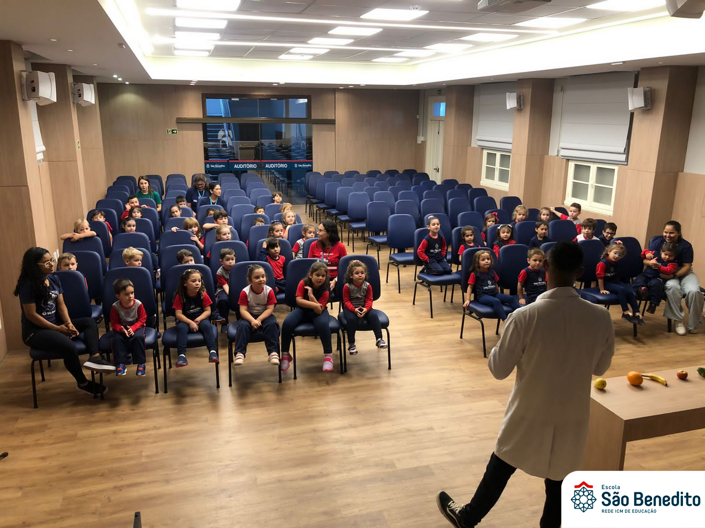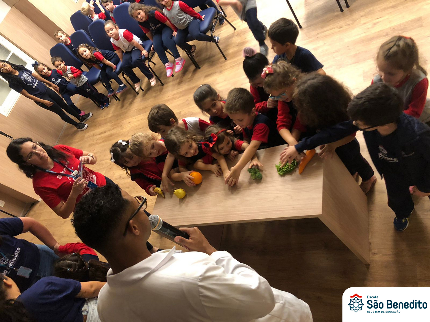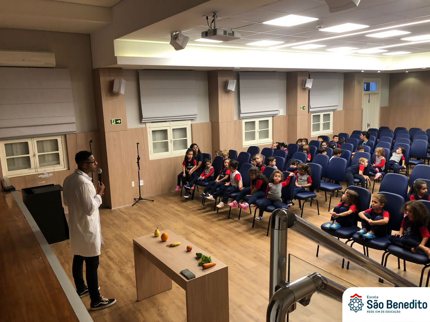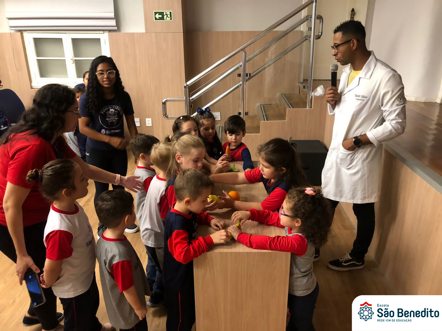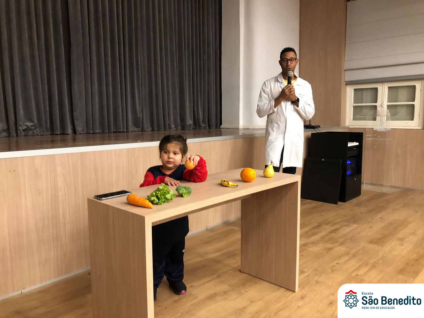 Foi pensando em promover um aprendizado significativo sobre o assunto, que as educadoras do Pré I, Alessandra, Simone e Tieise, junto de seus alunos, participaram de uma conversa com o nutricionista Ranieri Valente, que plantou na vida de cada um, a sementinha da importância de se alimentar de forma equilibrada.