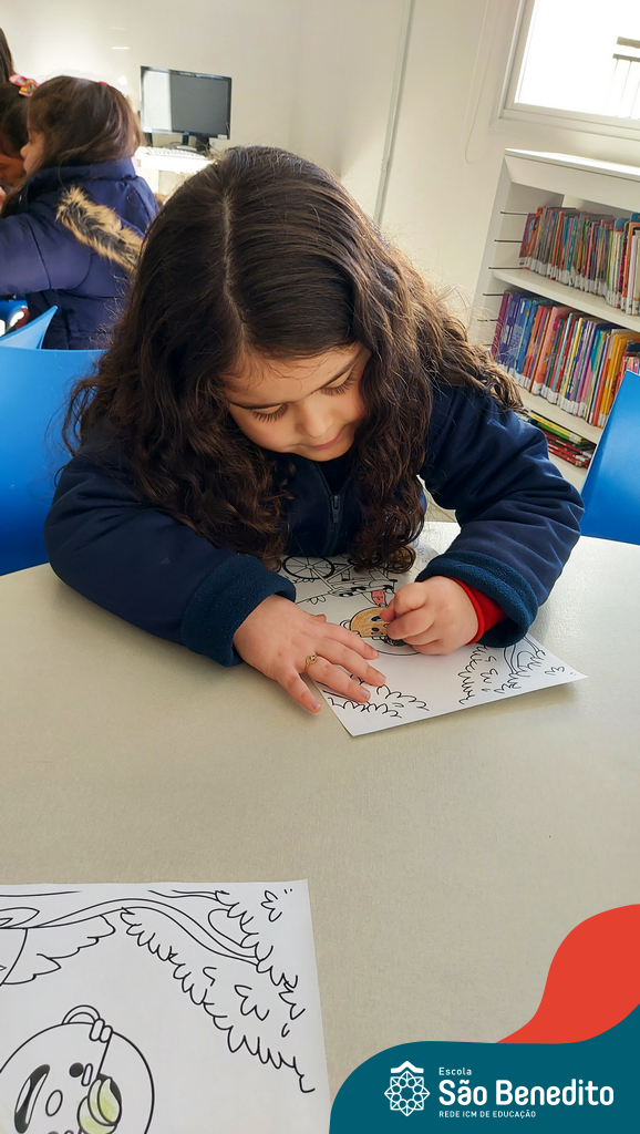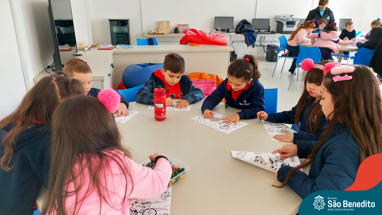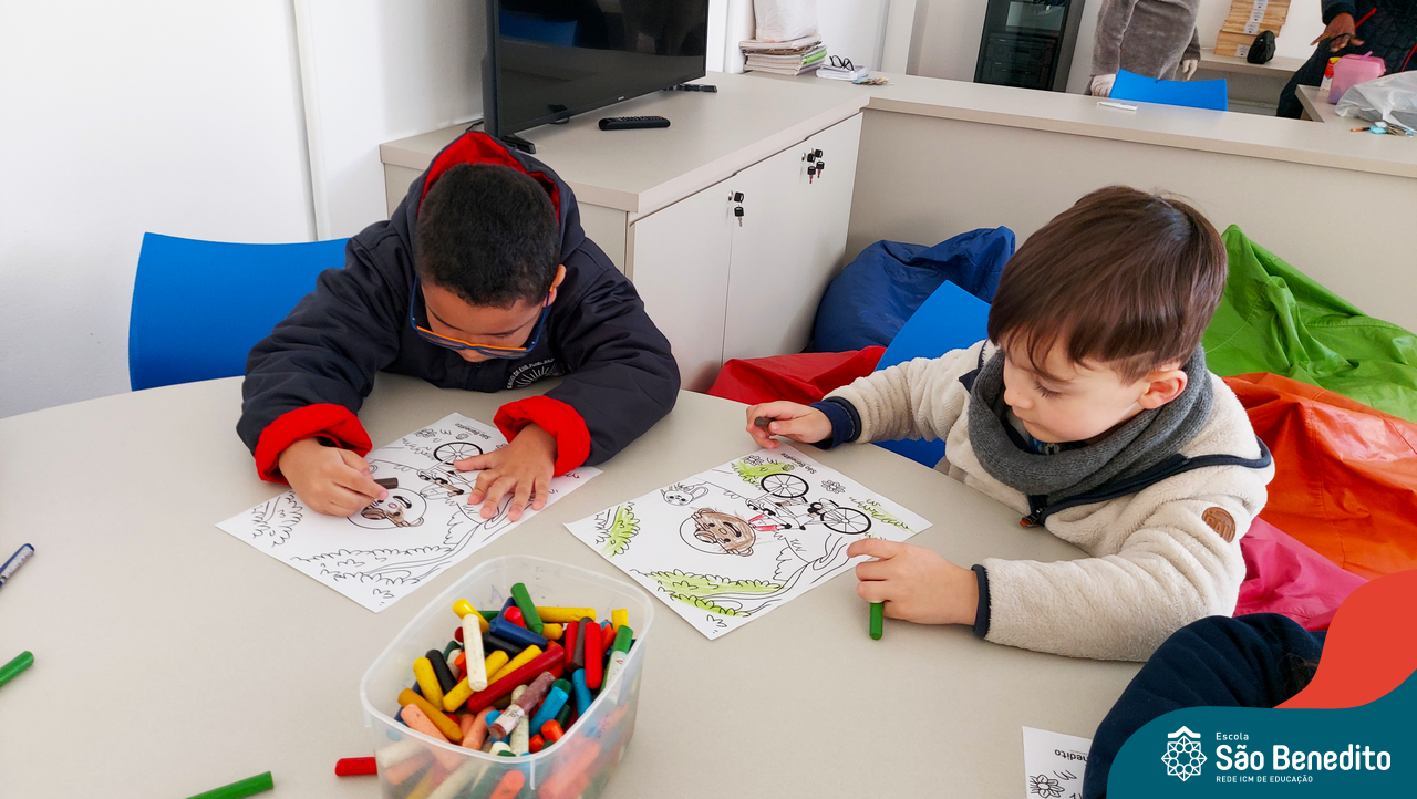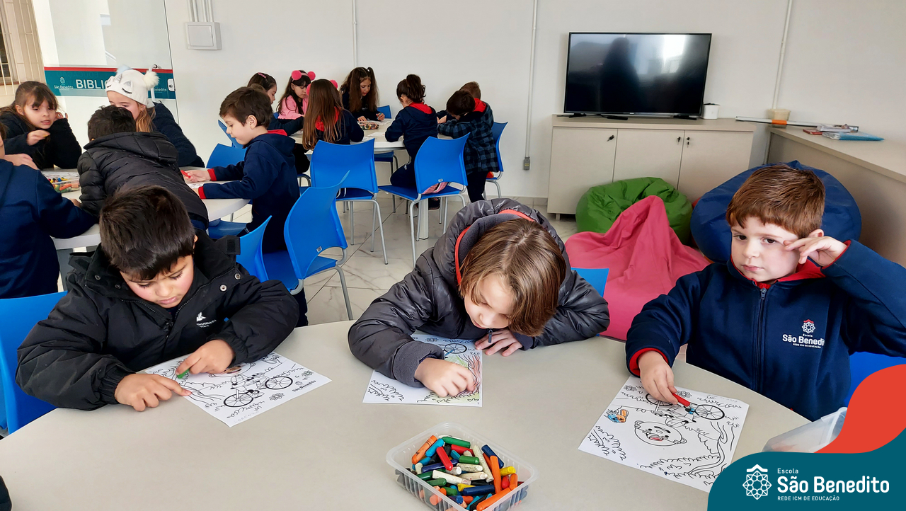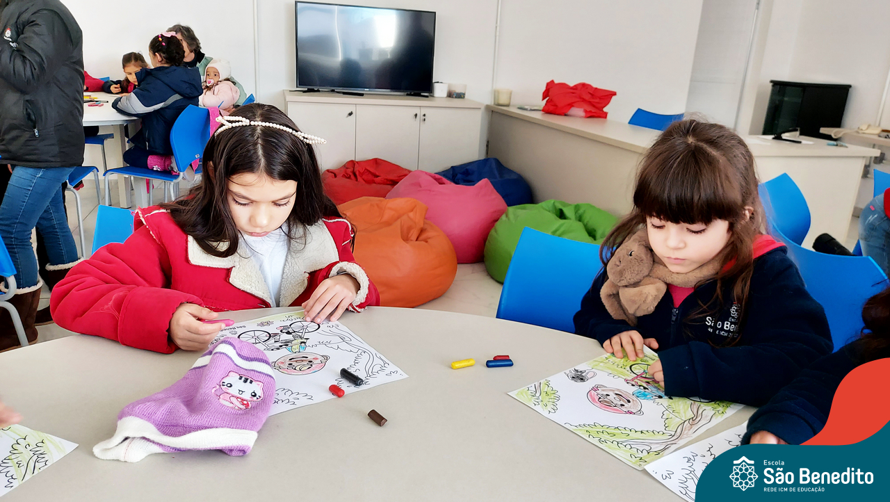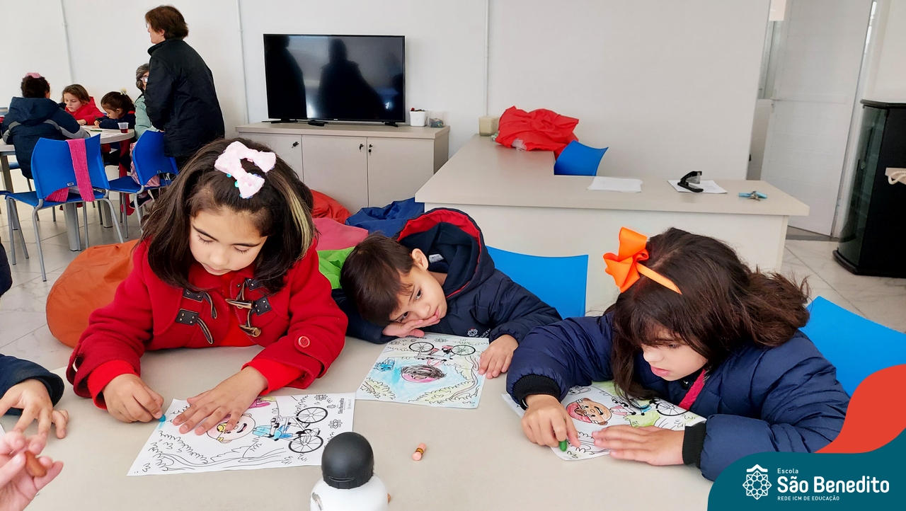 Além disso, as crianças puderam pintar o desenho do novo amigo Bene, que fez alusão ao incentivo da prática de esportes e da vida saudável, e dar aquela paradinha para descansar e fazer um lanchinho para recarregar as baterias para os próximos destinos dessa tarde cheia de aventuras: uma aula de música cheia de alegria, com a professora Lidiane, e direito à experimentação de diferentes instrumentos musicais; um circuito divertidíssimo, montado pela professora de Educação Física, Ane; e brincadeiras na sala de jogos digitais, com ajuda do TI Maiko.