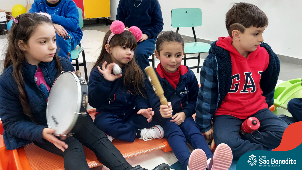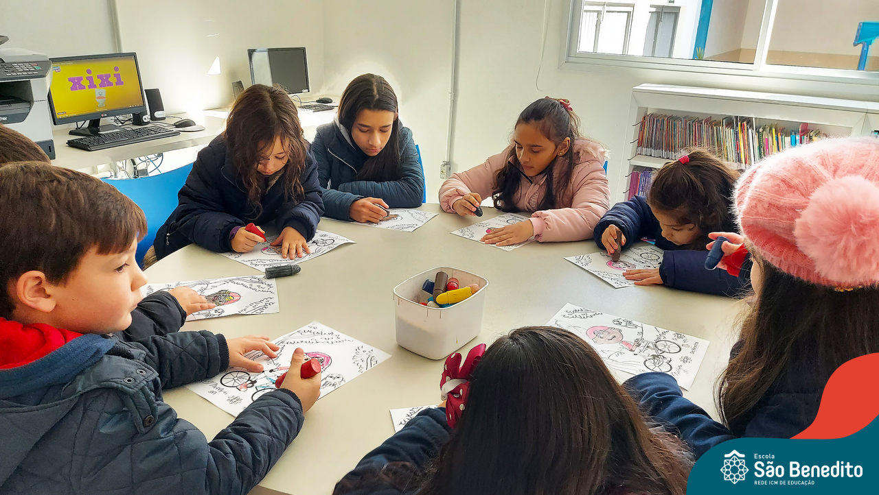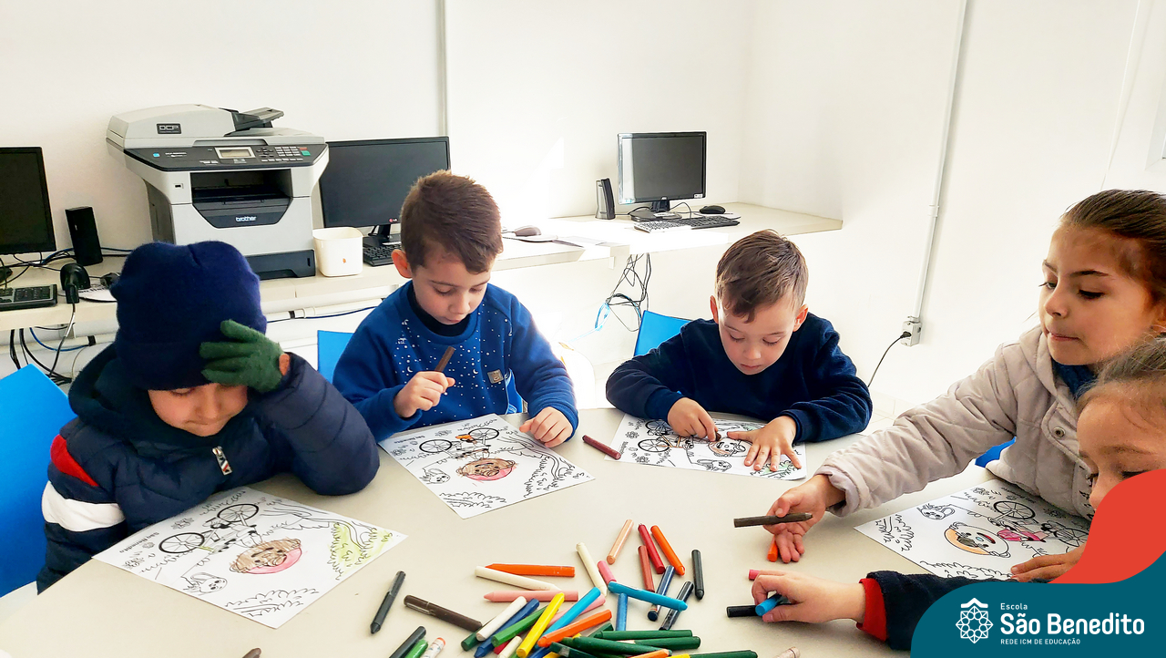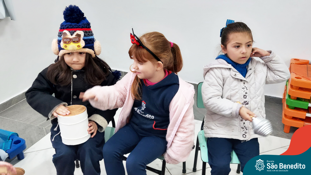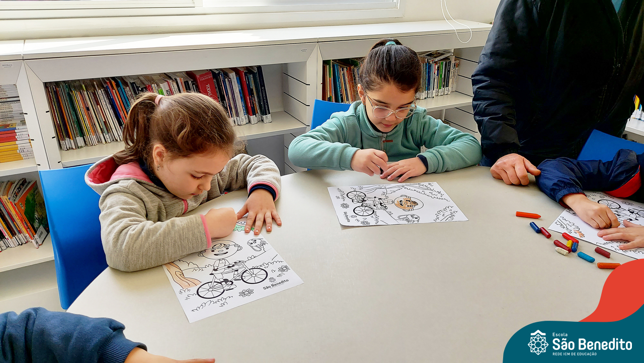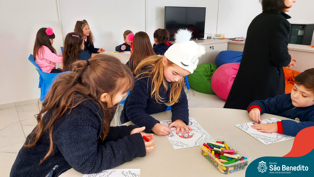 Além disso, as crianças puderam pintar o desenho do novo amigo Bene, que fez alusão ao incentivo da prática de esportes e da vida saudável, e dar aquela paradinha para descansar e fazer um lanchinho para recarregar as baterias para os próximos destinos dessa tarde cheia de aventuras: uma aula de música cheia de alegria, com a professora Lidiane, e direito à experimentação de diferentes instrumentos musicais; um circuito divertidíssimo, montado pela professora de Educação Física, Ane; e brincadeiras na sala de jogos digitais, com ajuda do TI Maiko.