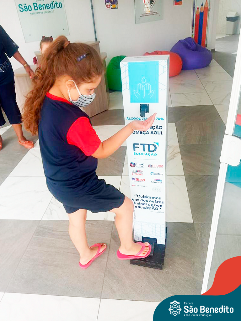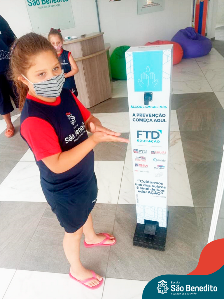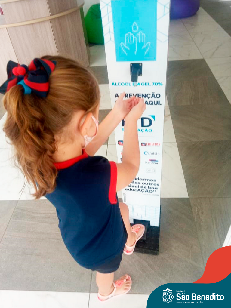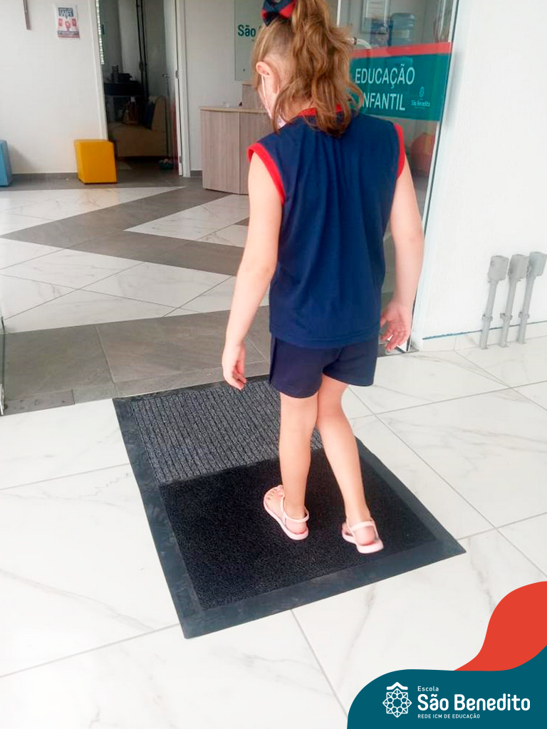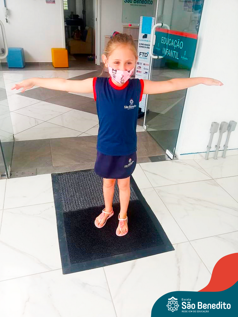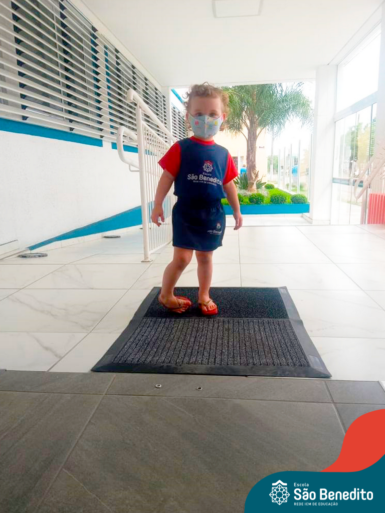 Os alunos foram orientados sobre todos os procedimentos através de atividades lúdicas, e realizaram todos os passos necessários para garantir a segurança e saúde de todos. Contamos com equipamentos de medição de temperatura – ação que, é necessária para que o aluno possa entrar na Escola, tapetes sanitizantes para a limpeza eficaz dos sapatos, totens de álcool distribuídos pela Escola (e também frascos nas salas de aula), sinalização por todo o prédio, e também, monitores, que reforçam a segurança a todo momento.