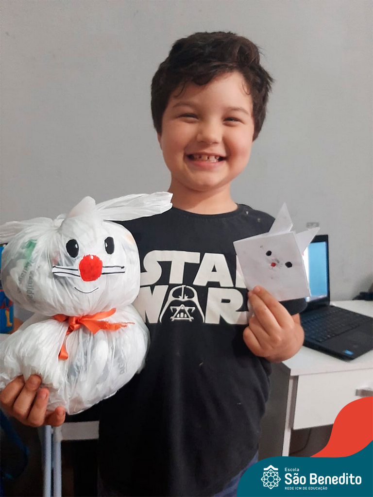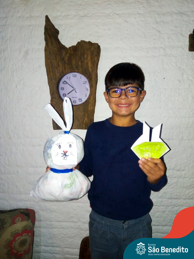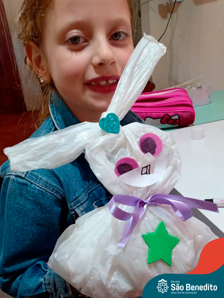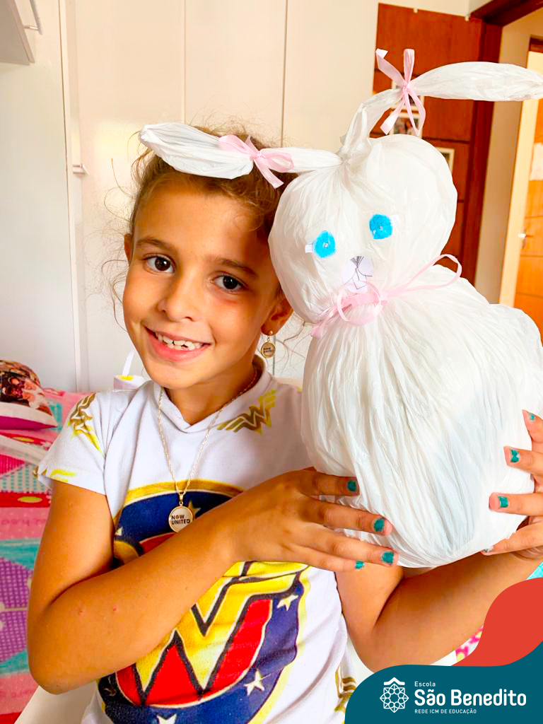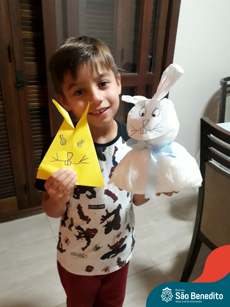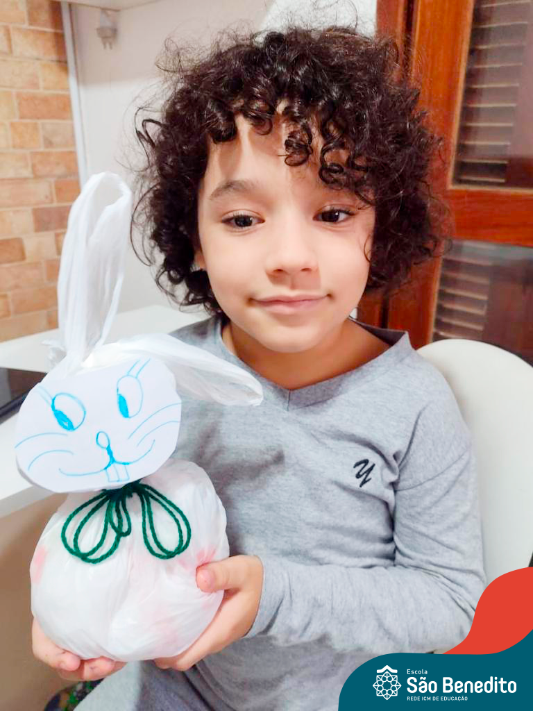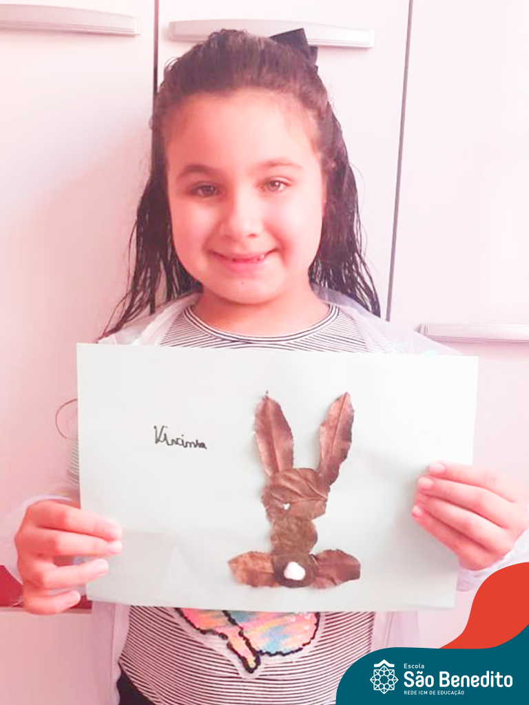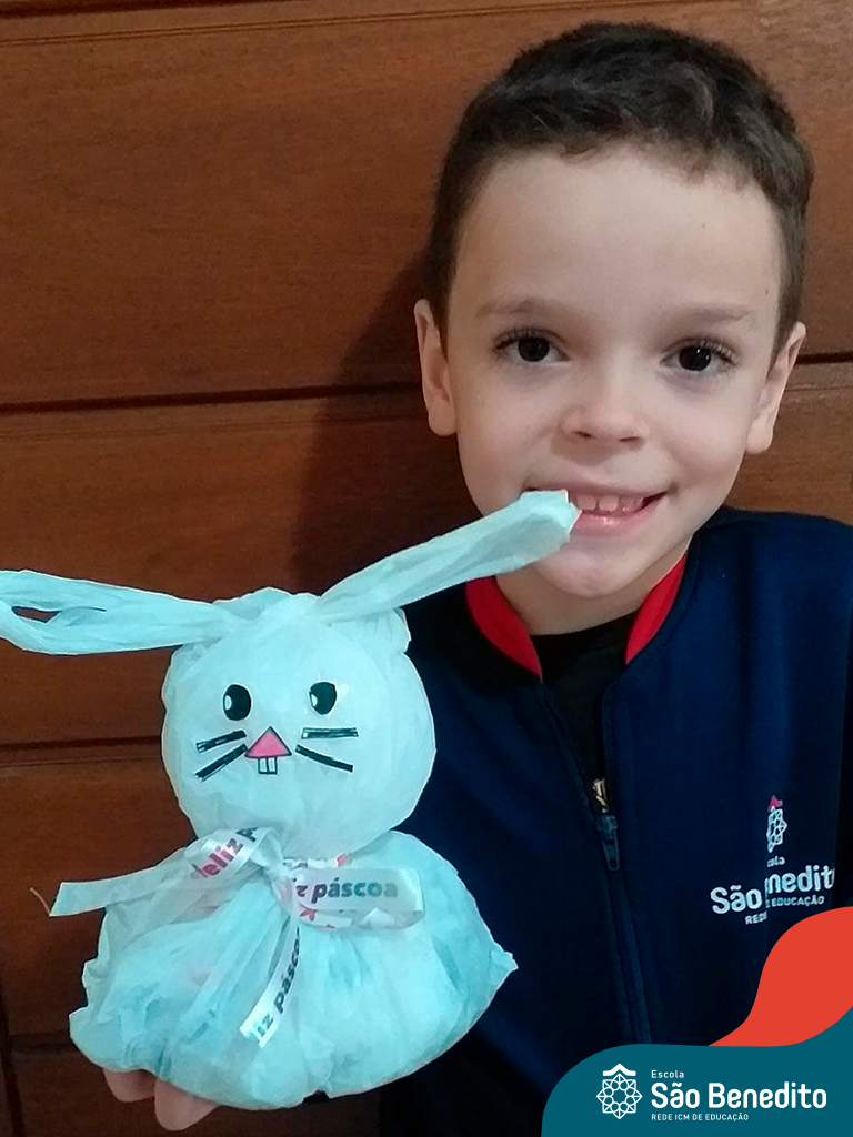 Alguns alunos utilizaram folhas coloridas, outros folhas caídas de árvore. E, ainda tiveram aqueles que optaram por construir um coelhinho com sacolas! É isso mesmo, com sacolas! A atividade, além de trazer muita cor e diversão, promoveu a reutilização de itens que levam anos para se decompor na natureza e ficam esquecidos, poluindo e não sendo utilizados. Confira as fotos: