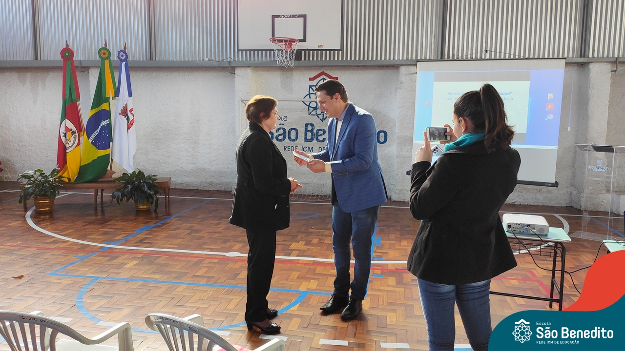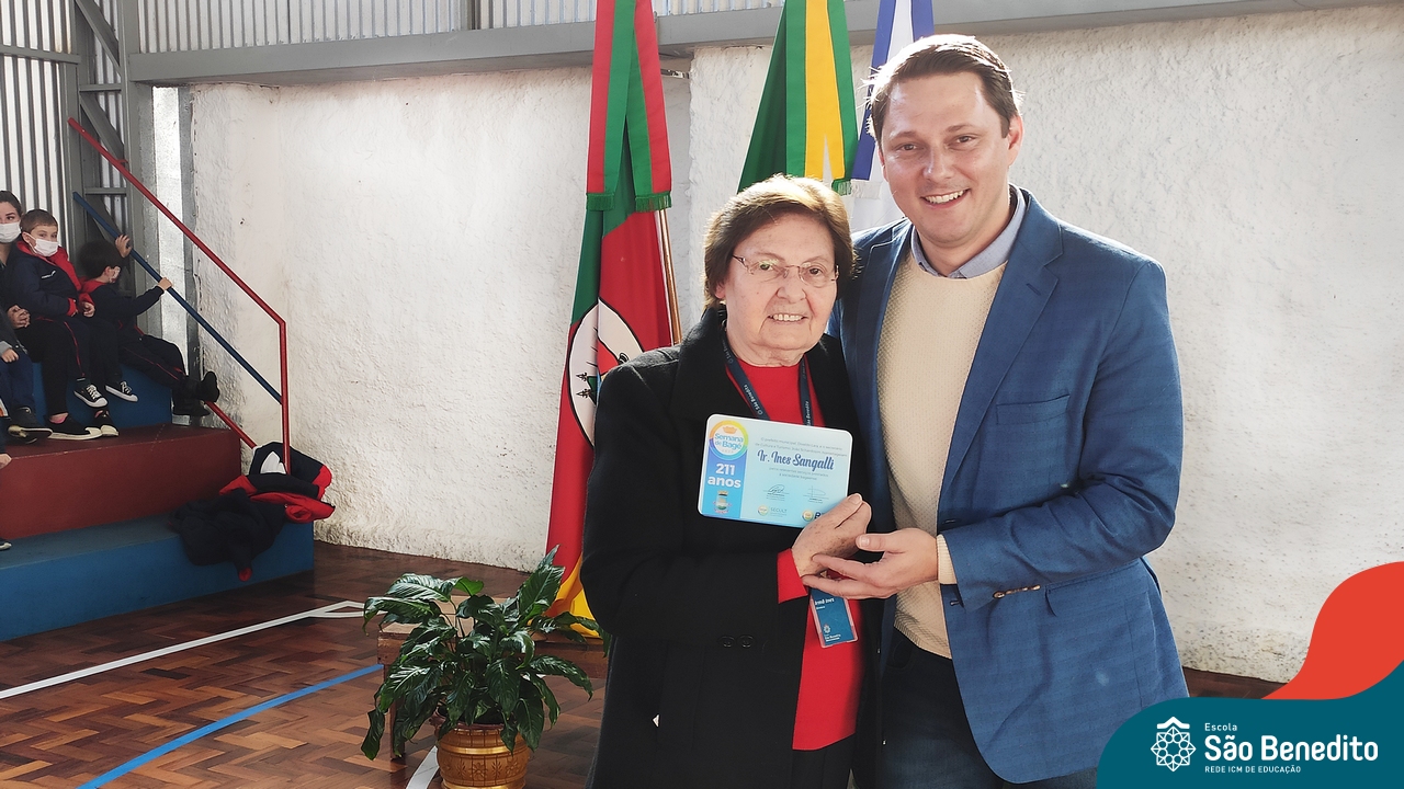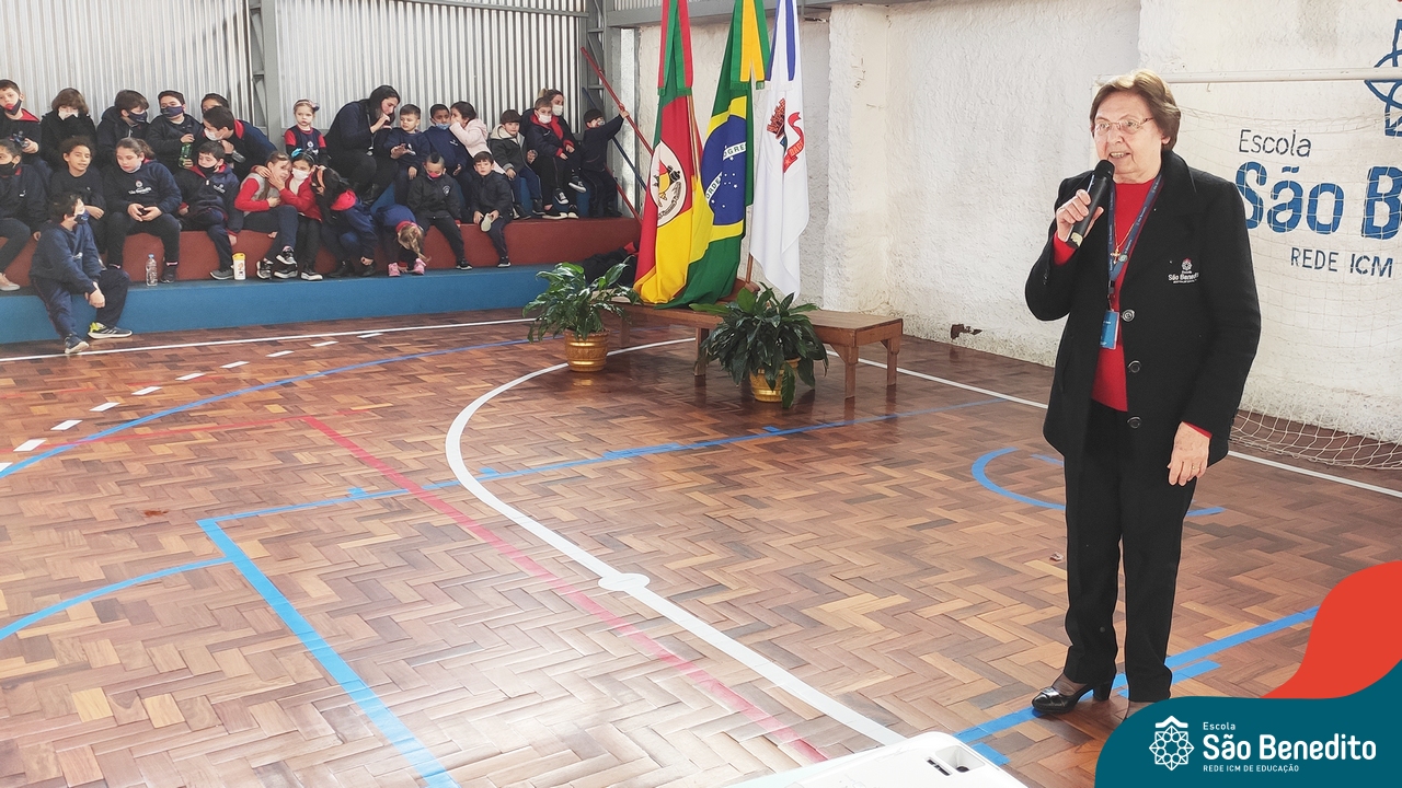 Nesta sexta-feira, 15/07, a Diretora da Escola São Benedito, Irmã Ines Terezinha Sangalli, recebeu a homenagem de “Mulher destaque por serviços relevantes prestados à comunidade bageense”, realizada pela Secretaria de Cultura e Turismo através do Secretário João Schardosim, que acompanhado de sua assessora, Larissa Macedo, participou do momento cívico organizado pelas turmas de 3º Ano, lideradas pelas professoras Bruna Jacinto, Marcele Caceres e Viviane Vizzotto.
