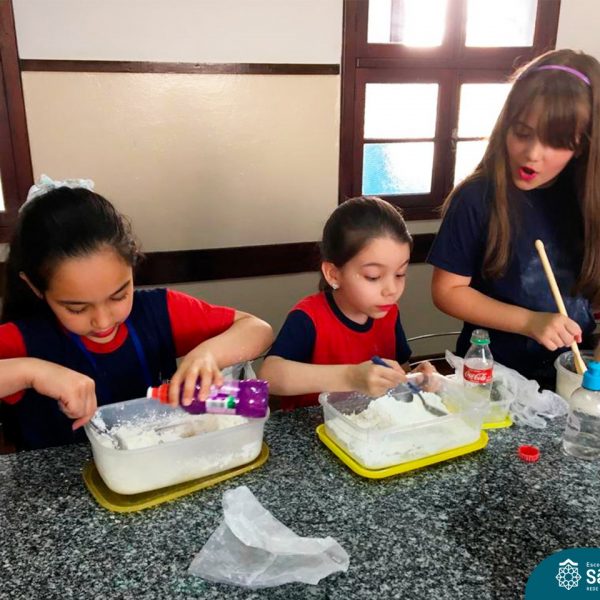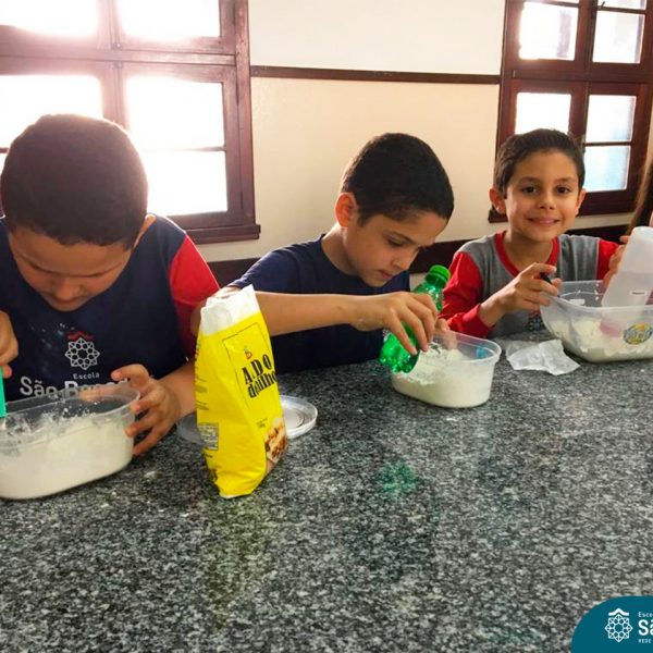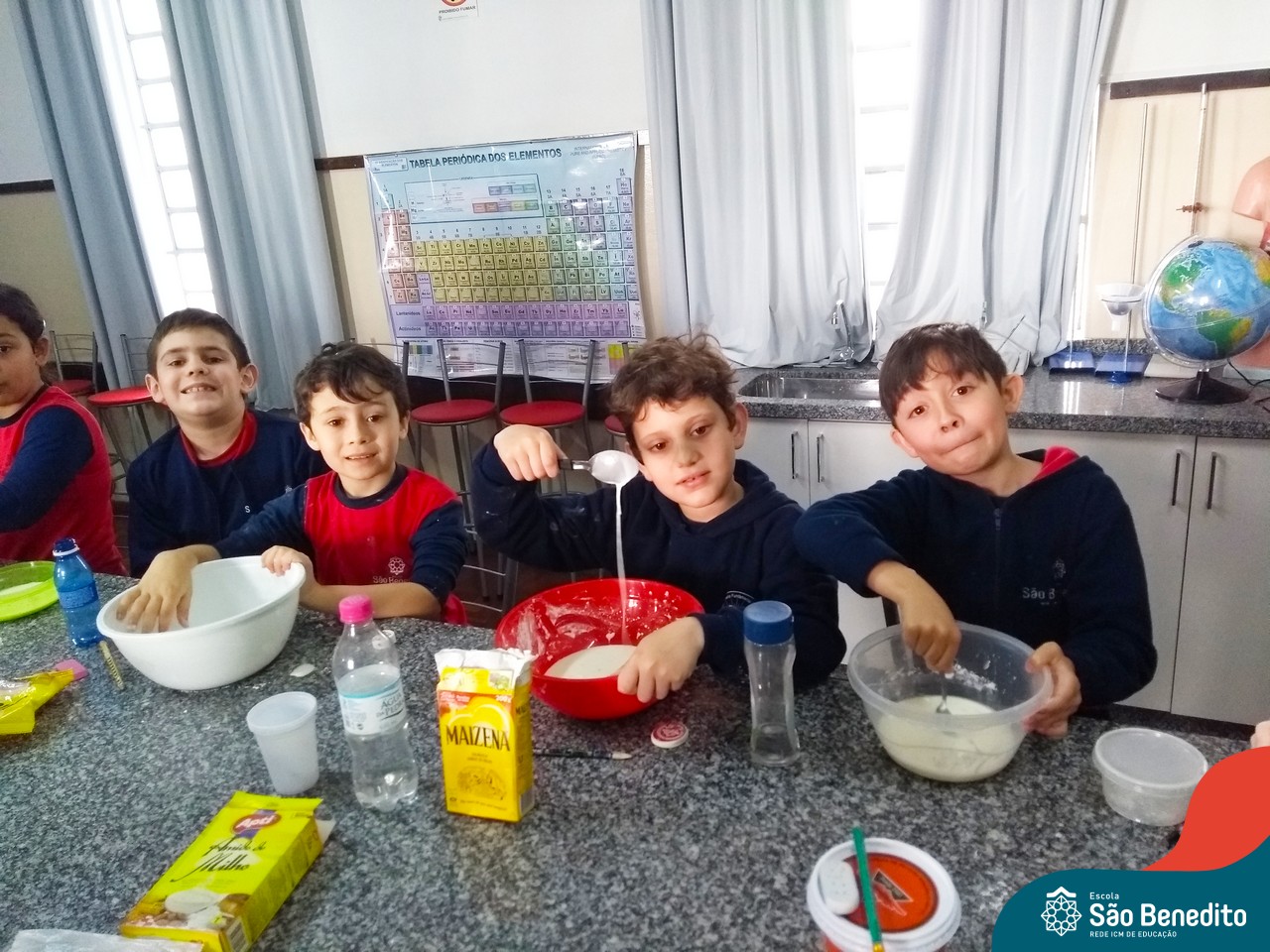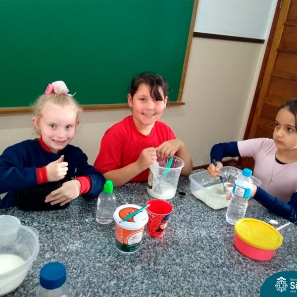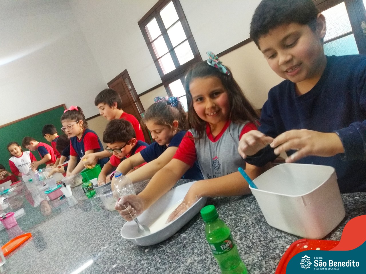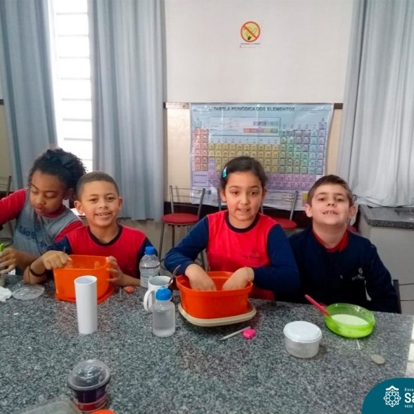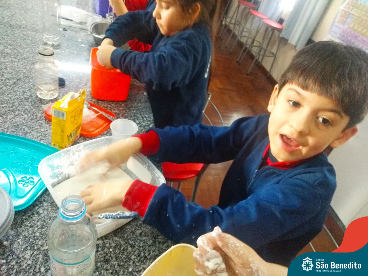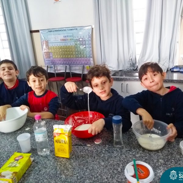 Quem disse que a ciência não pode ser muito divertida? As turmas do 2º Ano participaram de uma aula prática no Laboratório de Ciências que arrancou muitos sorrisos. O aprendizado da vez foi sobre as medidas de massa e capacidade, e se deu através do experimento “Massa Maluca”, que foi confeccionada pelos alunos, podendo possuir dois estados: sólido e líquido.