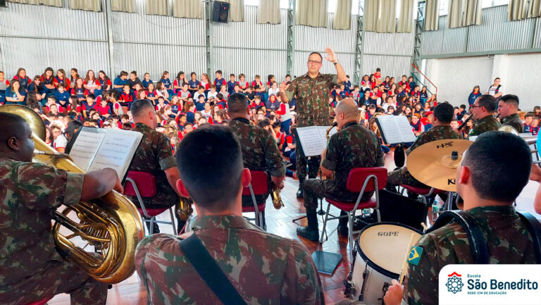 Na Semana da Criança, a Escola São Benedito teve uma programação mais que especial!! Além de danças, teatros e muitas brincadeiras divertidas, tivemos a honra de receber a Banda Fanfarra do Quartel General, que encantou a todos com uma apresentação magnífica.