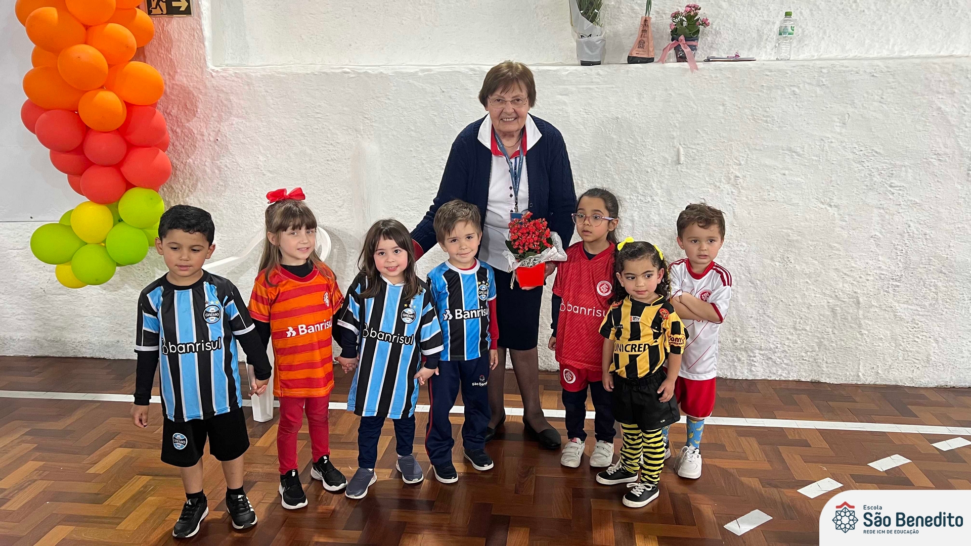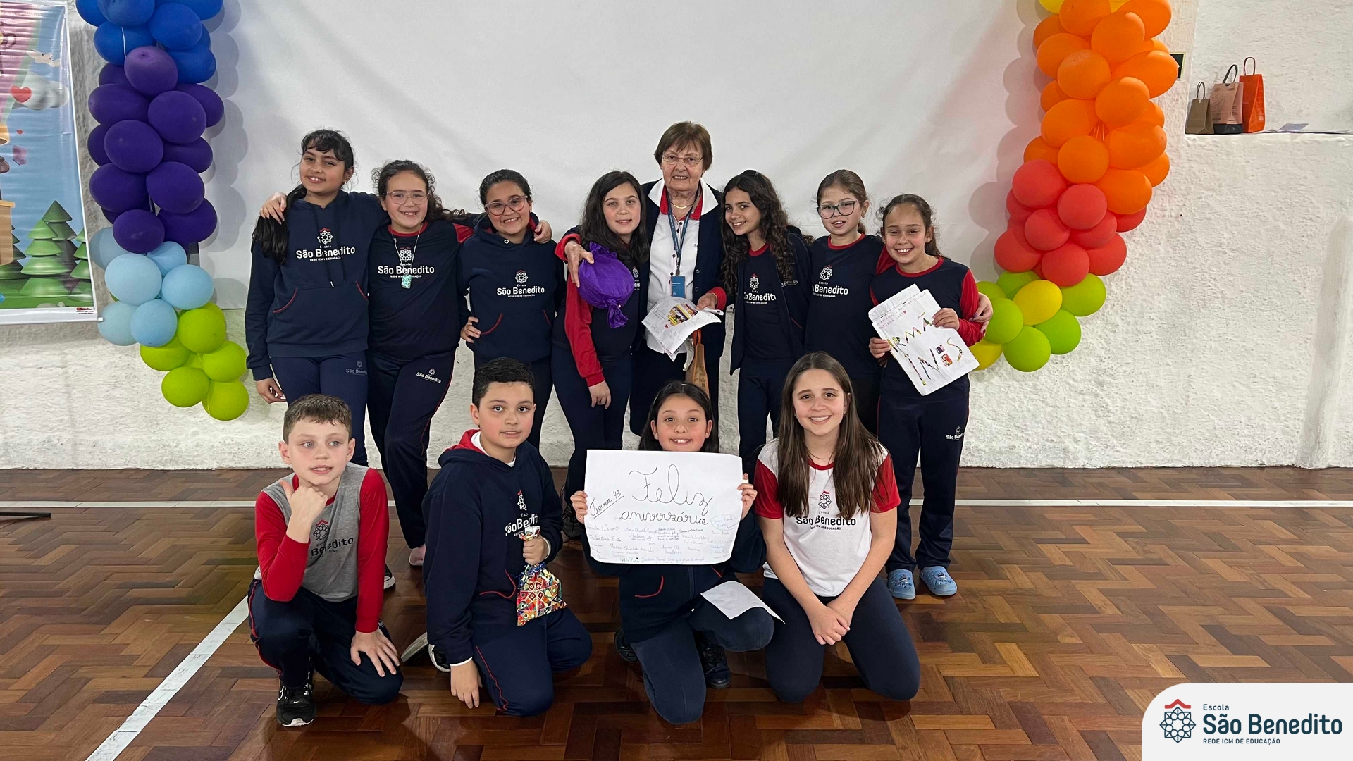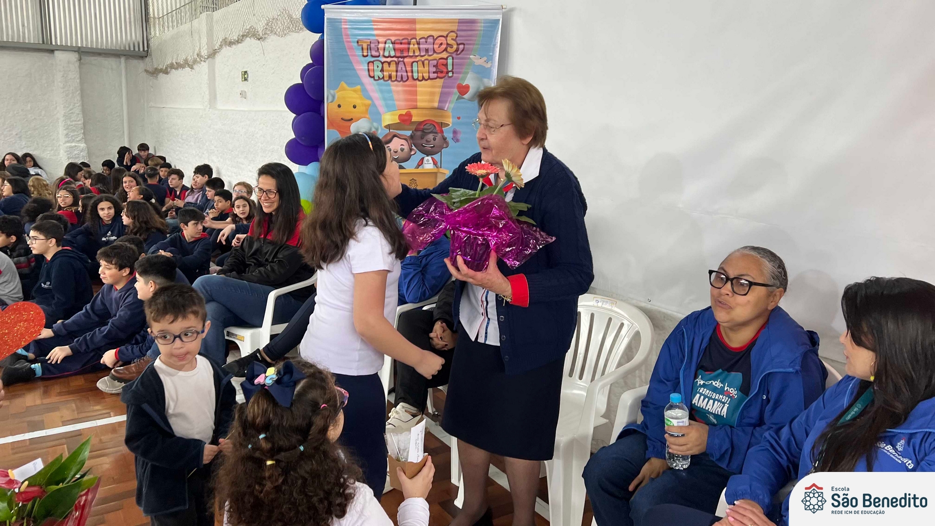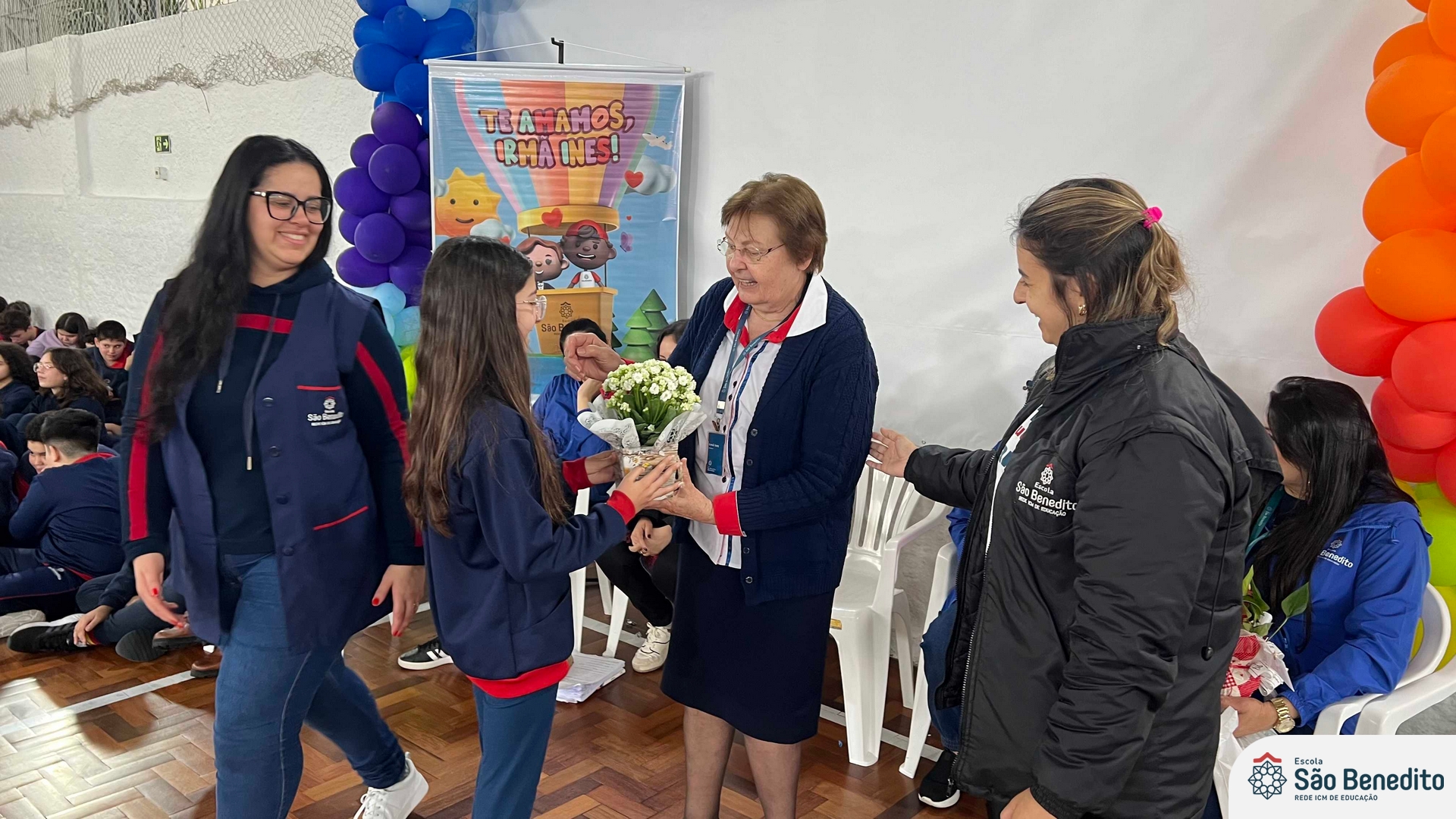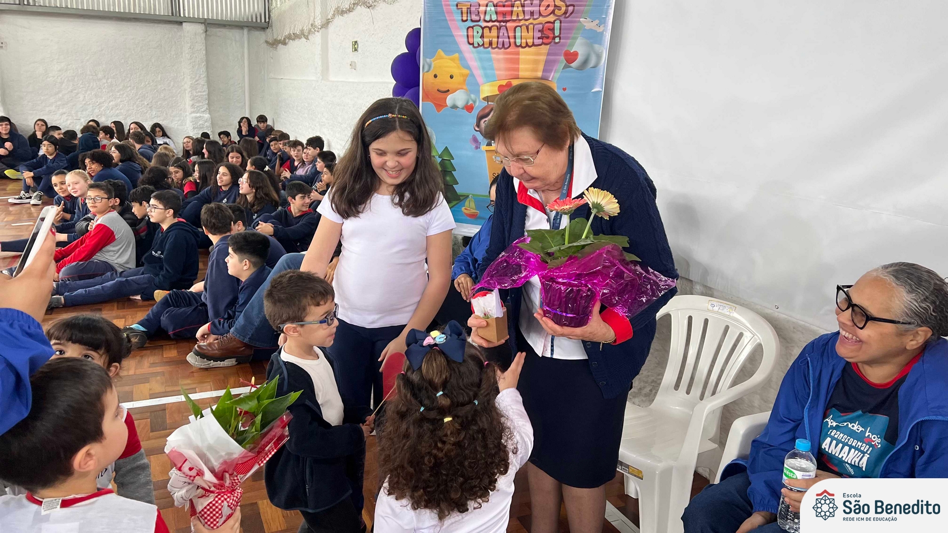 O encerramento da Semana da Criança na Escola São Benedito foi marcado por uma celebração muito especial: o aniversário da querida irmã Ines Terezinha Sangalli, diretora da instituição. Estudantes, professores e monitores, desde a Educação Infantil até o Ensino Fundamental II, se uniram para prestar homenagens com apresentações emocionantes, muito amor, carinho e mimos exclusivos. A ocasião foi um verdadeiro símbolo de gratidão e afeto, fechando a semana de festividades com chave de ouro.