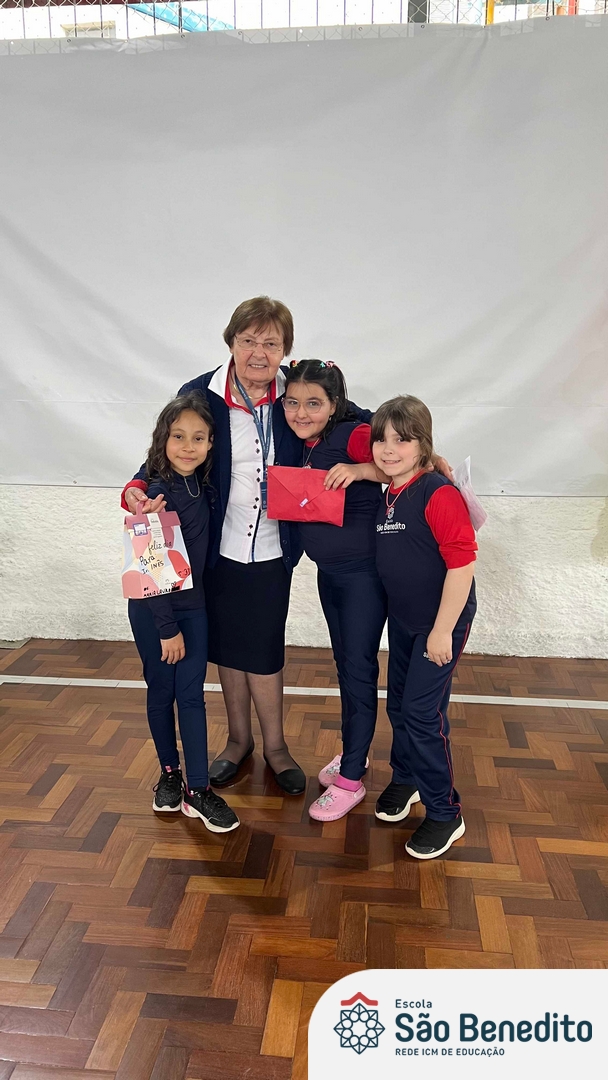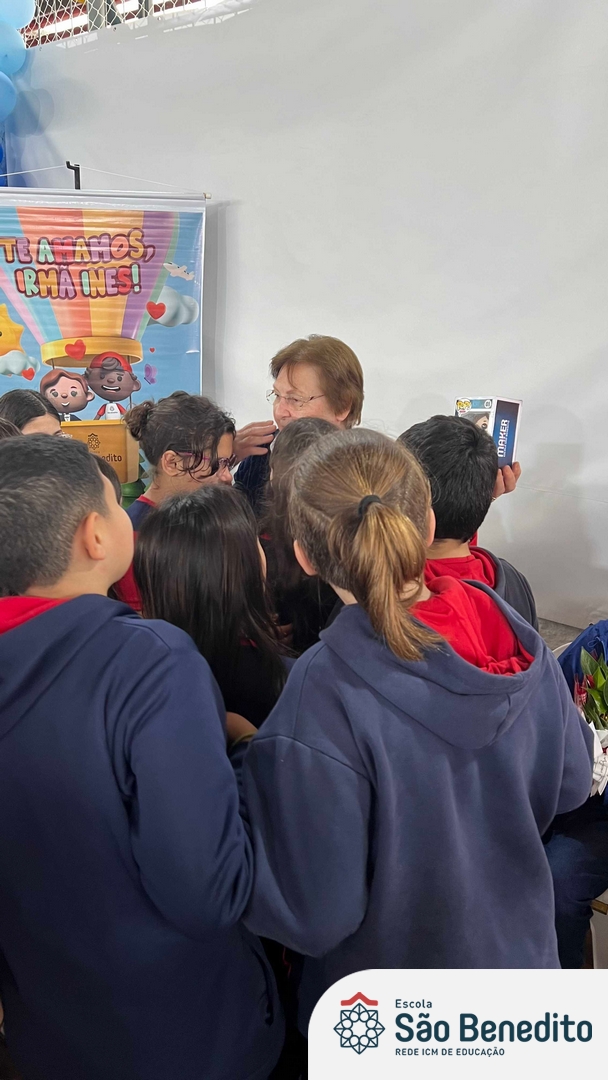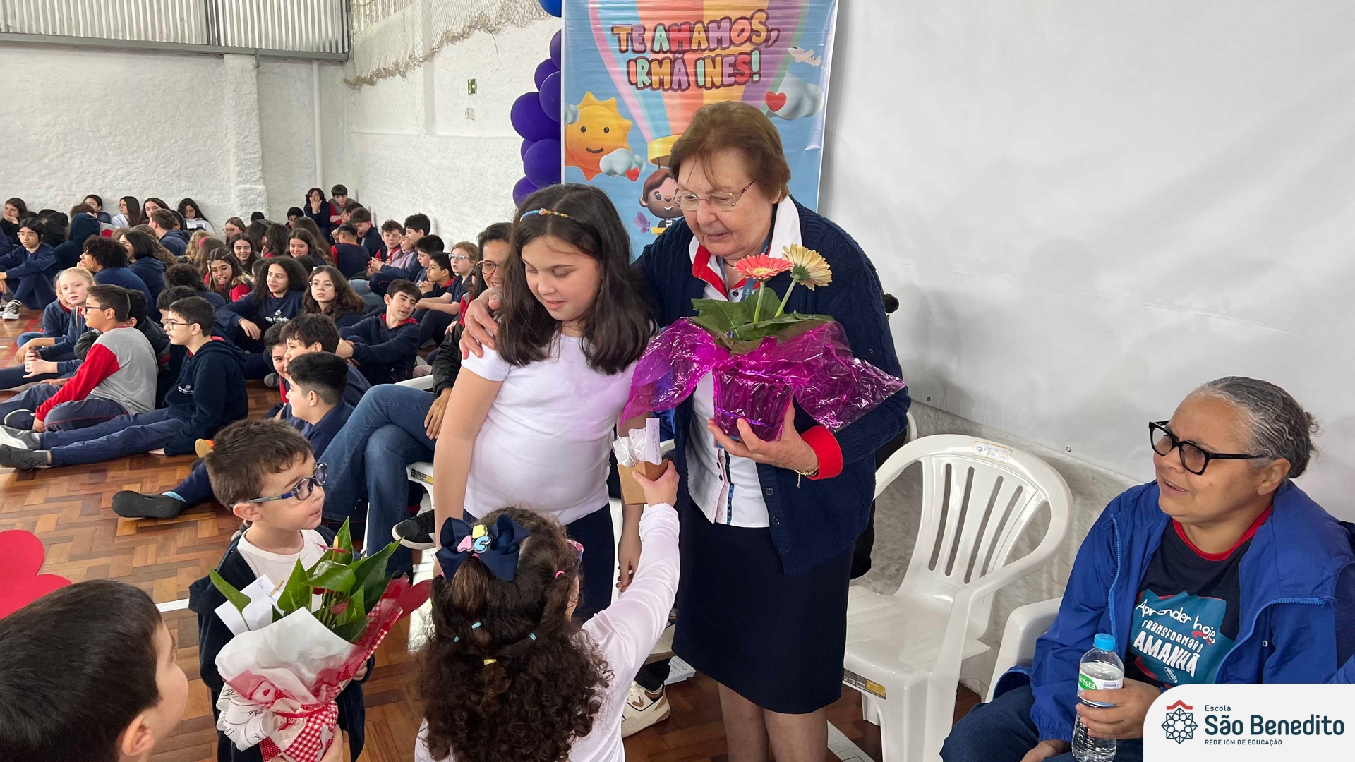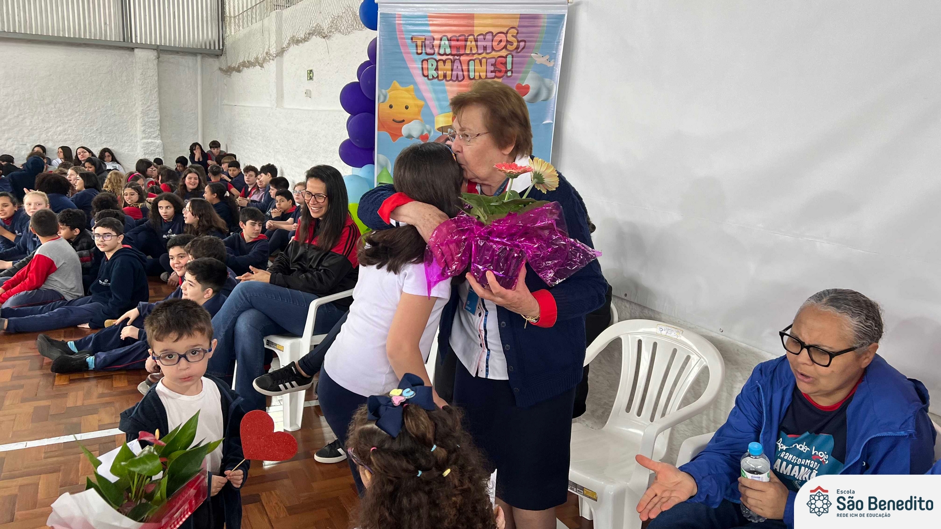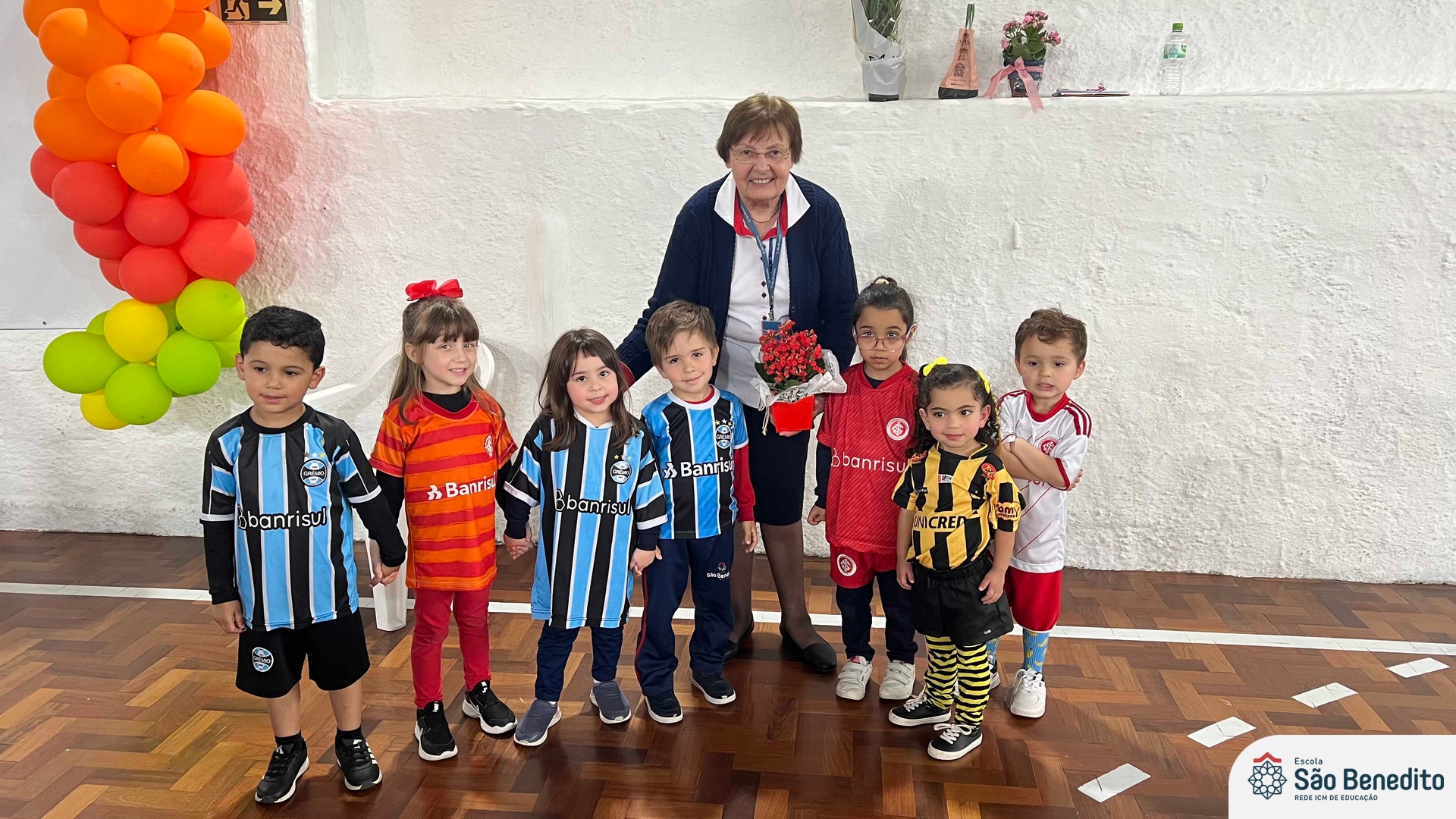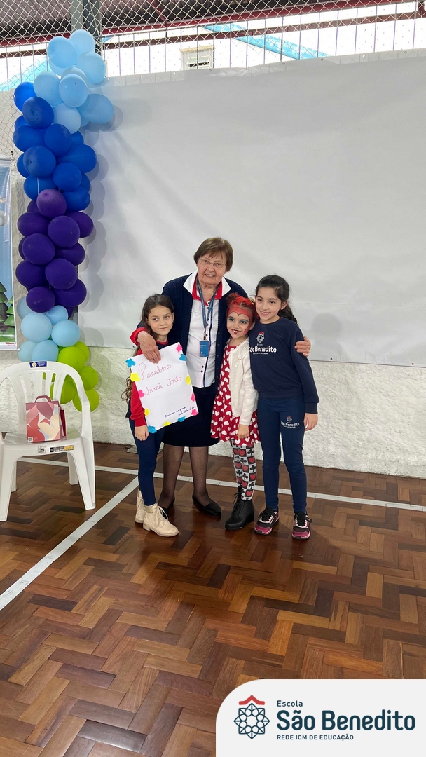 O encerramento da Semana da Criança na Escola São Benedito foi marcado por uma celebração muito especial: o aniversário da querida irmã Ines Terezinha Sangalli, diretora da instituição. Estudantes, professores e monitores, desde a Educação Infantil até o Ensino Fundamental II, se uniram para prestar homenagens com apresentações emocionantes, muito amor, carinho e mimos exclusivos. A ocasião foi um verdadeiro símbolo de gratidão e afeto, fechando a semana de festividades com chave de ouro.