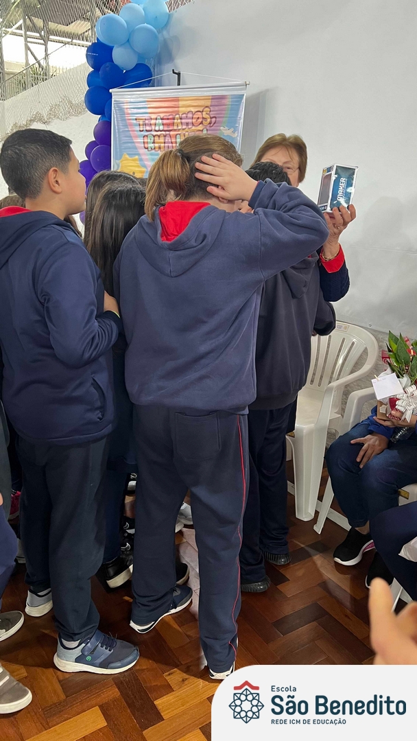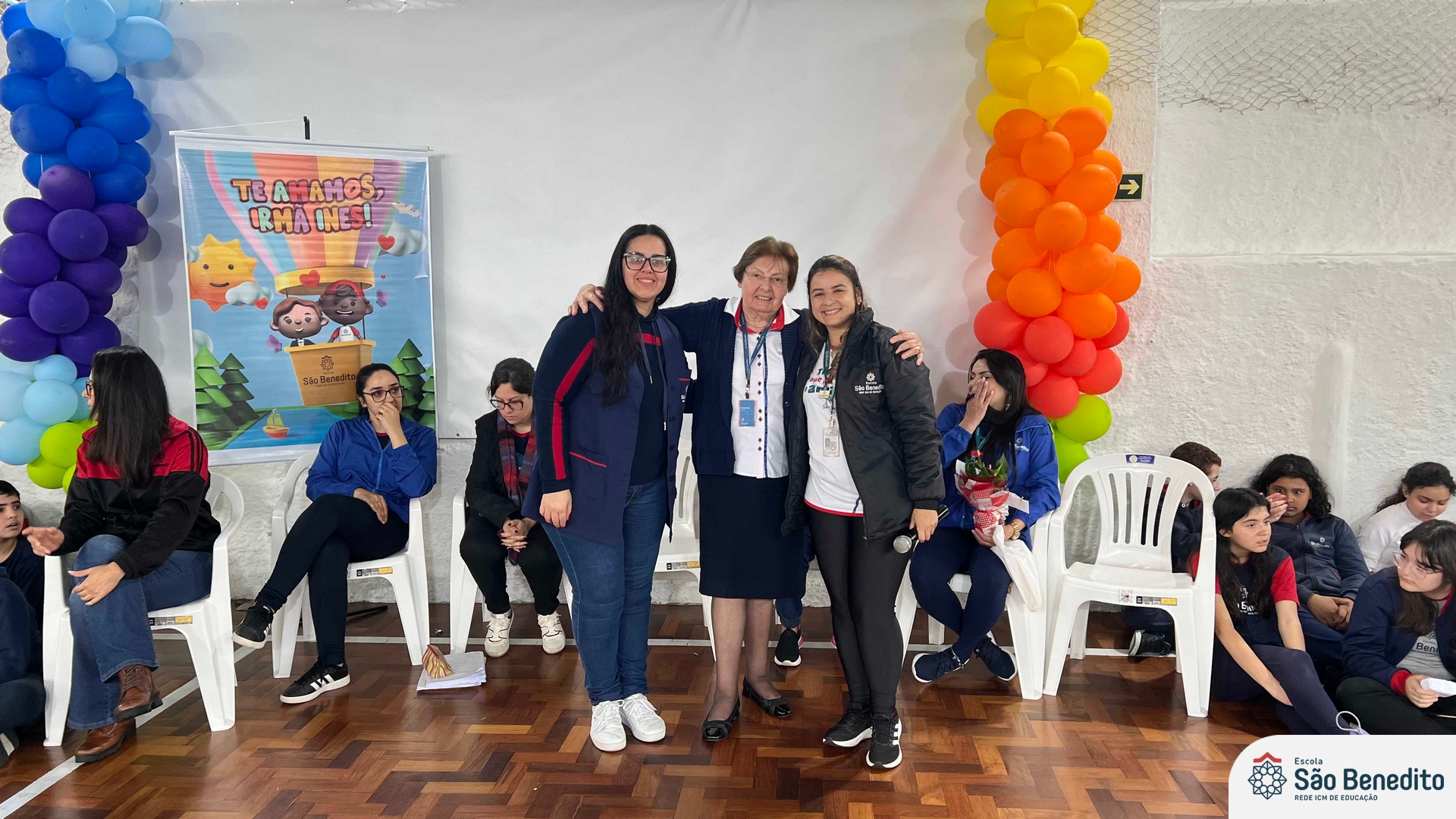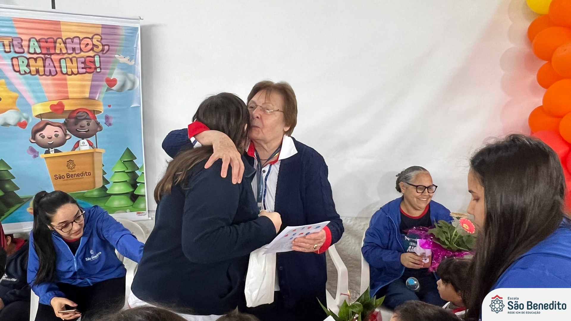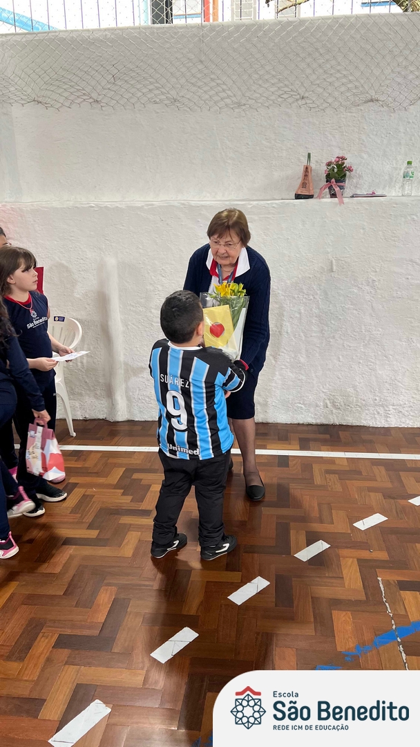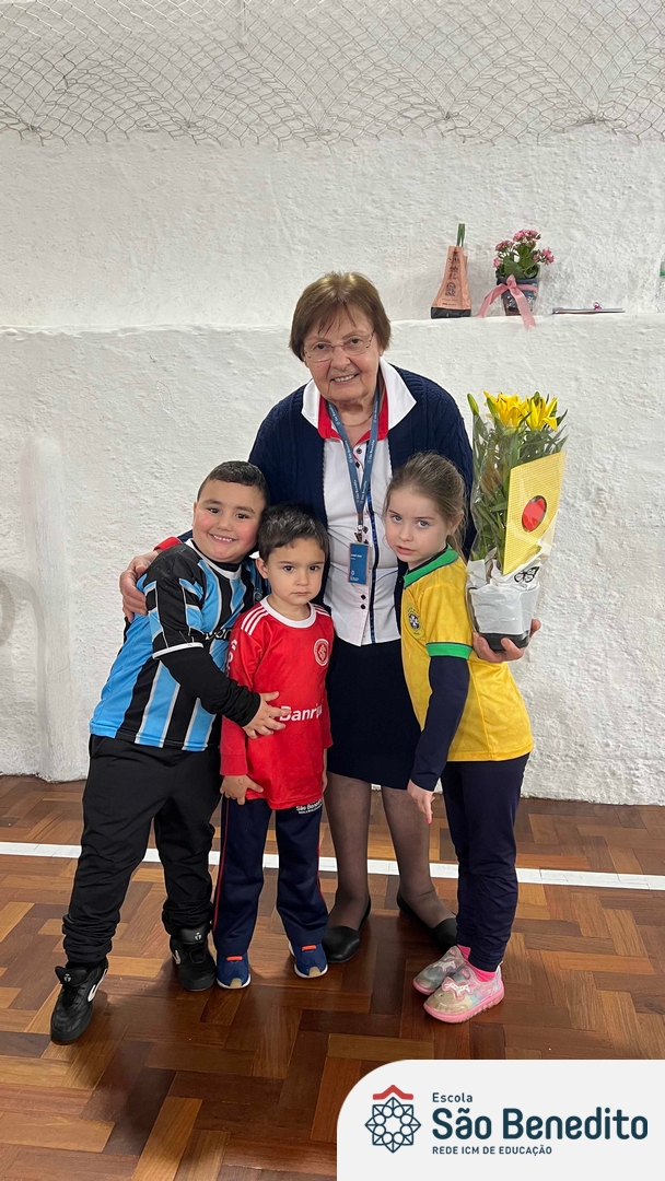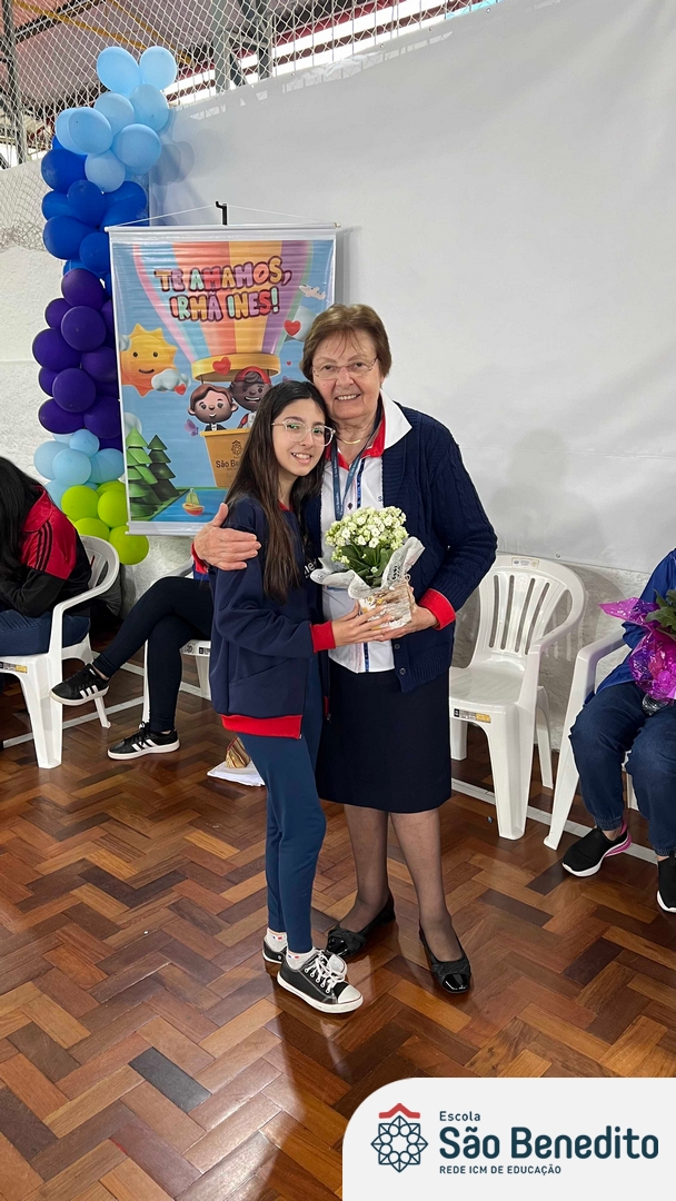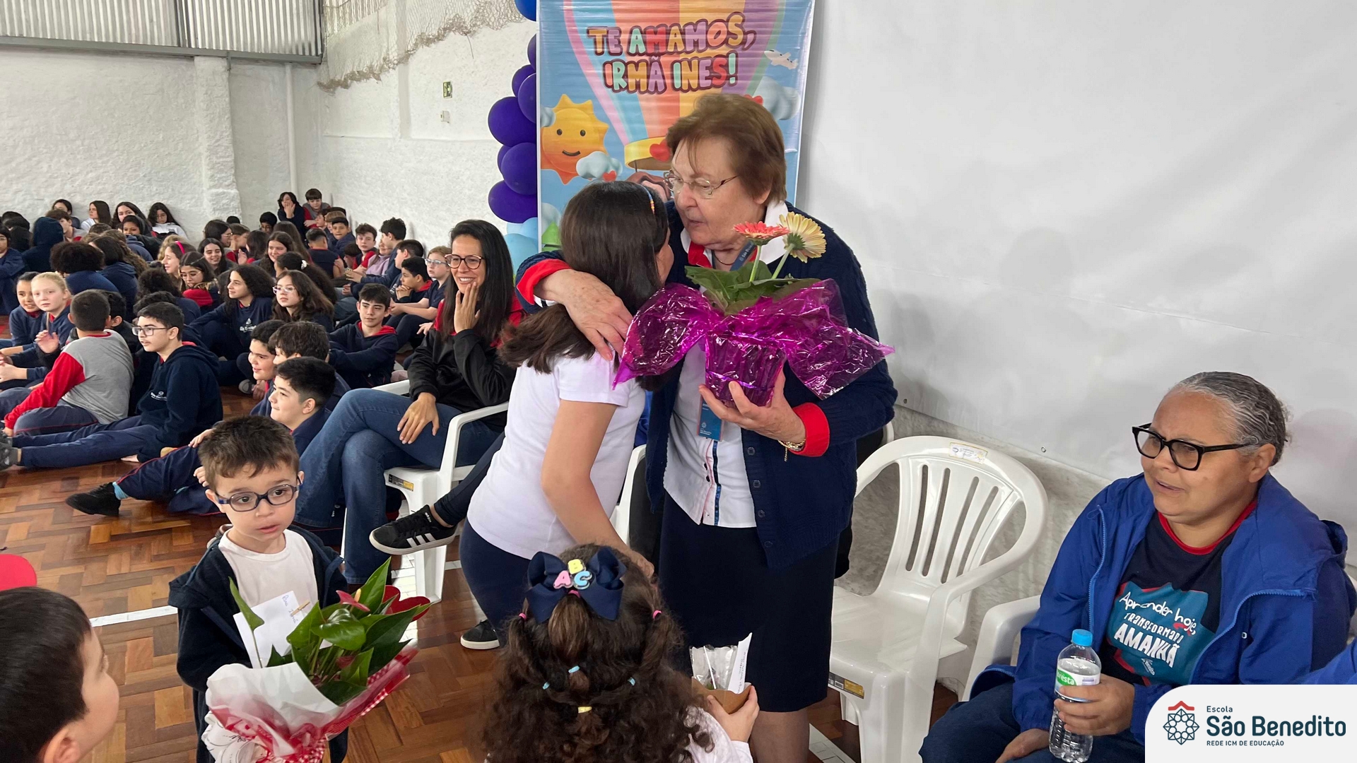 O encerramento da Semana da Criança na Escola São Benedito foi marcado por uma celebração muito especial: o aniversário da querida irmã Ines Terezinha Sangalli, diretora da instituição. Estudantes, professores e monitores, desde a Educação Infantil até o Ensino Fundamental II, se uniram para prestar homenagens com apresentações emocionantes, muito amor, carinho e mimos exclusivos. A ocasião foi um verdadeiro símbolo de gratidão e afeto, fechando a semana de festividades com chave de ouro.