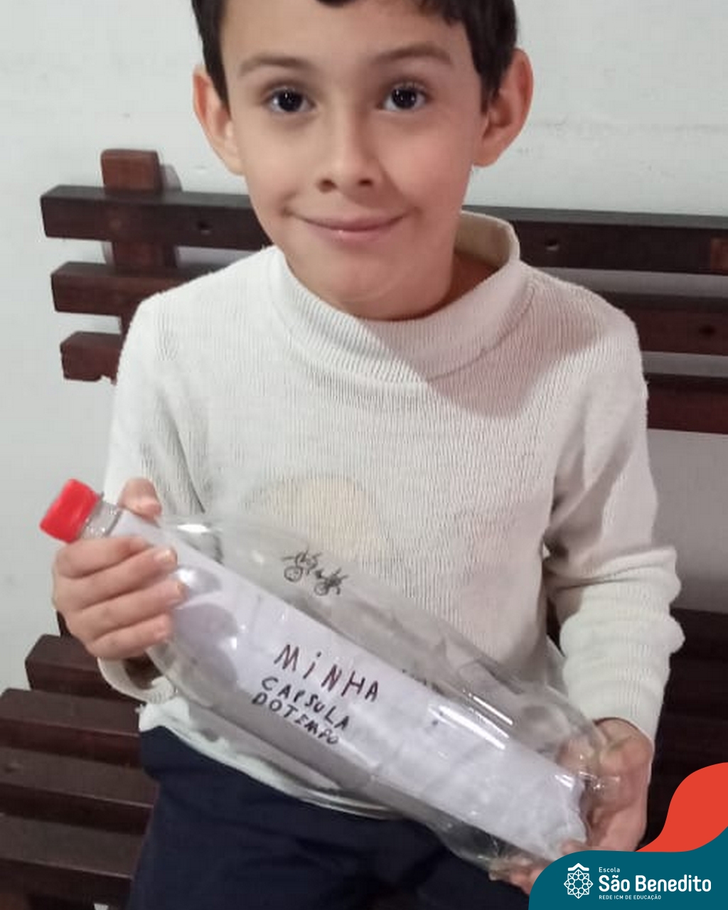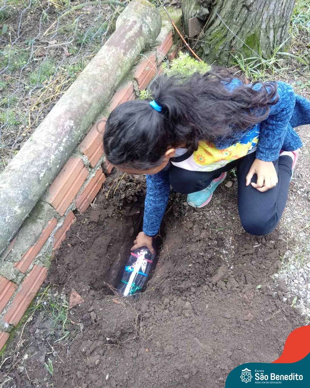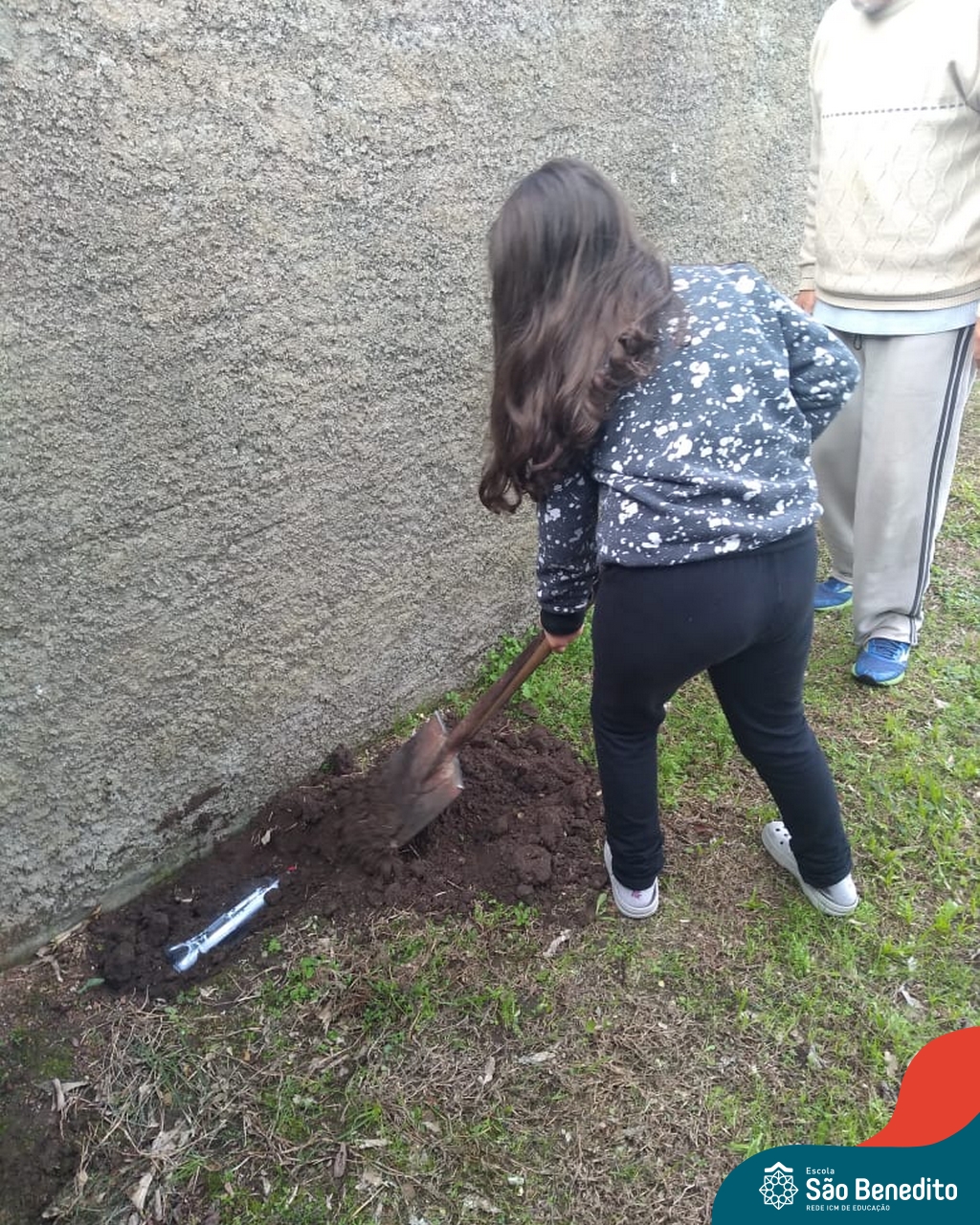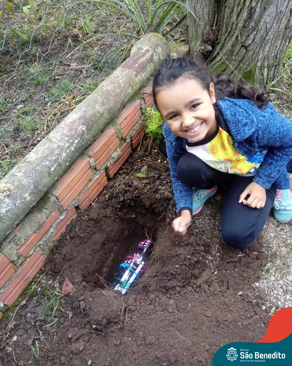 As cápsulas foram guardadas em um lugar secreto que cada um escolheu; algumas até enterradas! A ideia é que os alunos abram somente daqui um ano, recordando esse momento.