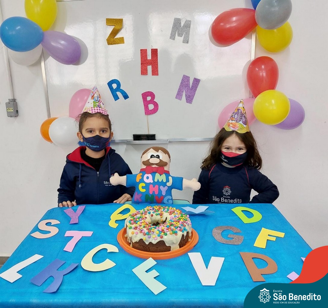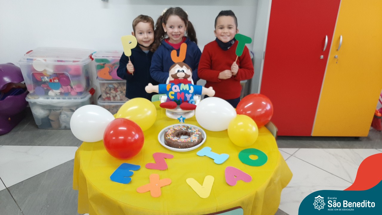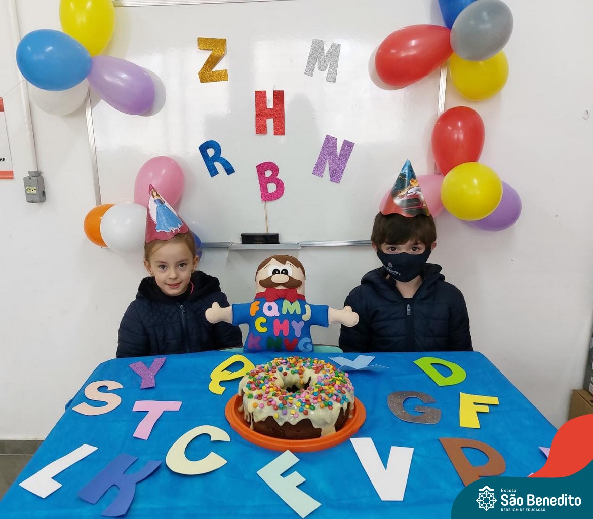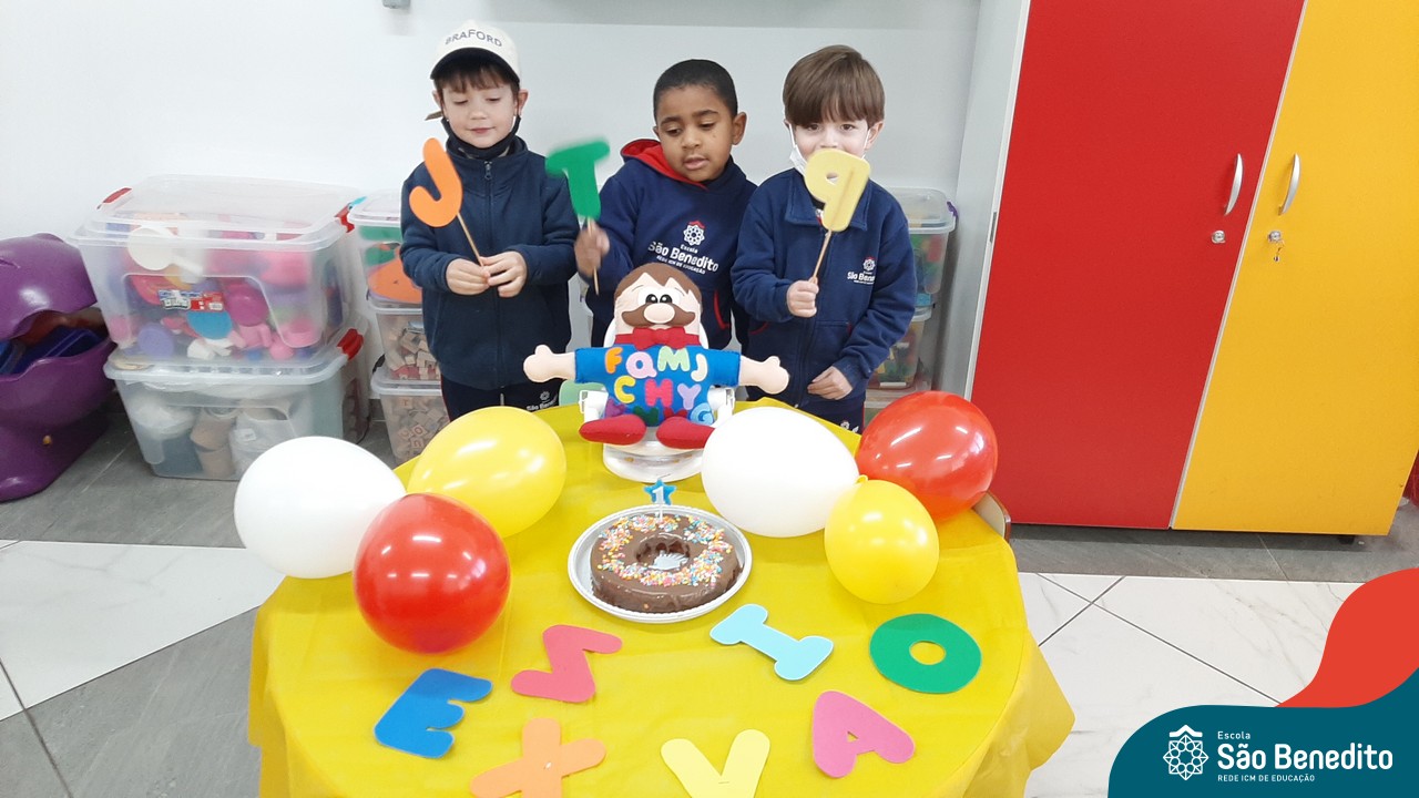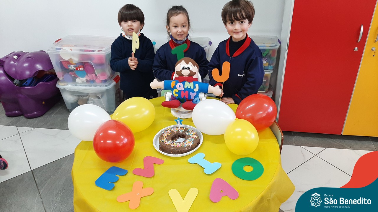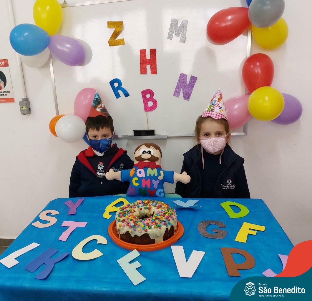 Com base no conto, os estudantes também comemoraram o aniversário do Seu Alfabeto, contando, é claro, com presença ilustre do próprio: o mascotinho recebeu até bolo! E para essa festa ficar ainda mais incrível e recheada de aprendizado, cada dia, os alunos presentearão o amigo com algo que comece com a letra escolhida pelas professoras. Todos os presentes ficarão expostos em sala de aula durante todo o projeto, de forma que os pequenos possam memorizar as letras. Além disso, através dos objetos, será construído um livro do alfabeto, que será entregue às famílias, contendo os registros das atividades, e se transformará em uma linda lembrança desse momento tão importante da infância, que é o início da alfabetização.