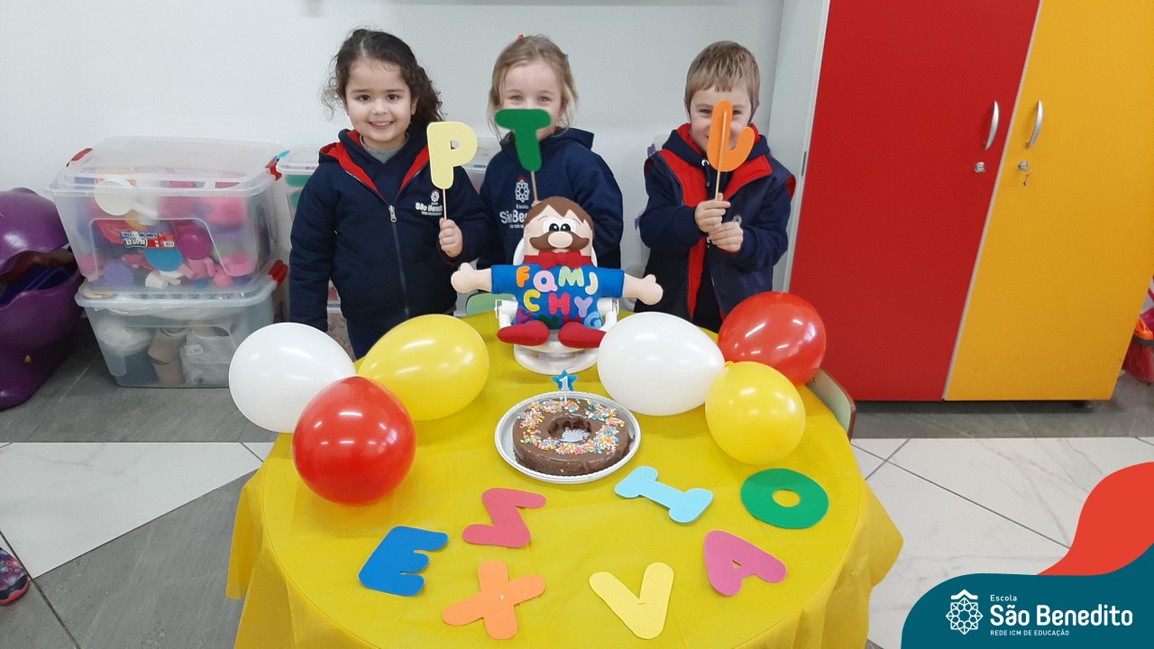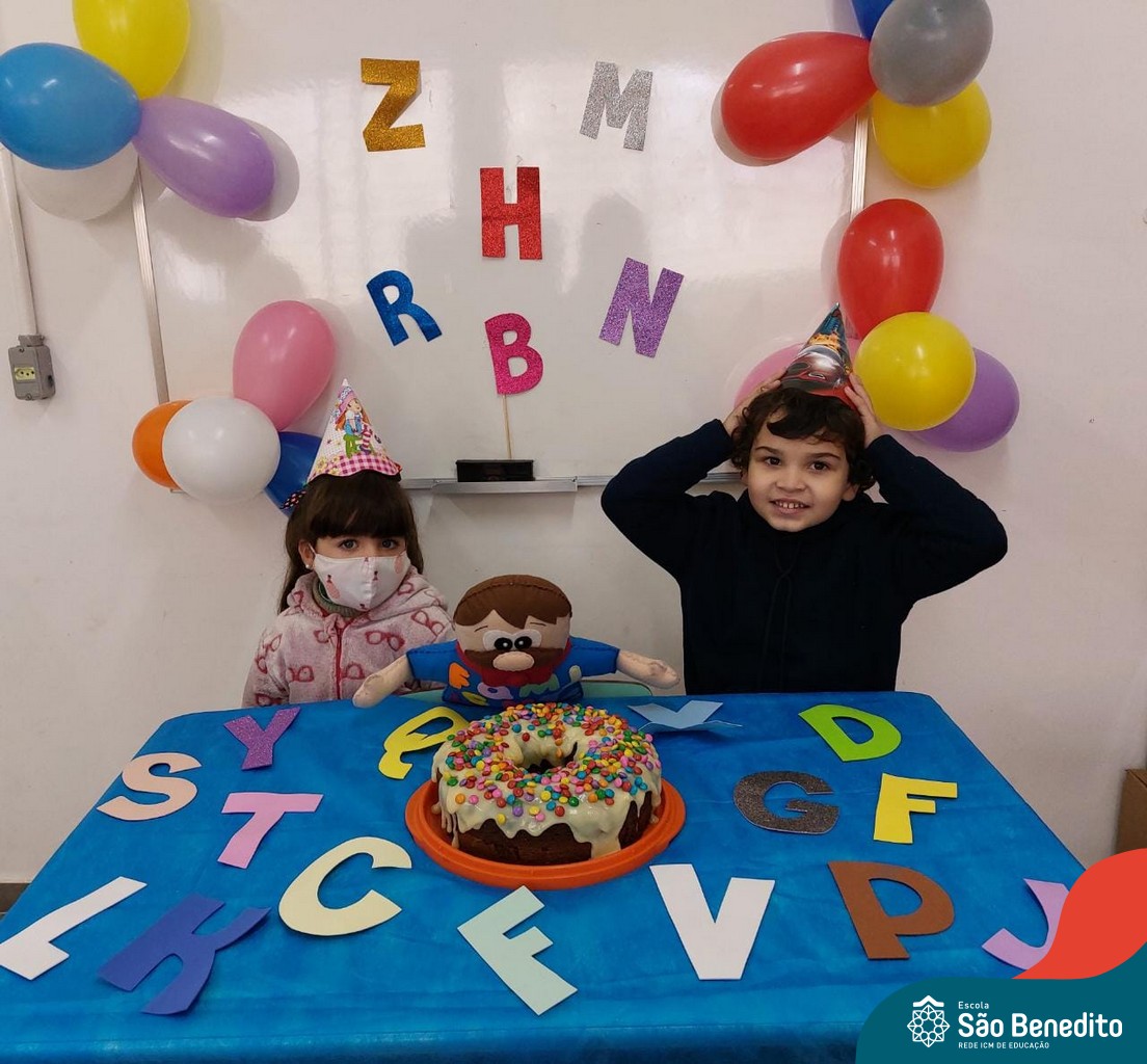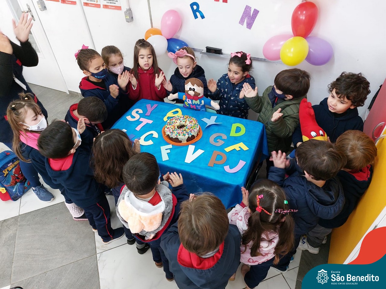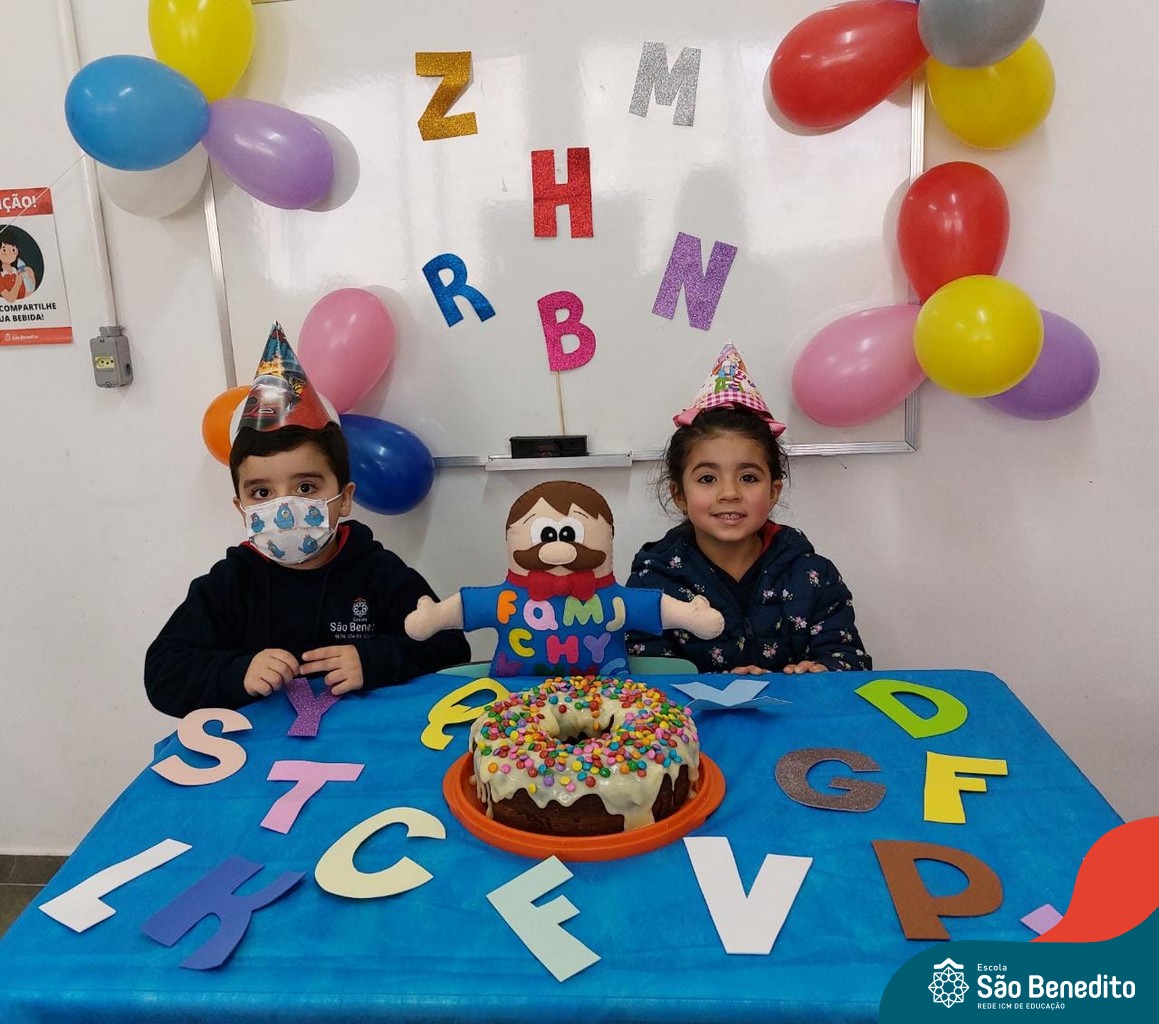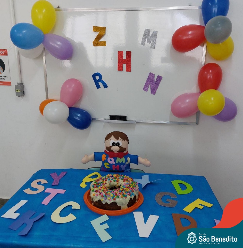 Com base no conto, os estudantes também comemoraram o aniversário do Seu Alfabeto, contando, é claro, com presença ilustre do próprio: o mascotinho recebeu até bolo! E para essa festa ficar ainda mais incrível e recheada de aprendizado, cada dia, os alunos presentearão o amigo com algo que comece com a letra escolhida pelas professoras. Todos os presentes ficarão expostos em sala de aula durante todo o projeto, de forma que os pequenos possam memorizar as letras. Além disso, através dos objetos, será construído um livro do alfabeto, que será entregue às famílias, contendo os registros das atividades, e se transformará em uma linda lembrança desse momento tão importante da infância, que é o início da alfabetização.