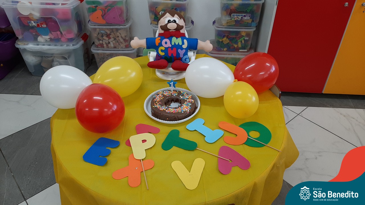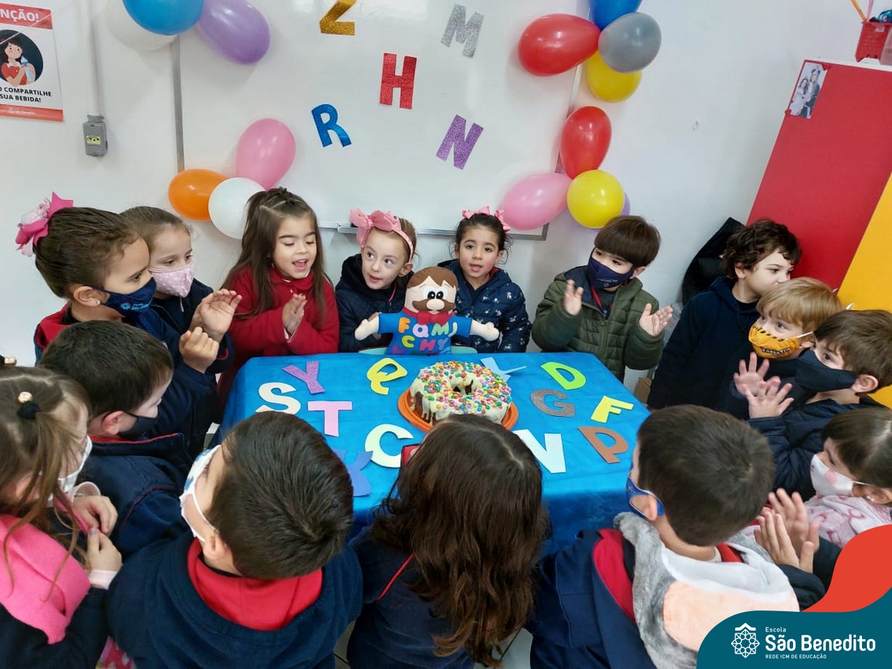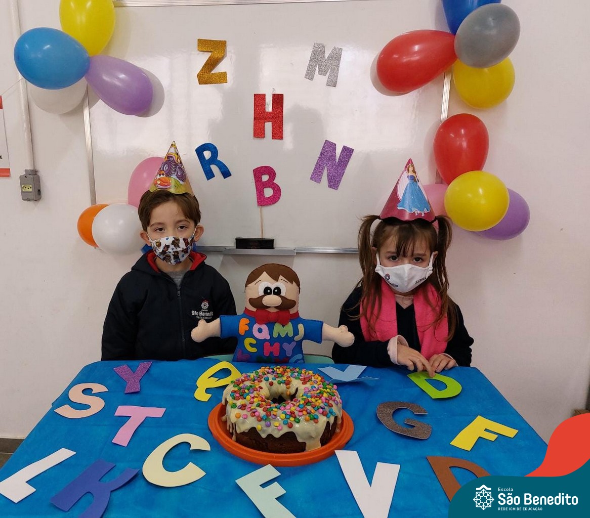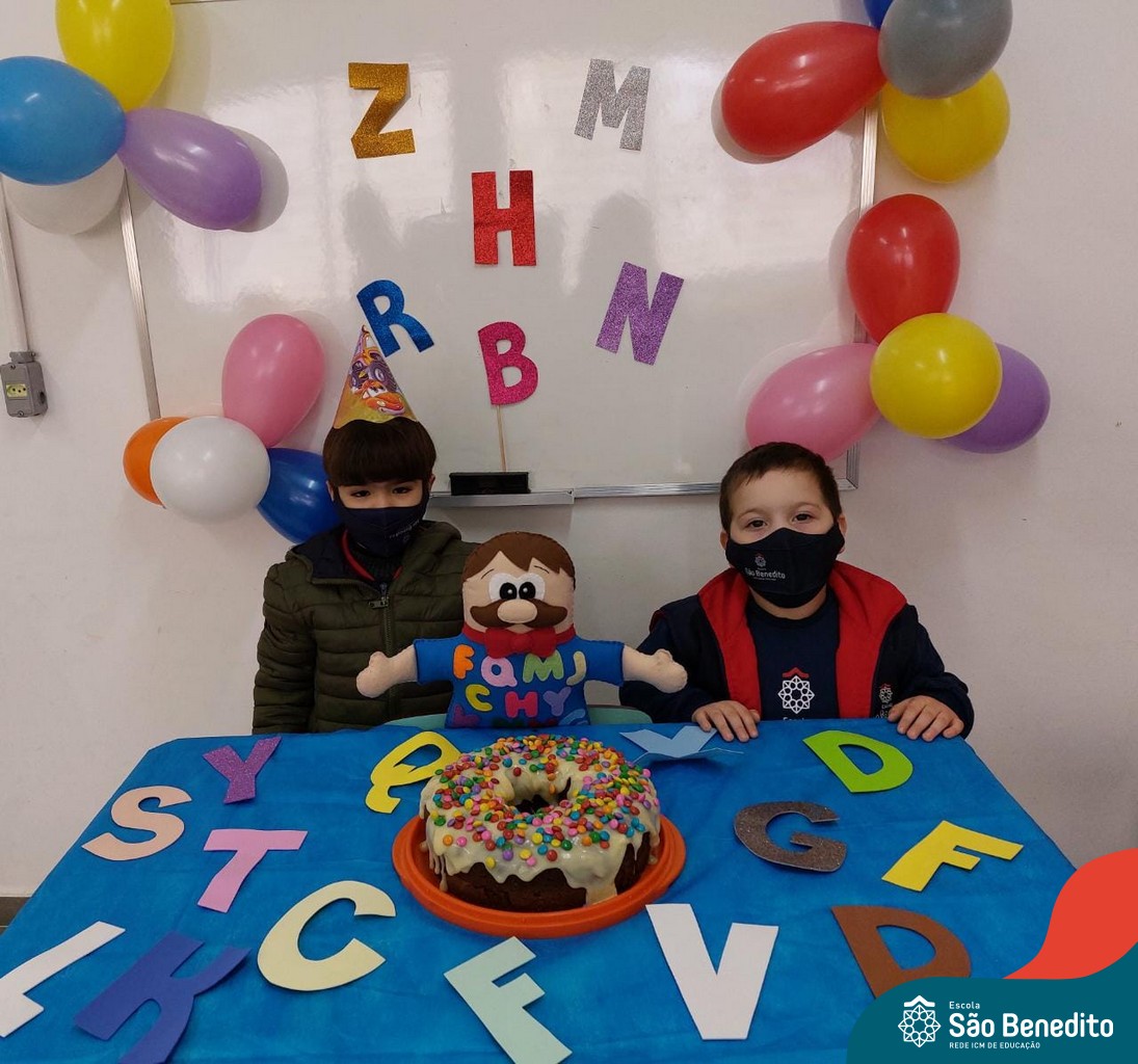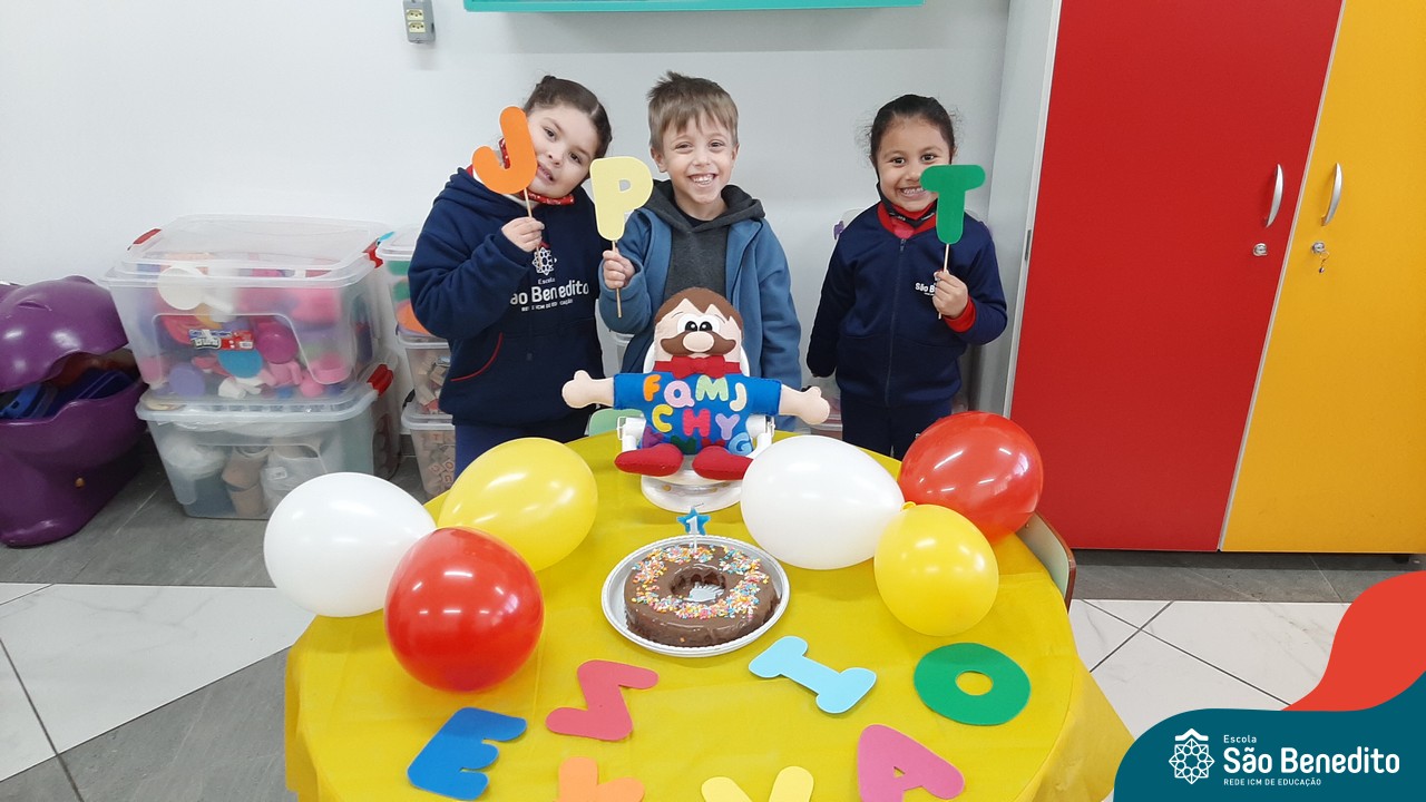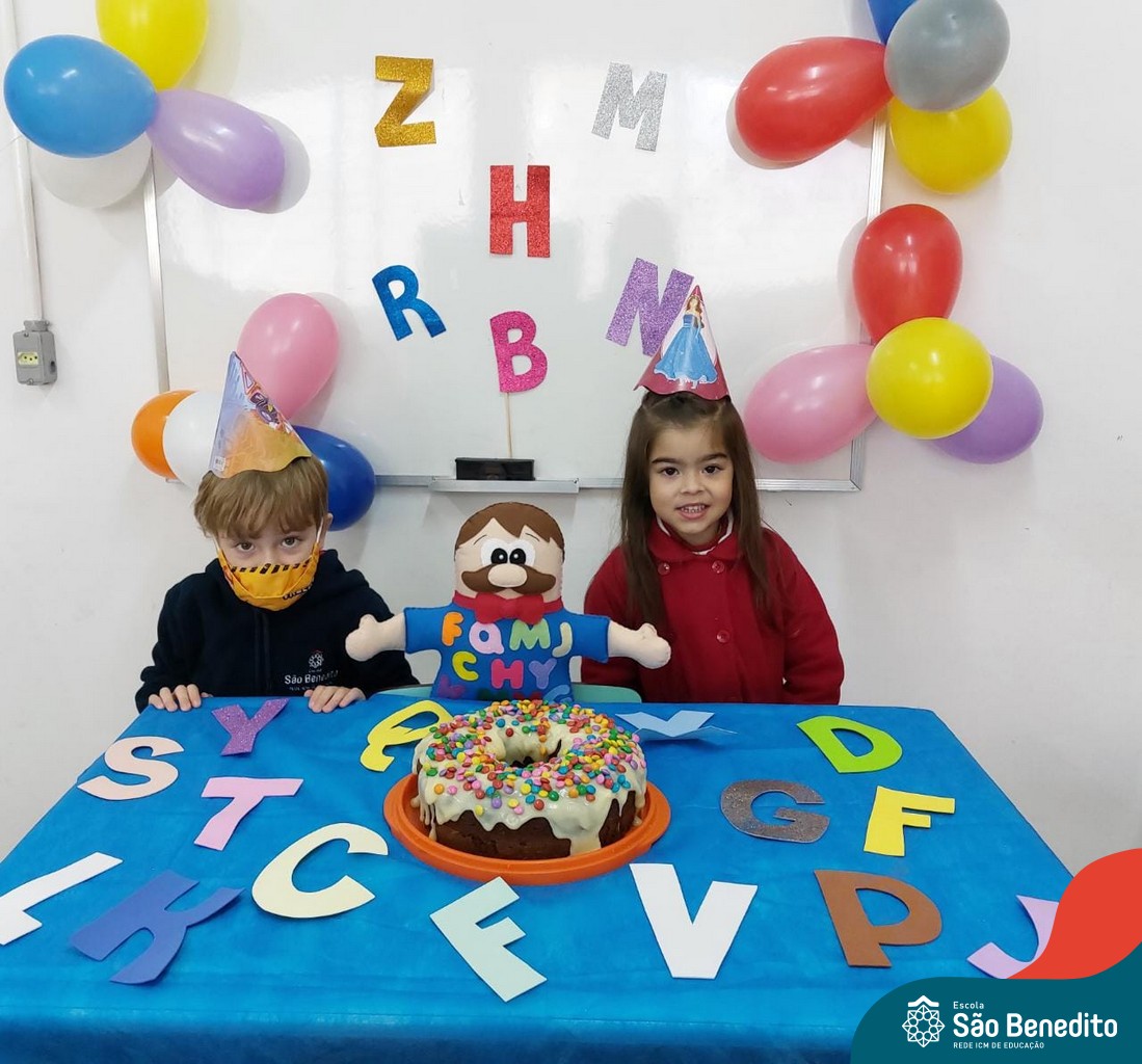 Com base no conto, os estudantes também comemoraram o aniversário do Seu Alfabeto, contando, é claro, com presença ilustre do próprio: o mascotinho recebeu até bolo! E para essa festa ficar ainda mais incrível e recheada de aprendizado, cada dia, os alunos presentearão o amigo com algo que comece com a letra escolhida pelas professoras. Todos os presentes ficarão expostos em sala de aula durante todo o projeto, de forma que os pequenos possam memorizar as letras. Além disso, através dos objetos, será construído um livro do alfabeto, que será entregue às famílias, contendo os registros das atividades, e se transformará em uma linda lembrança desse momento tão importante da infância, que é o início da alfabetização.