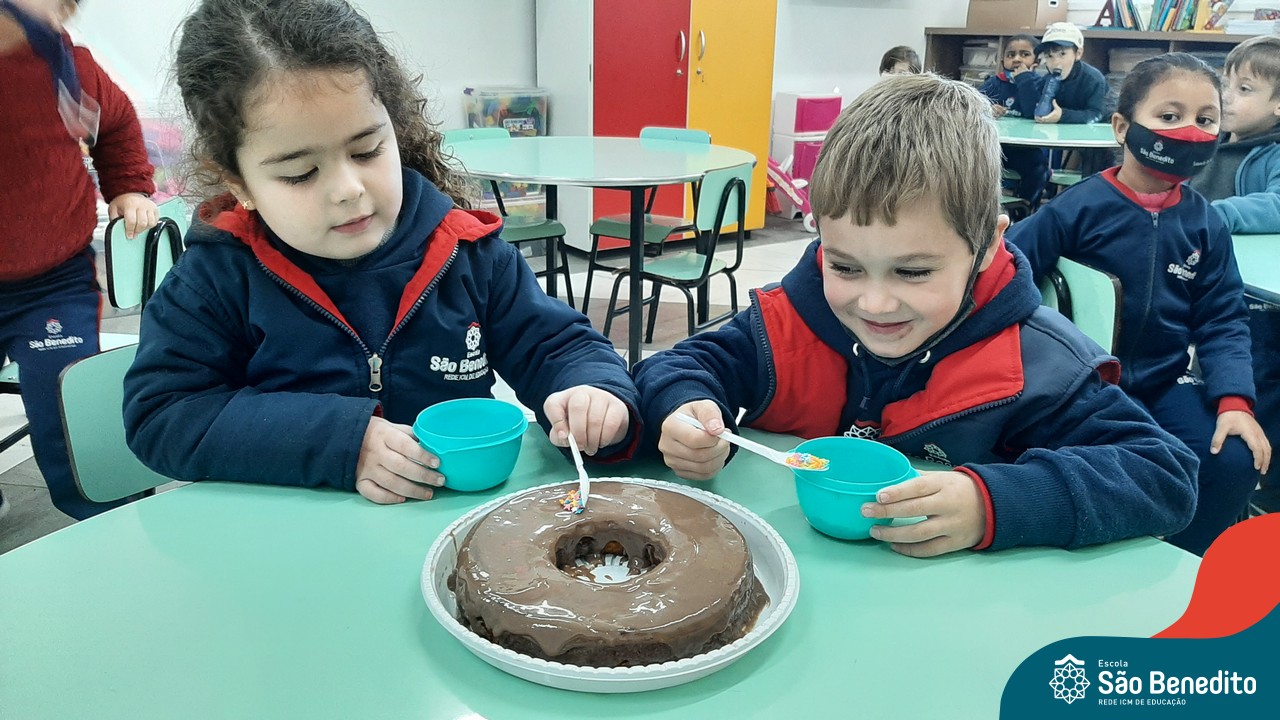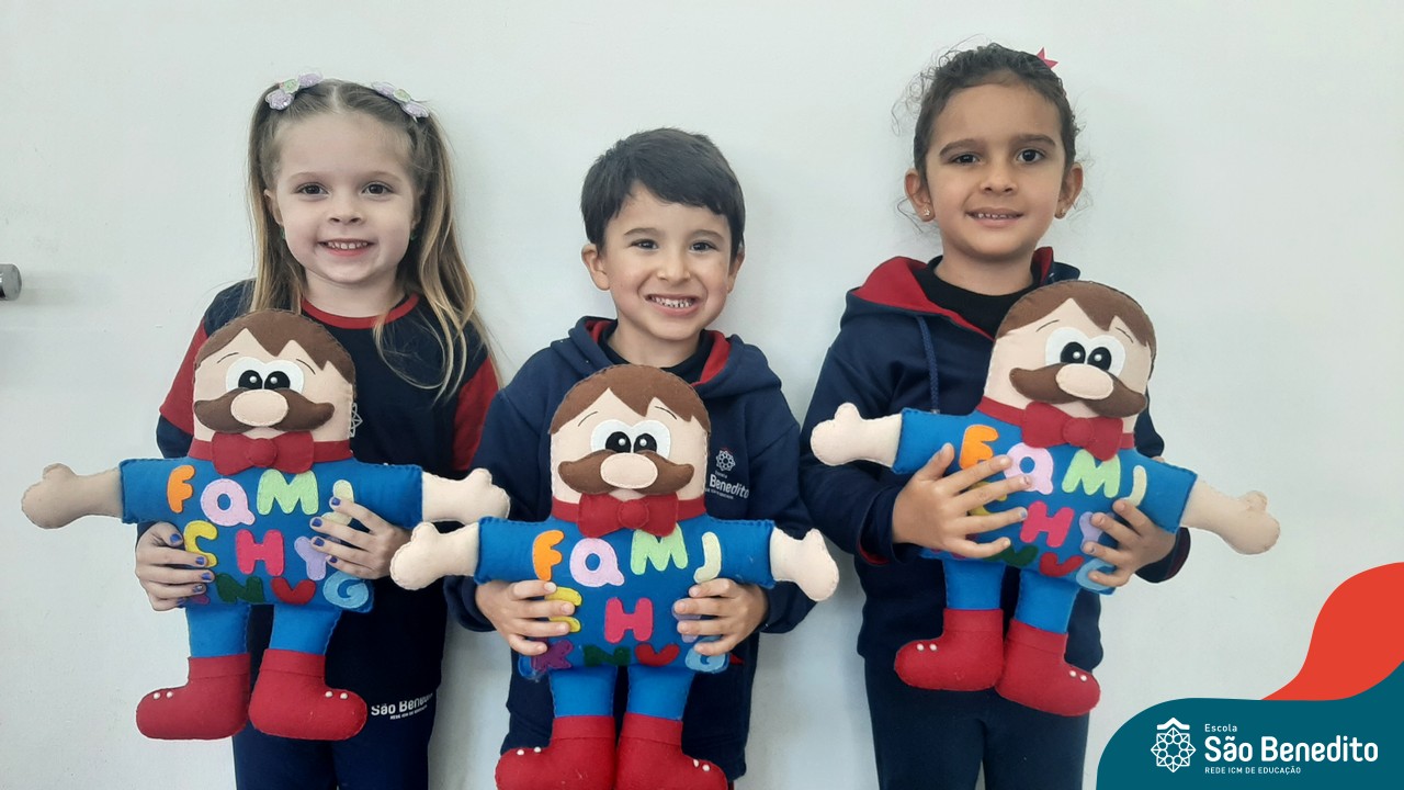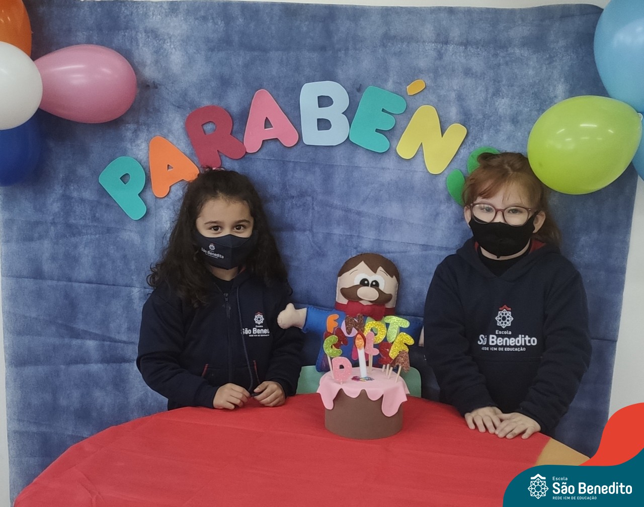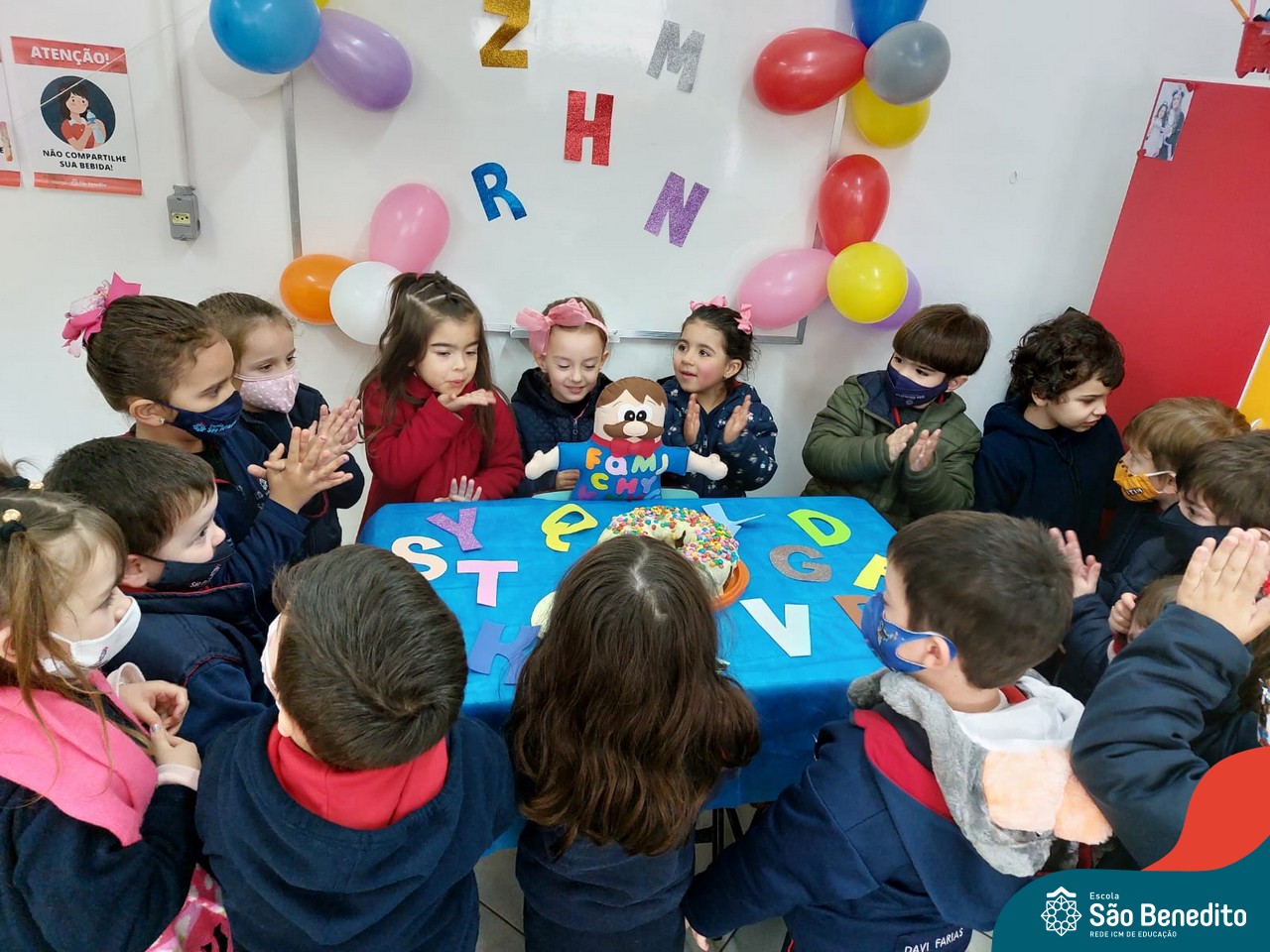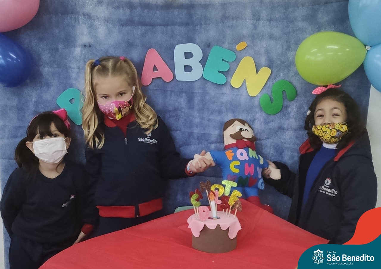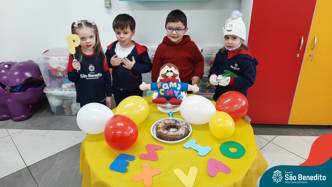 Com base no conto, os estudantes também comemoraram o aniversário do Seu Alfabeto, contando, é claro, com presença ilustre do próprio: o mascotinho recebeu até bolo! E para essa festa ficar ainda mais incrível e recheada de aprendizado, cada dia, os alunos presentearão o amigo com algo que comece com a letra escolhida pelas professoras. Todos os presentes ficarão expostos em sala de aula durante todo o projeto, de forma que os pequenos possam memorizar as letras. Além disso, através dos objetos, será construído um livro do alfabeto, que será entregue às famílias, contendo os registros das atividades, e se transformará em uma linda lembrança desse momento tão importante da infância, que é o início da alfabetização.
