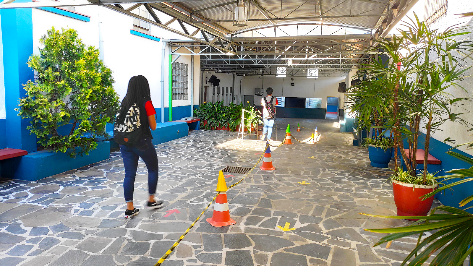 Os alunos são guiados por uma passarela sinalizada, com sentido de entrada e saída, a qual percorrem com distância mínima de 1,5m um do outro.