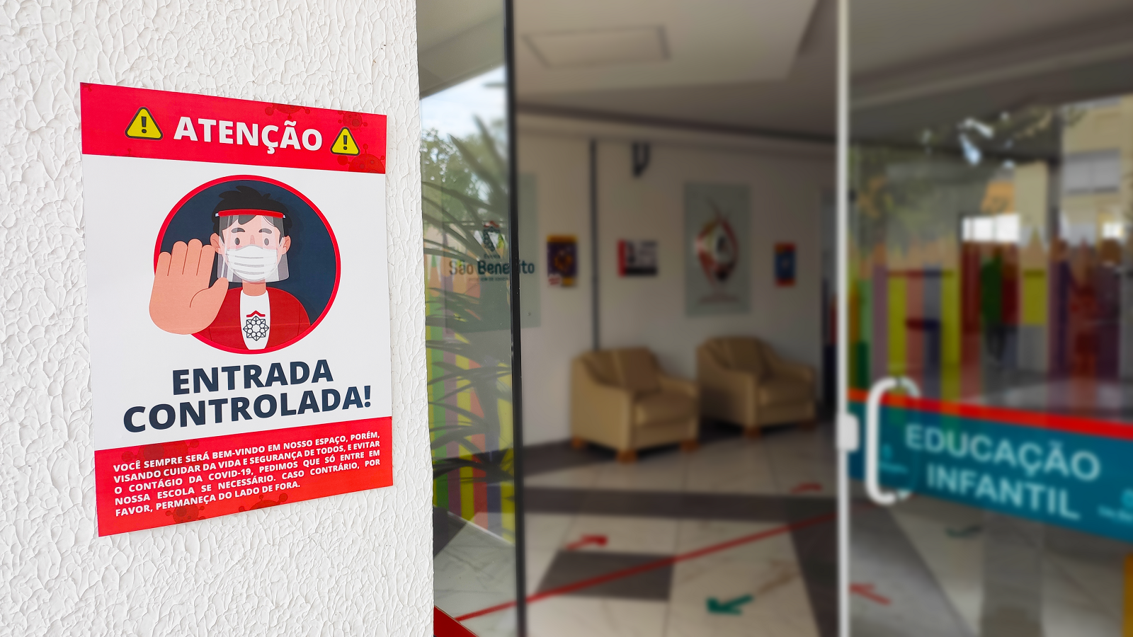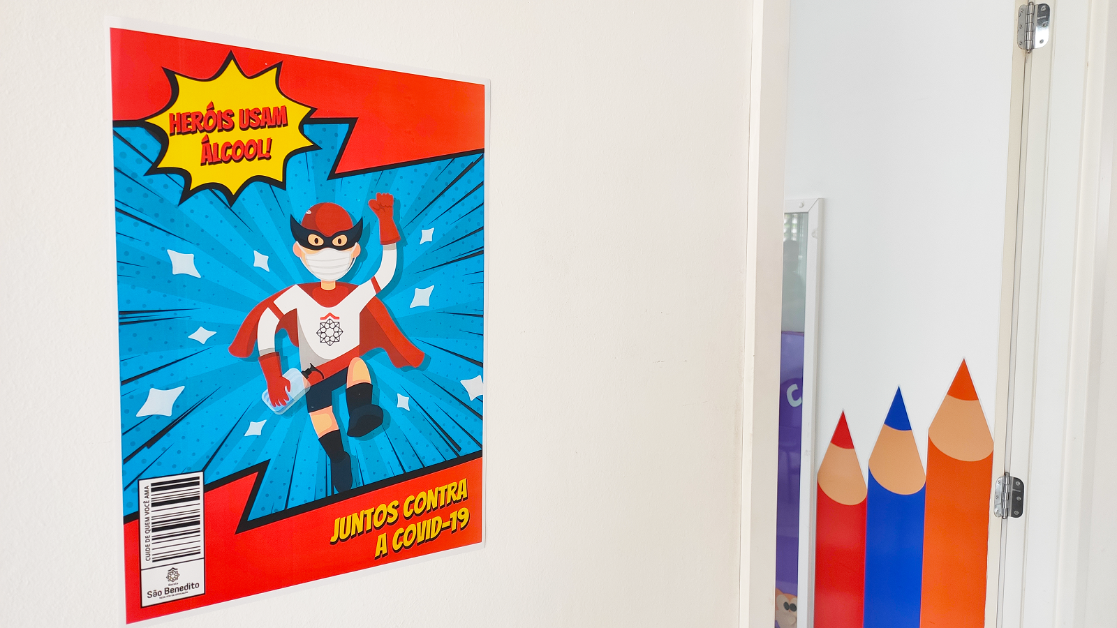 A Escola também conta com sinalização e cartazes alertando sobre as precauções que devem ser tomadas em todas as atividades dos alunos, orientando a não compartilhar lanche, bebida, objetos e materiais, a sempre utilizar máscara, higienizar as mãos e objetos, e a como realizar a troca das máscaras, dentre outros.