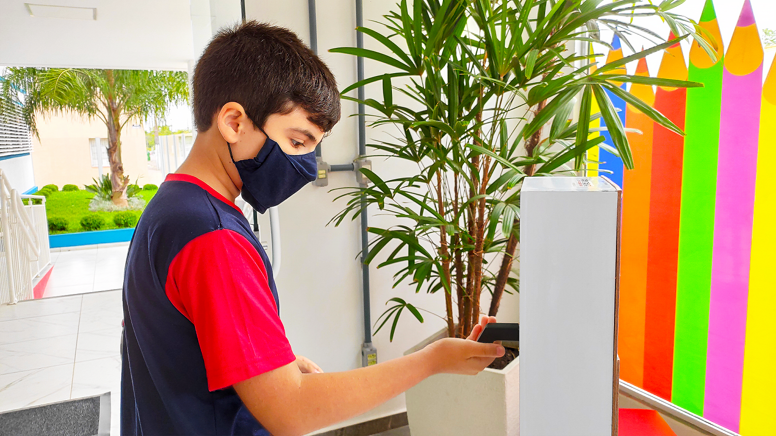 A entrada na Escola é controlada, e todos os alunos e funcionários, ao chegarem, já passam por um circuito de esterilização, onde respeitando o distanciamento, são guiados aos seus destinos.