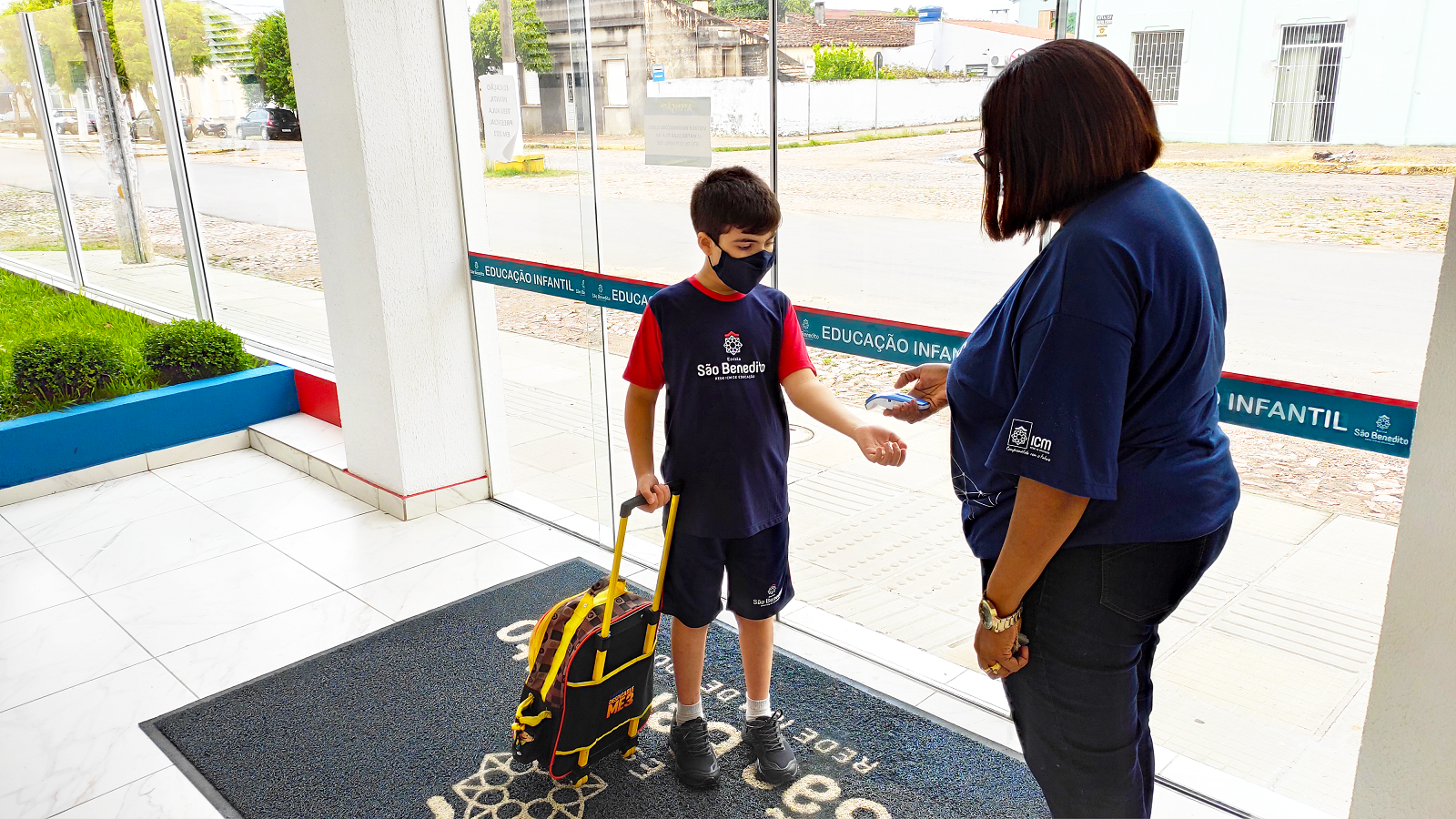 O acesso a Escola só é feito após a medição da temperatura. A seguir, é feita a higienização com álcool.