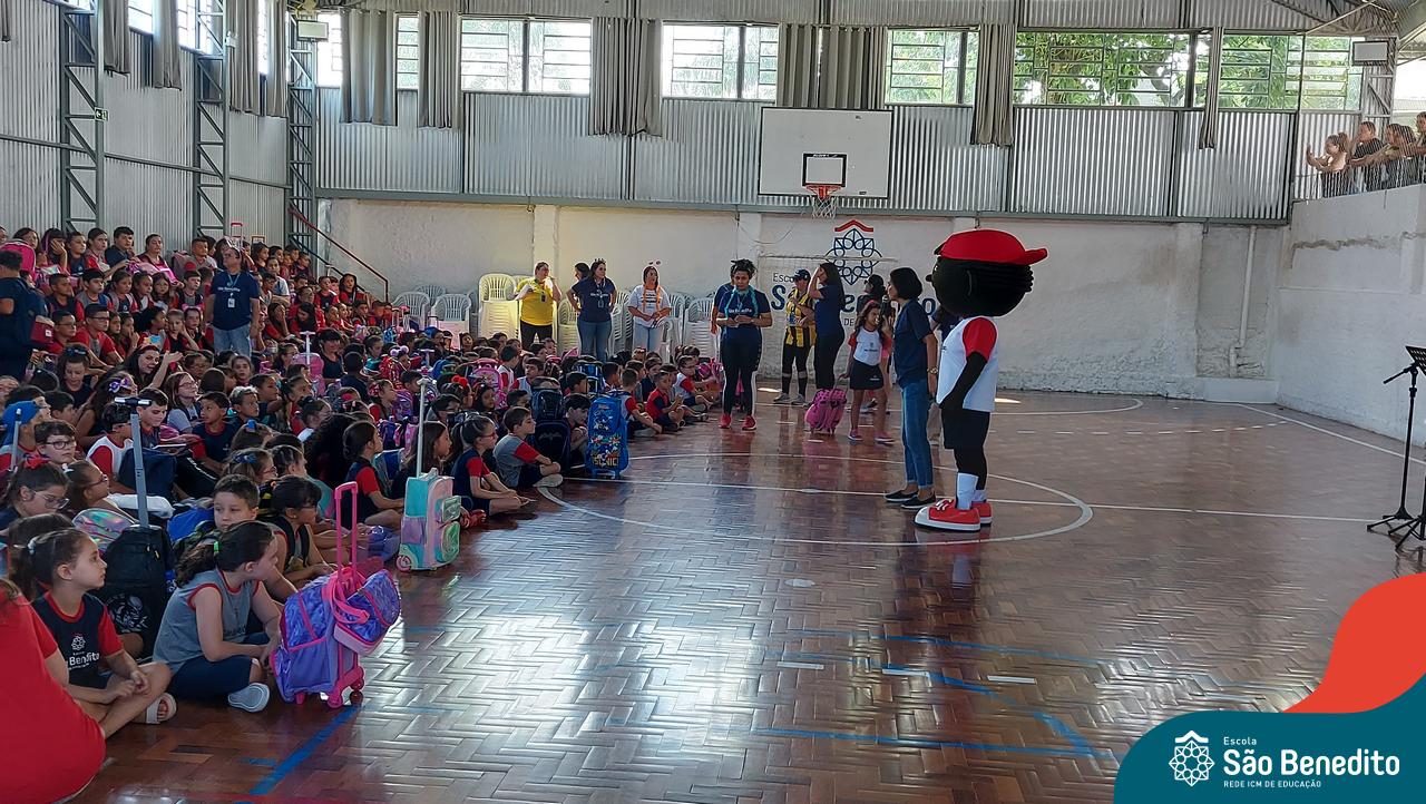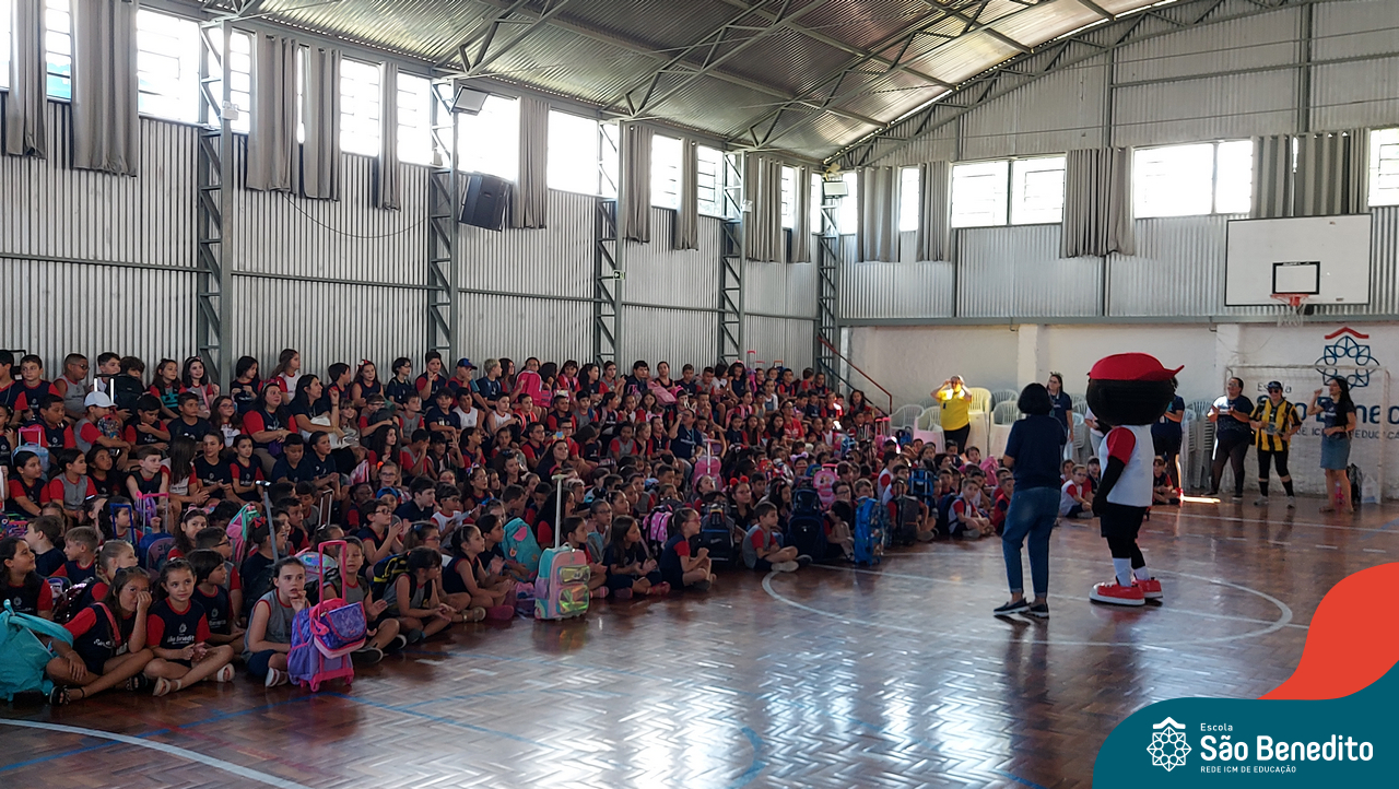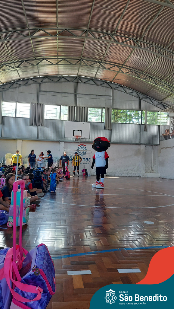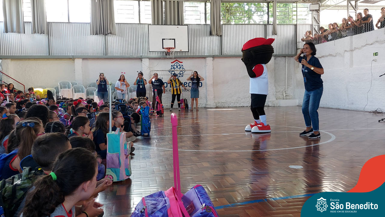 Além de receber a bênção das mochilas, o Ensino Fundamental I foi acolhido pelo mascote Bene, que através da dança e do bom humor, deu início ao ano letivo dos pequenos.