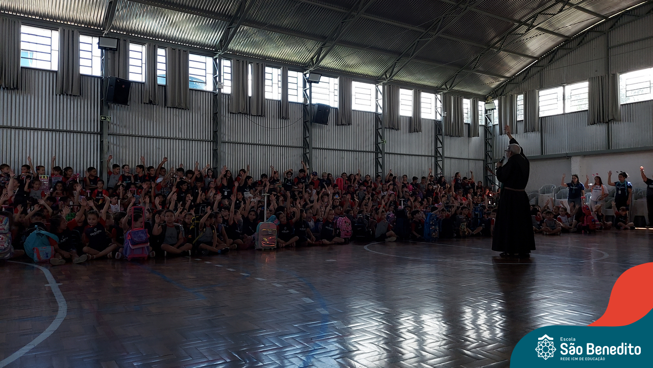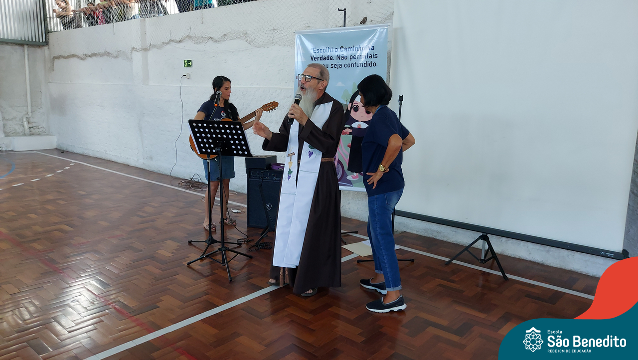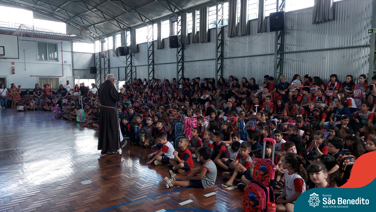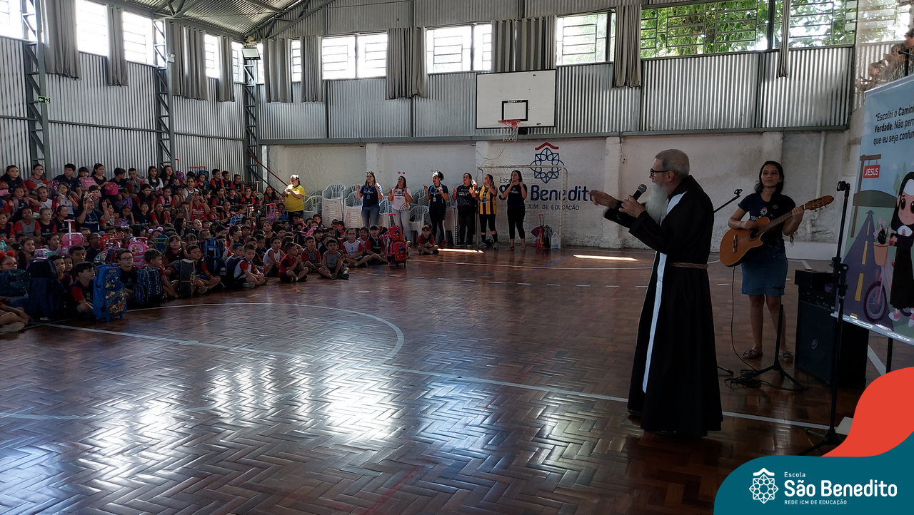 Na acolhida, contamos com a presença do Frei Lori, que concedeu a bênção das mochilas para os estudantes. Além de conter todos os materiais utilizados durante o ano para o crescimento e aprendizado, as mochilas representam os sonhos e projetos que cada um carrega dentro de si.