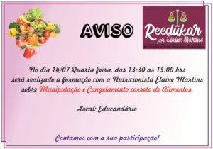 No dia 14/07/2021, recebemos em nosso serviço, a Nutricionista Elaine Martins, para uma formação com as funcionárias da cozinha, apoio e Irmãs sobre Manipulação e Congelamento correto de Alimentos.