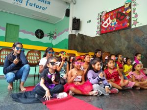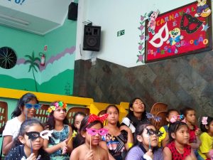 Foi uma festa animada com confete, serpentina e muita alegria! Nossos educandos criaram até cartazes em forma de Carros Alegóricos e cantaram marchinhas antigas de carnaval. Tivemos também um desfile de máscaras feitas por nossos educandos na oficina de Artes e em cada turma.