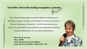 As Irmãs do Imaculado Coração de Maria, convidam à todos a comparecerem na missa de 01 ano do falecimento da nossa querida Irmã Míria. Haverá Celebração Eucarística na Paróquia São José do Belém e logo após, teremos apresentação de músicas da Irmã Míria pelo Coral de São José dos Campos.