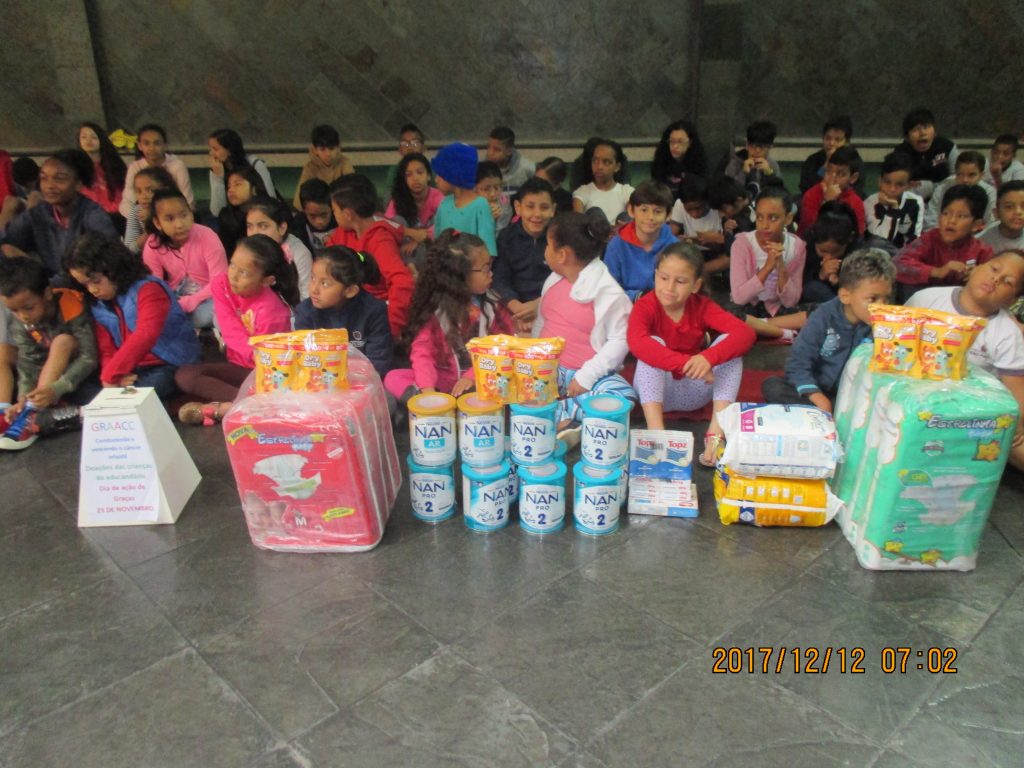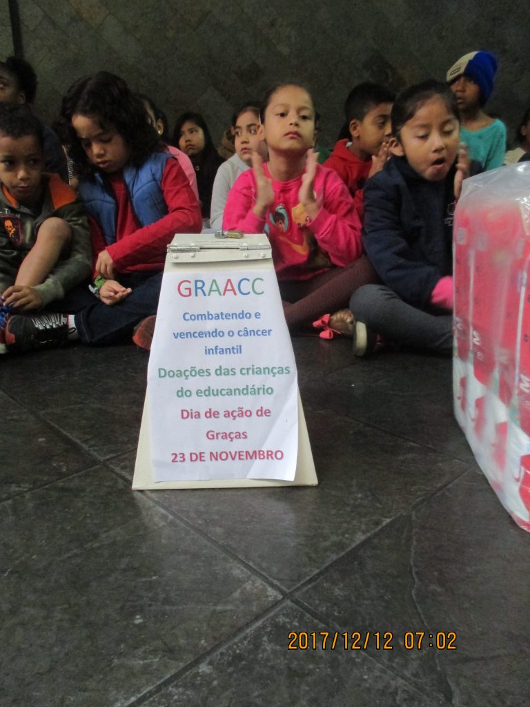 Através de uma ação solidária, por meio de um cofre, durante 2 meses as crianças e educadores colaboraram de coração para a compra de materiais de higiene para uso pessoal e alimentação. O Educandário São José do Belém realizou a aquisição dos materiais para o hospital GRAACC(Grupo de Apoio ao Adolescente e à Criança com Câncer) com o dinheiro arrecadado . Provando que mesmo tendo pouco como nossas crianças, é possível sim partilhar com outras crianças que necessitam. Um belo exemplo!