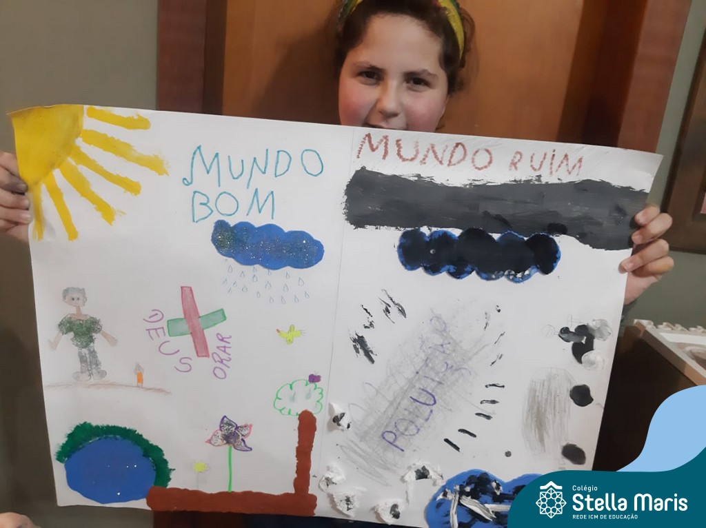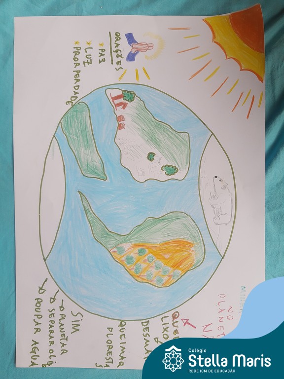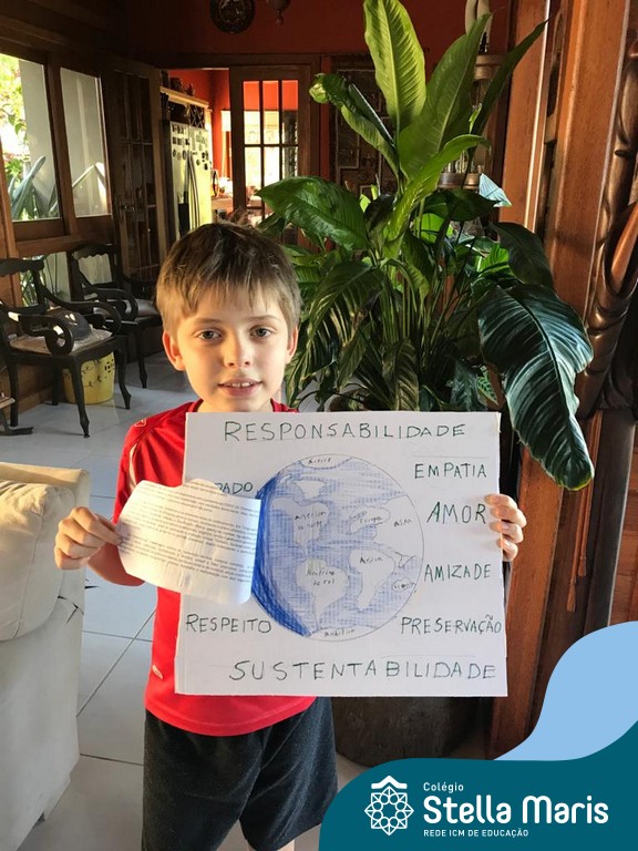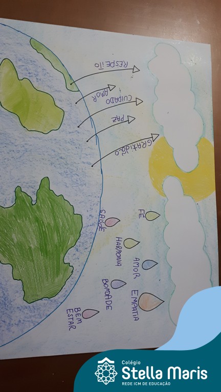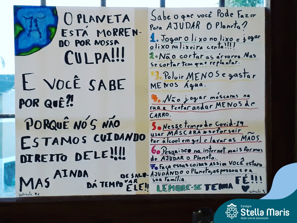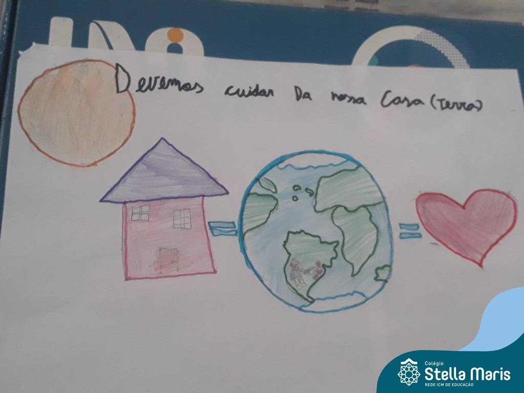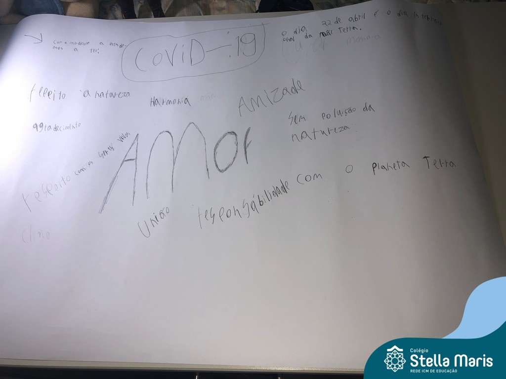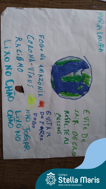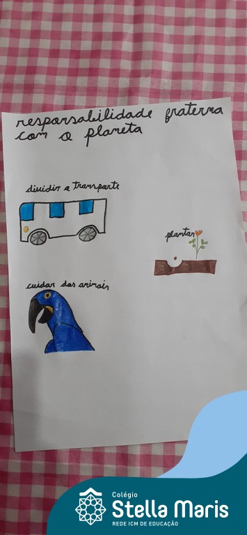 Após a reflexão do texto e análise de vídeos sobre os impactos da pandemia, os alunos dos 4º anos apresentaram um lindo trabalho. E através de cartazes, responderam às perguntas e representaram a responsabilidade fraterna diante da criação (planeta):