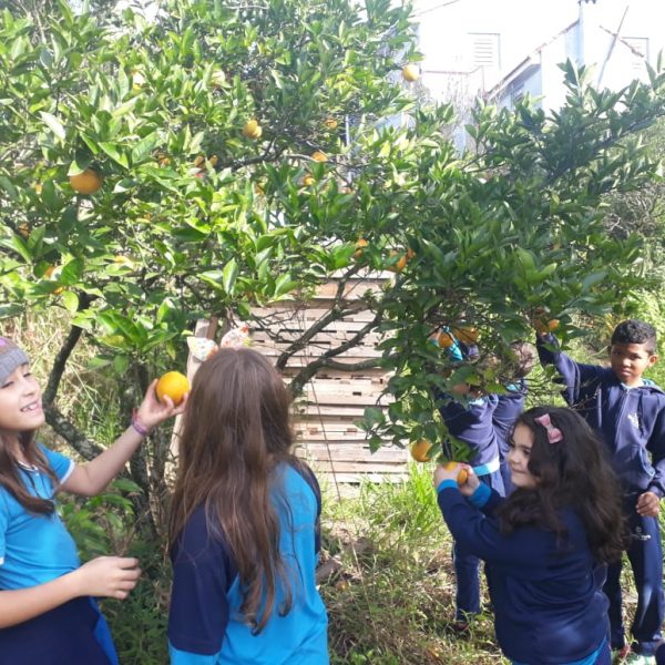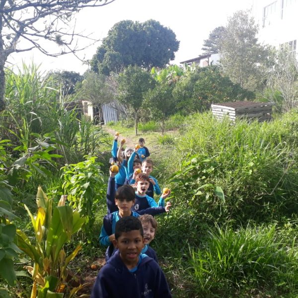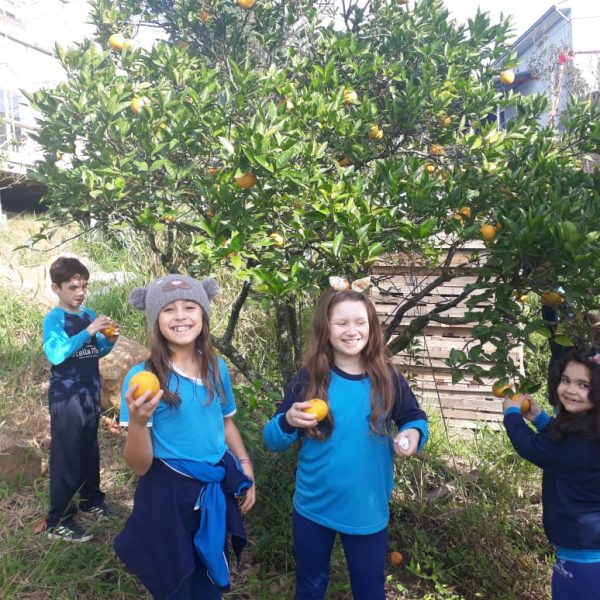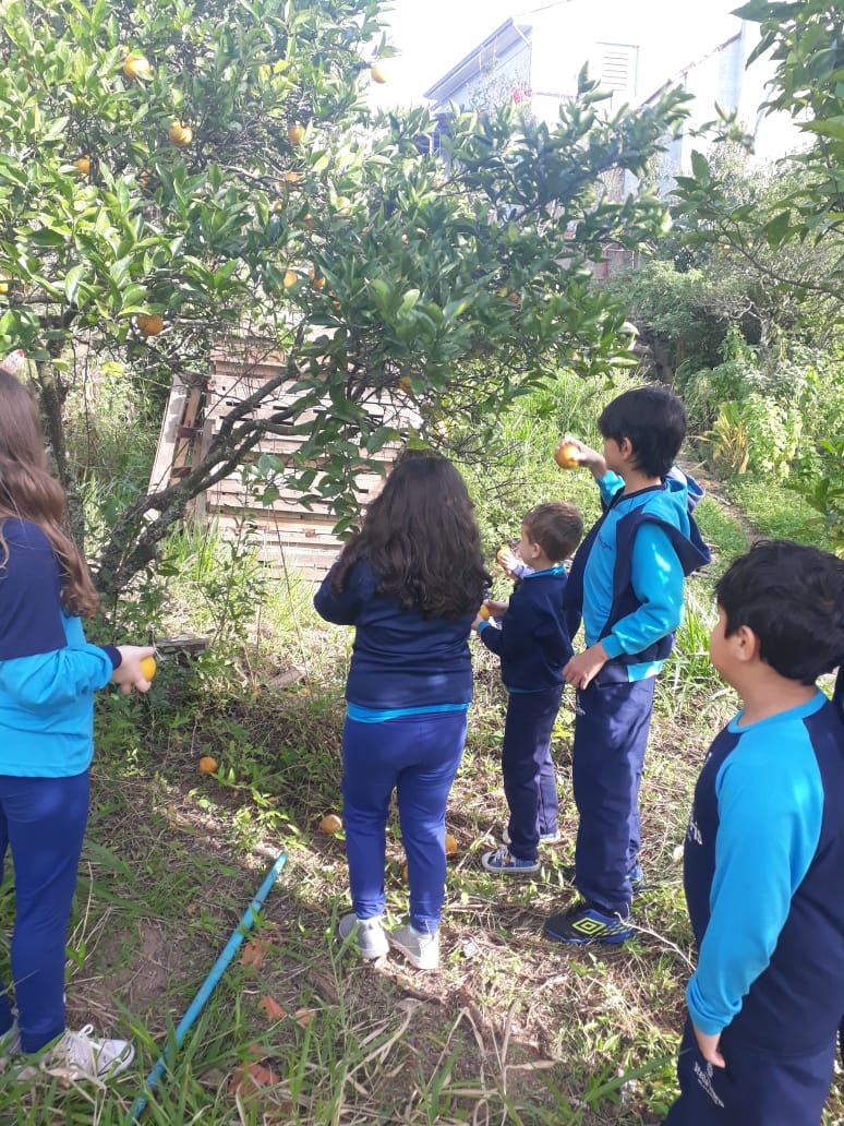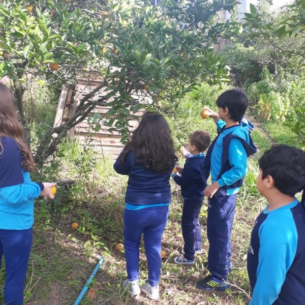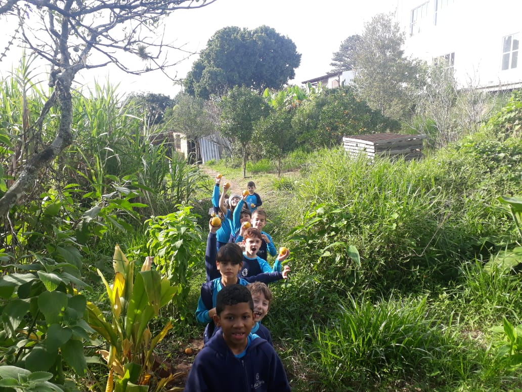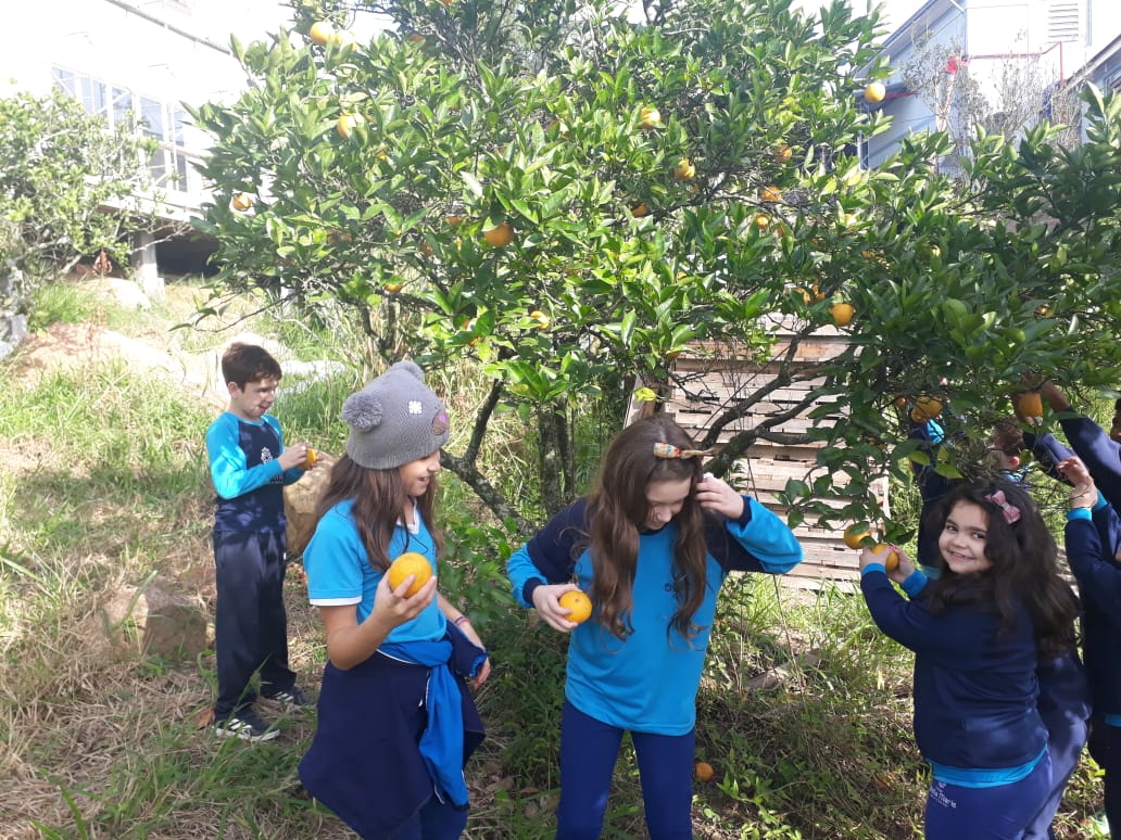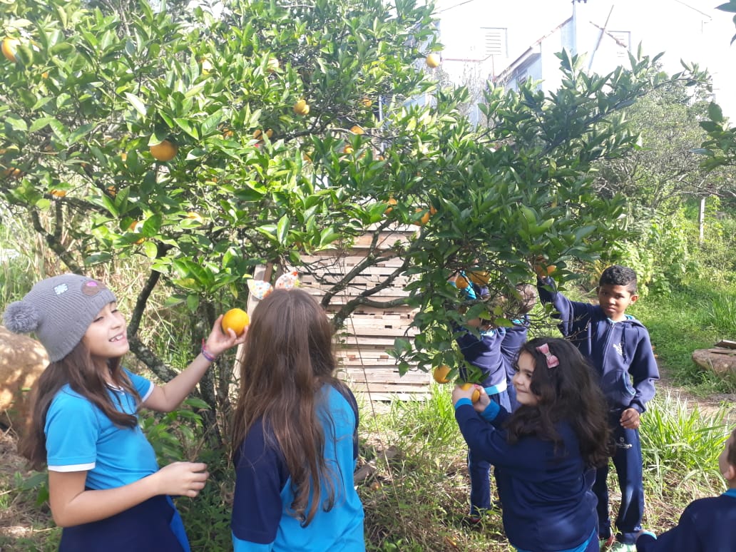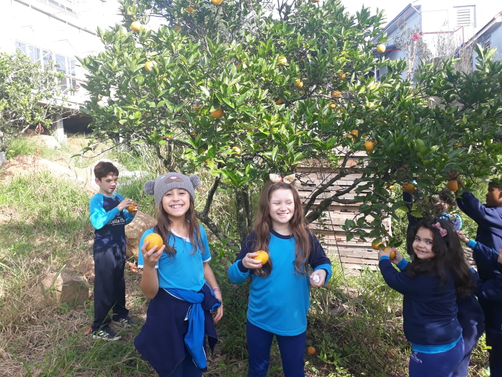 A turma da Atividade Extracurricular aproveitou a linda manhã de sol para visitar a horta e também saborear as deliciosas laranjas que colheram!