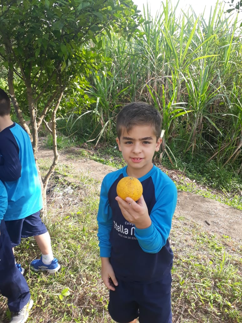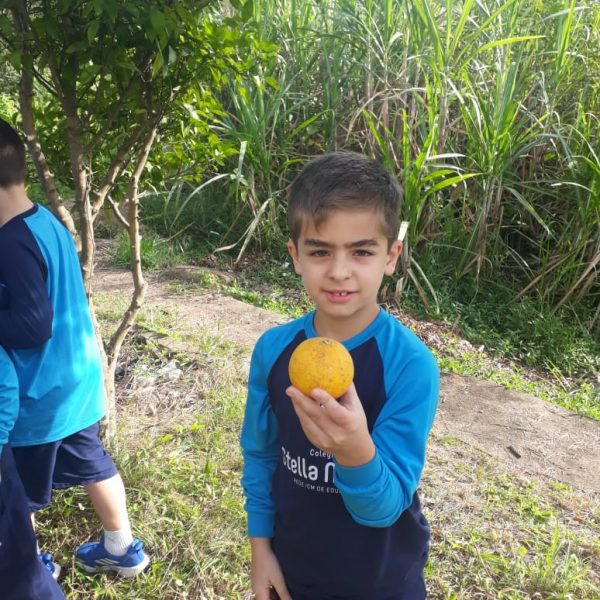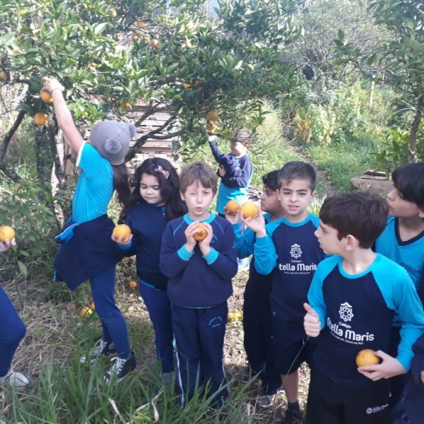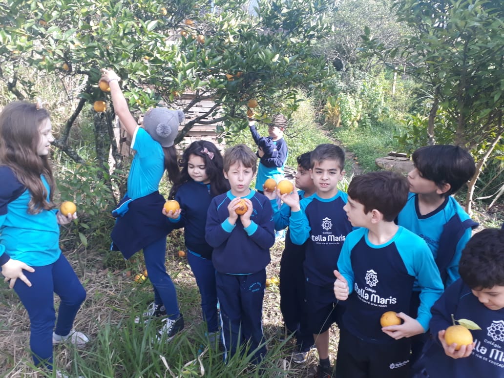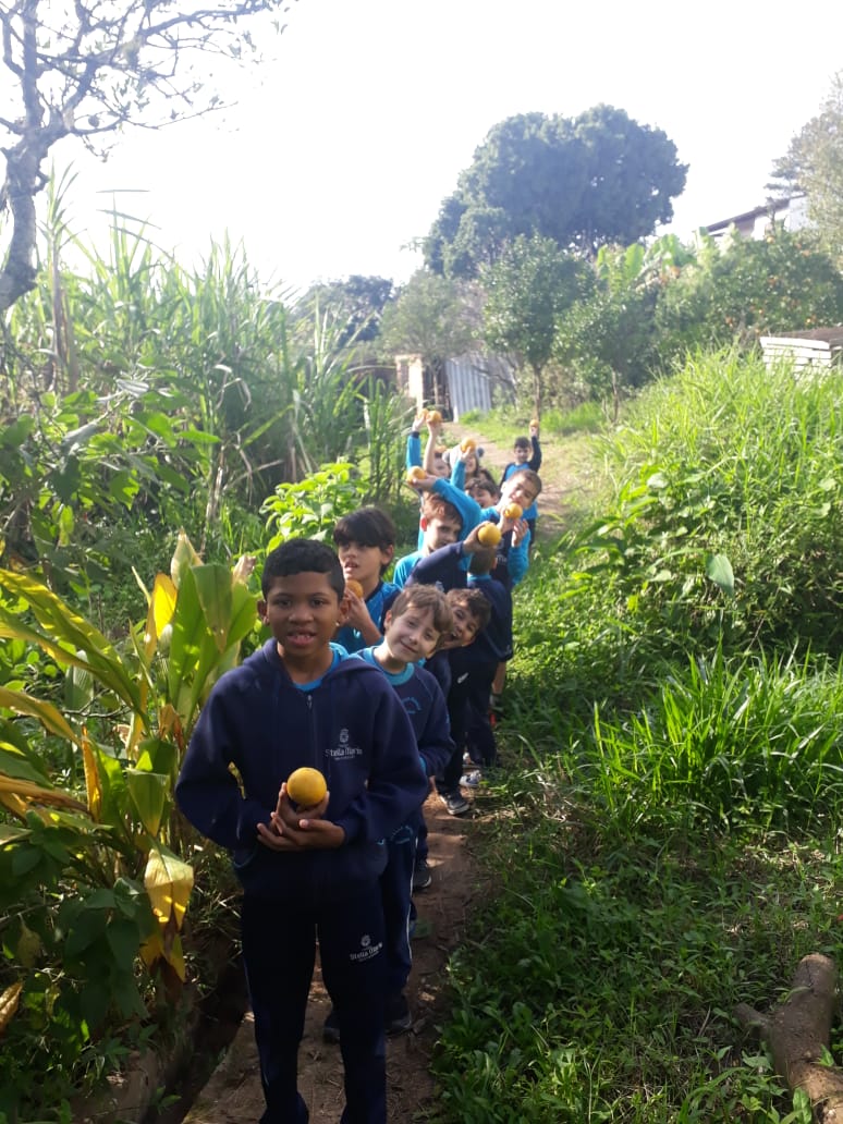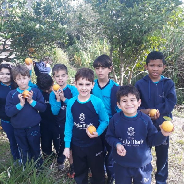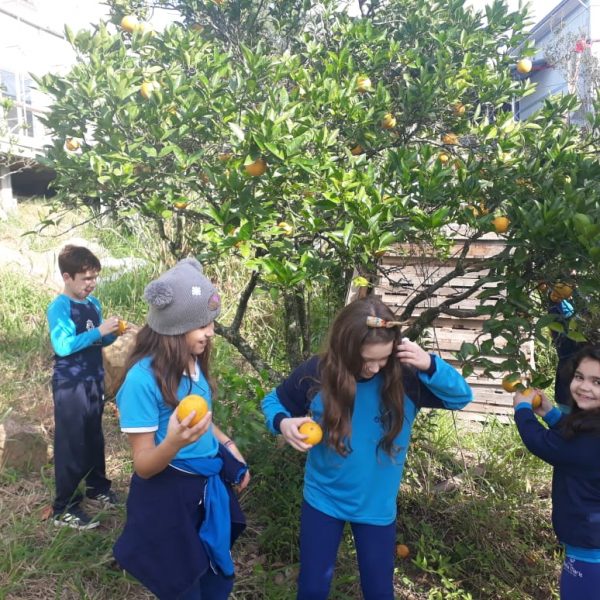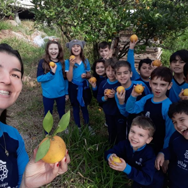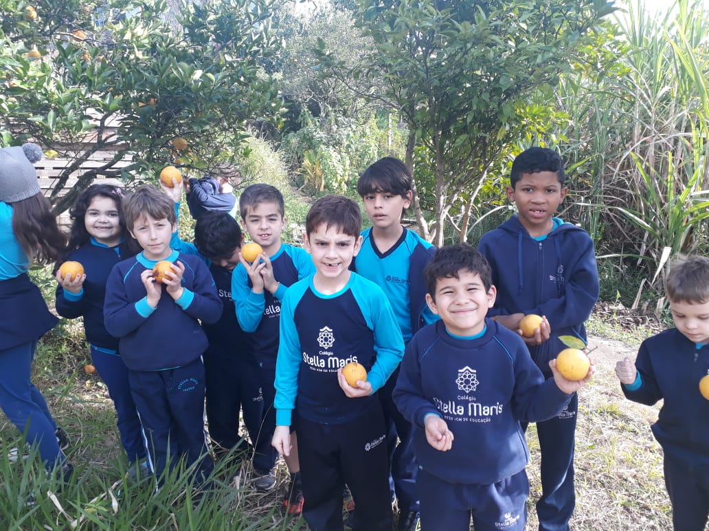 A turma da Atividade Extracurricular aproveitou a linda manhã de sol para visitar a horta e também saborear as deliciosas laranjas que colheram!