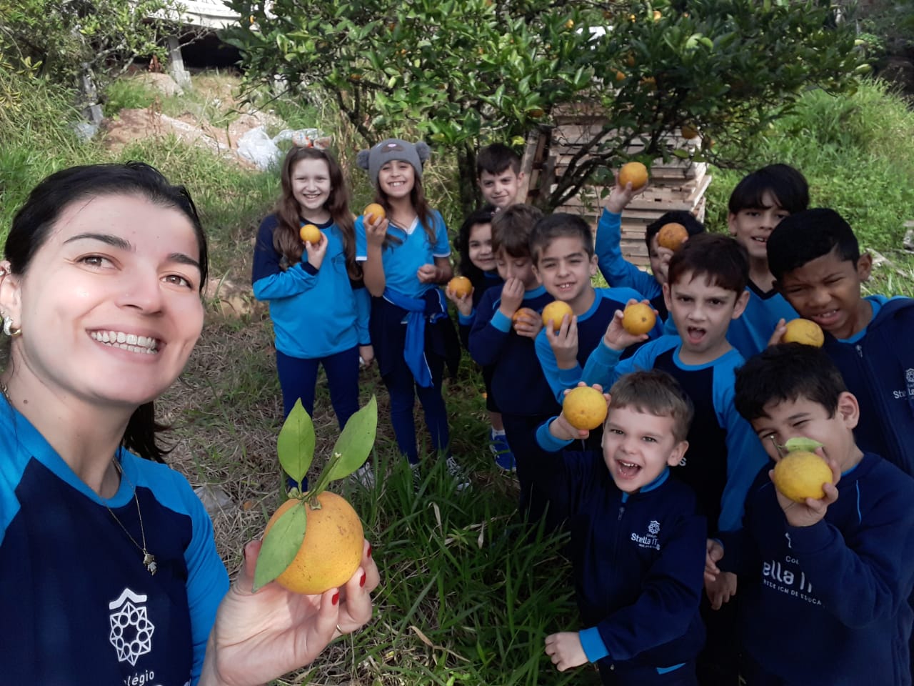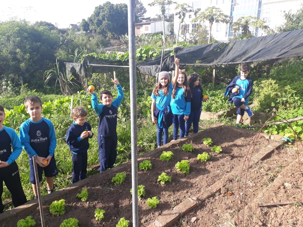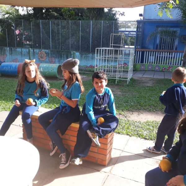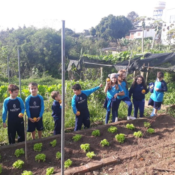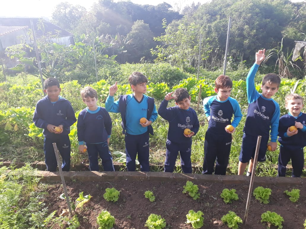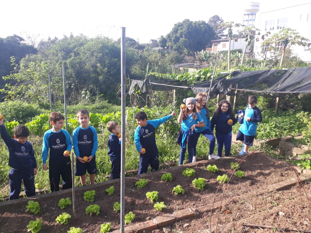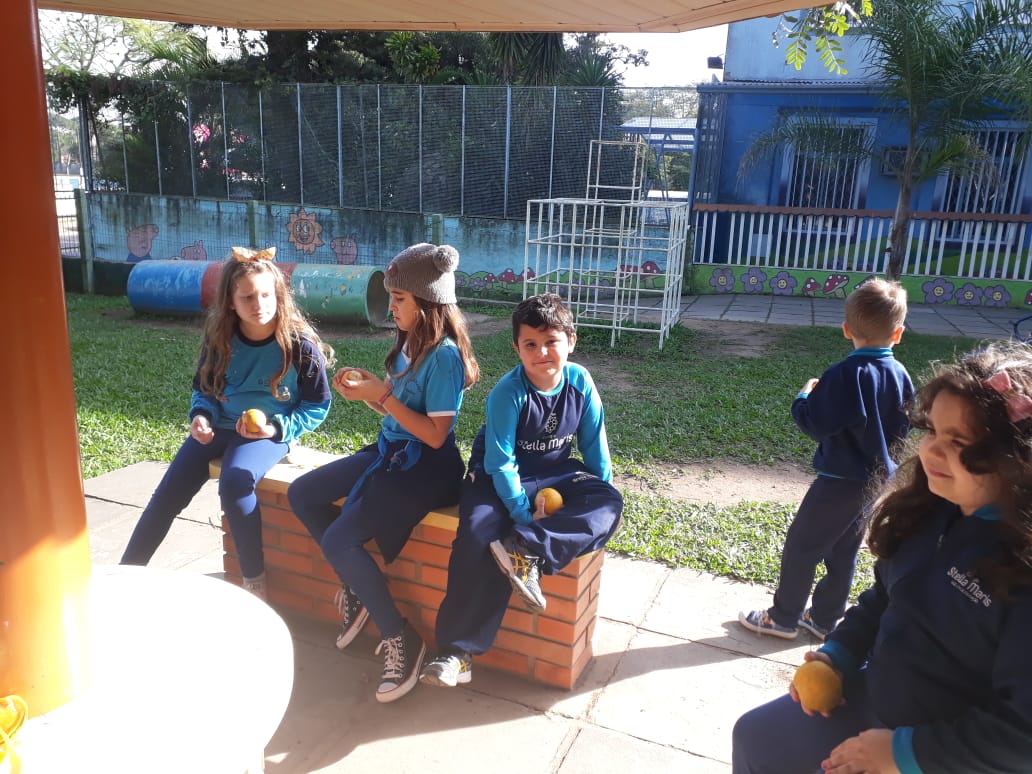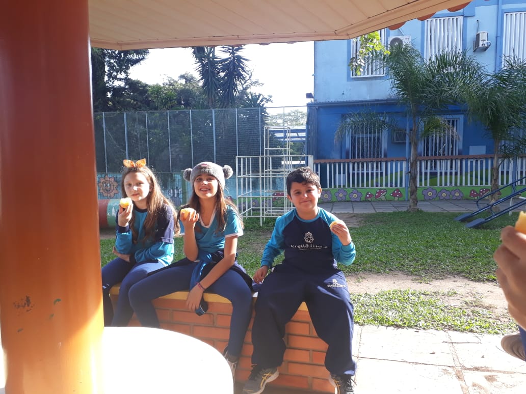 A turma da Atividade Extracurricular aproveitou a linda manhã de sol para visitar a horta e também saborear as deliciosas laranjas que colheram!