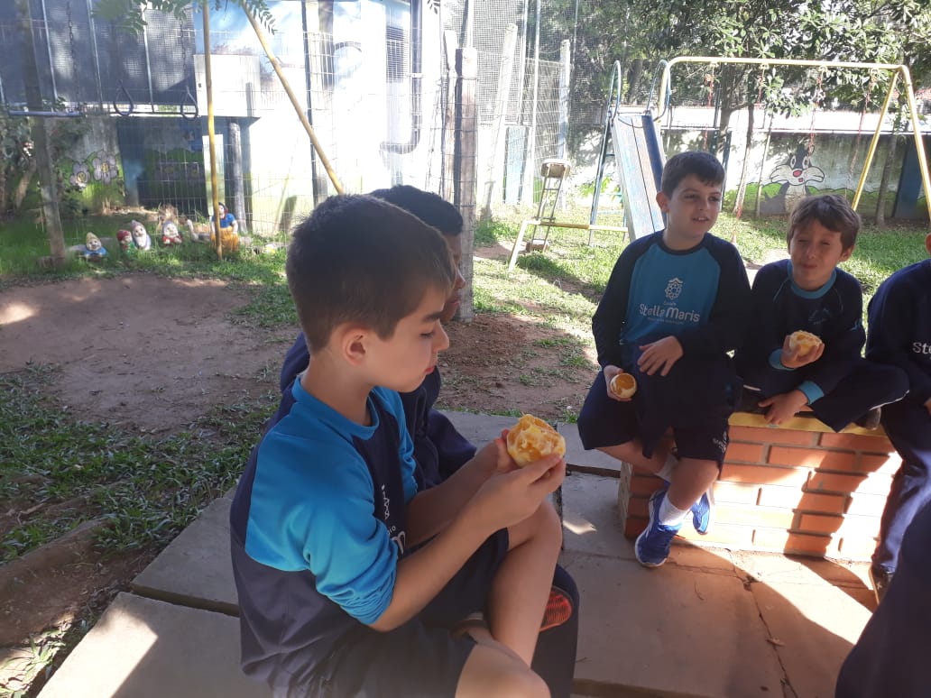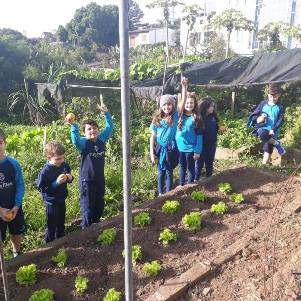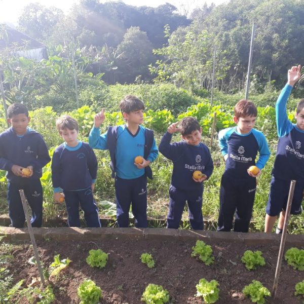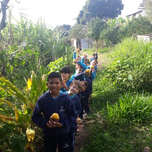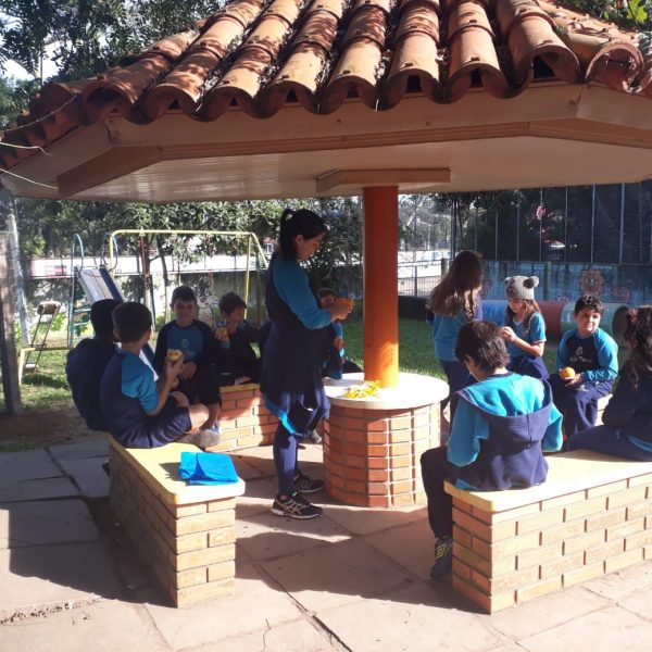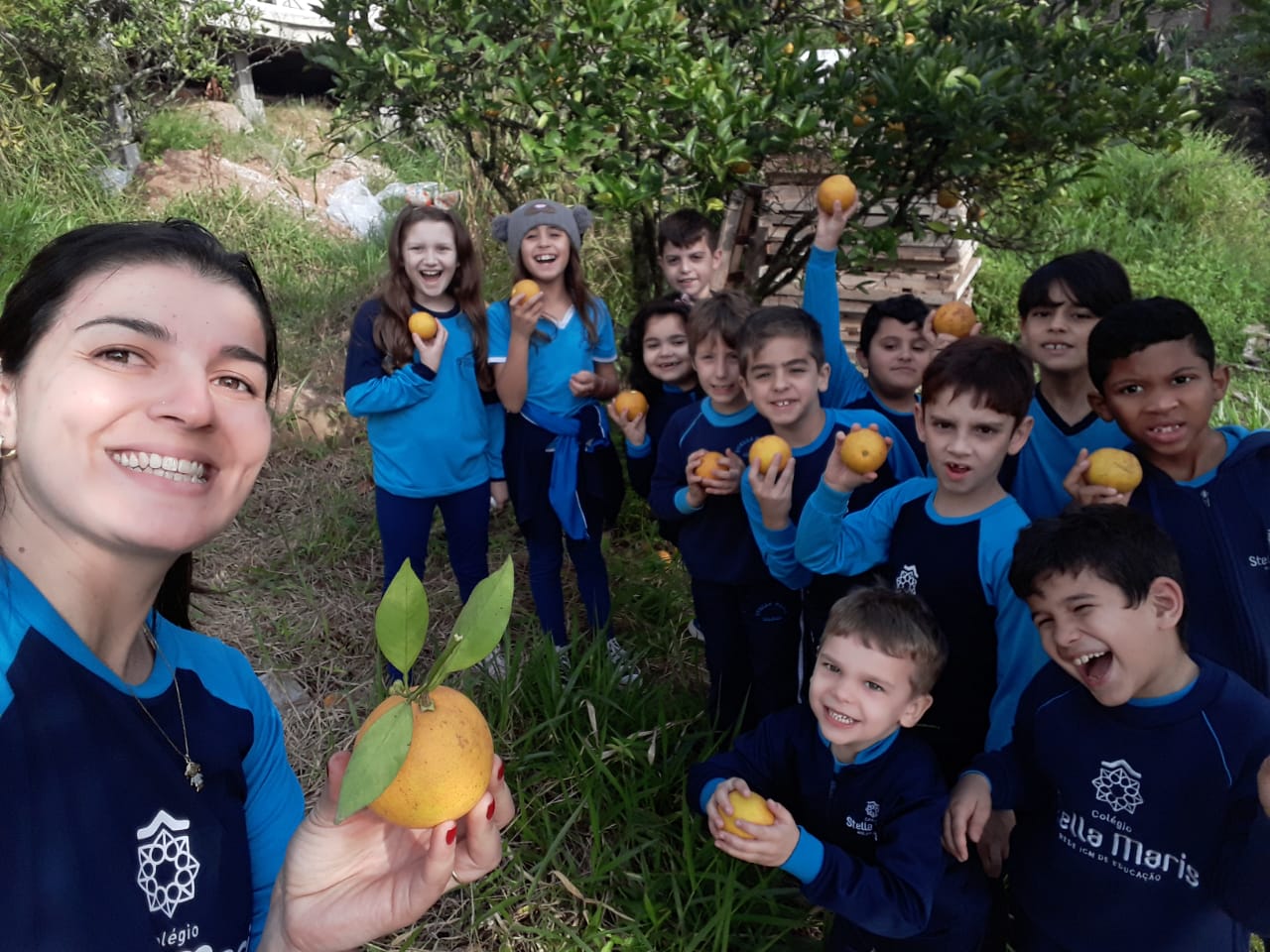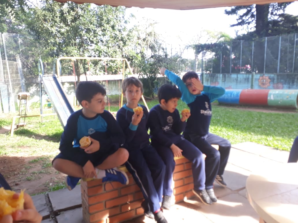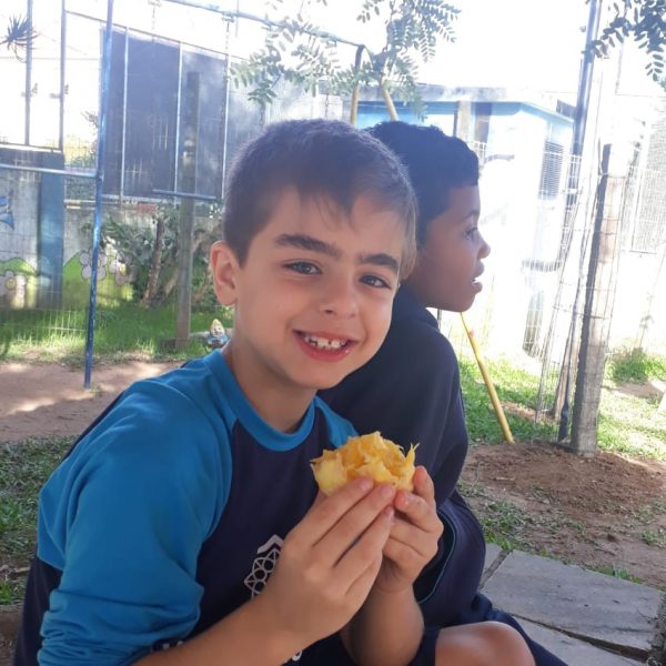 A turma da Atividade Extracurricular aproveitou a linda manhã de sol para visitar a horta e também saborear as deliciosas laranjas que colheram!