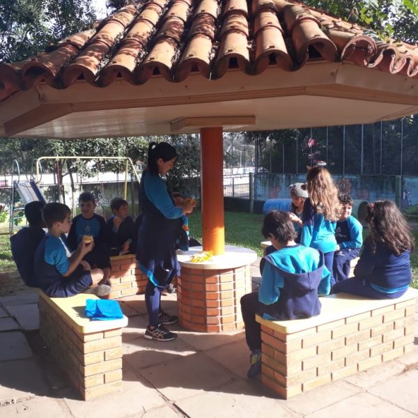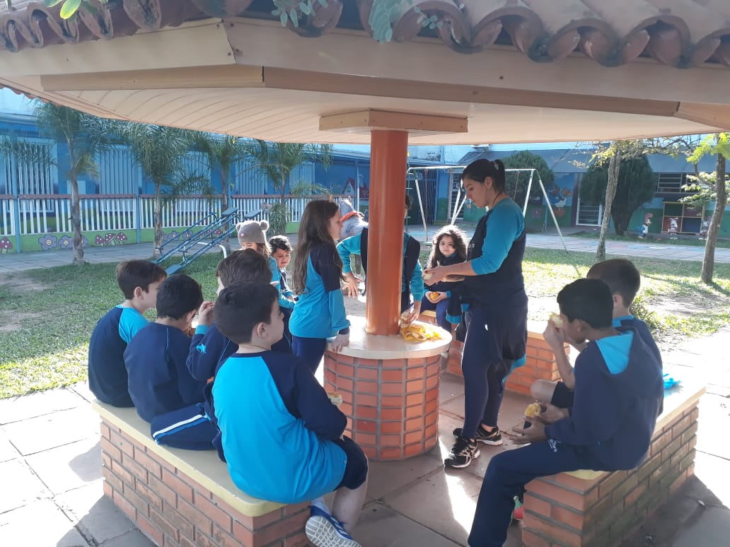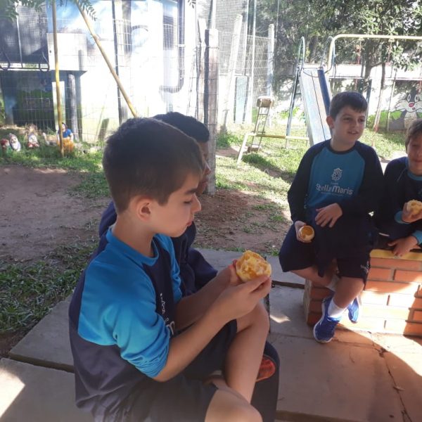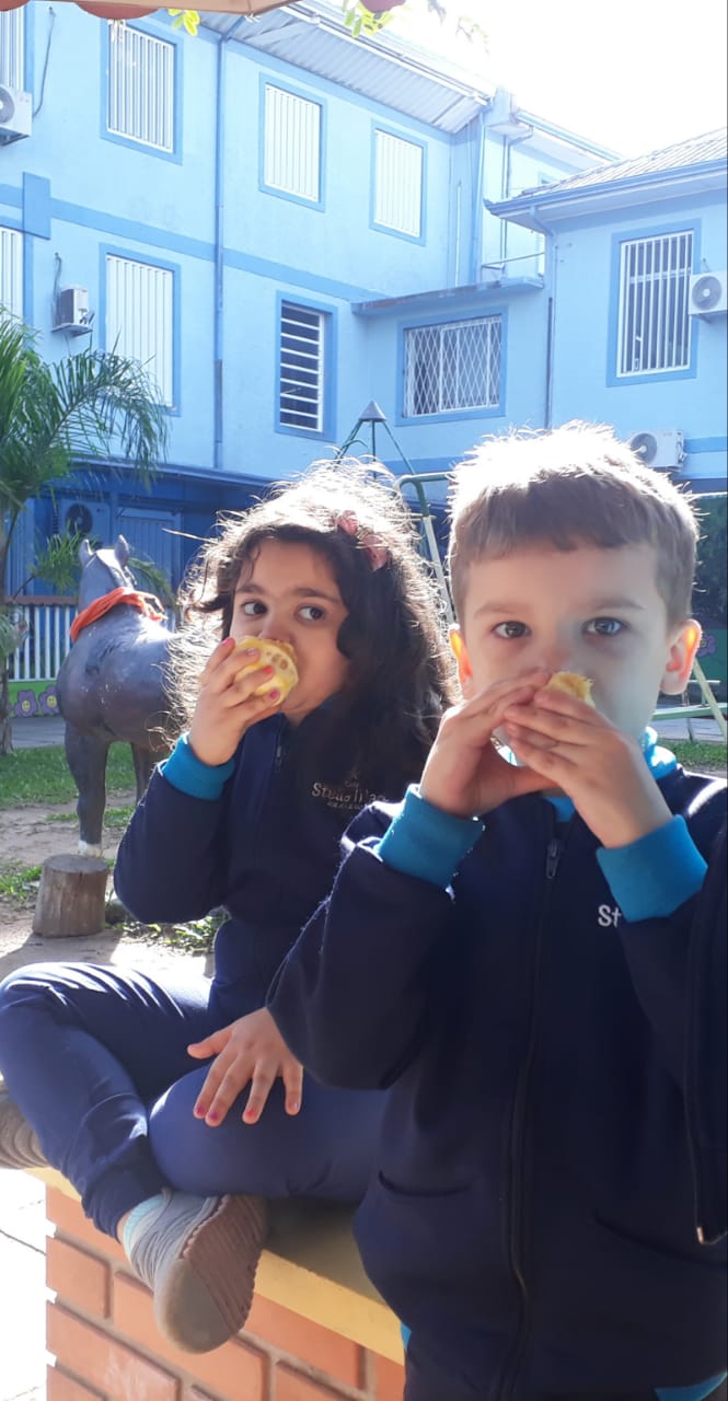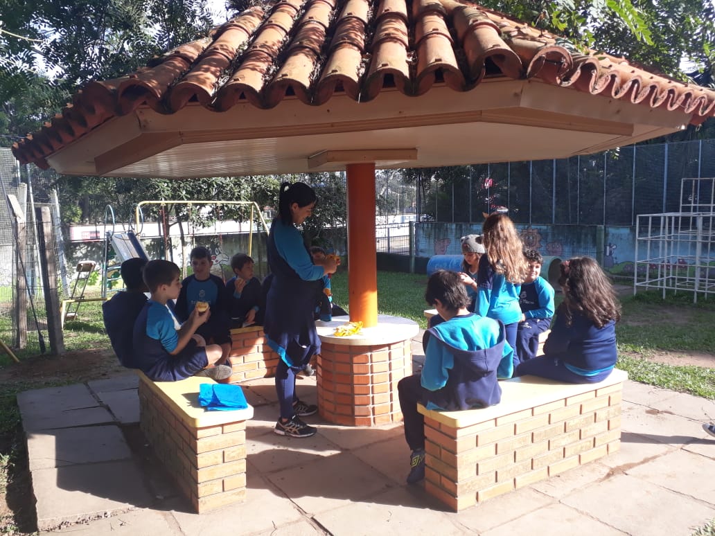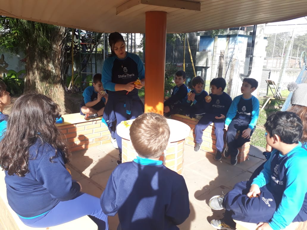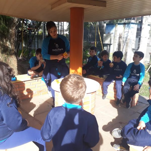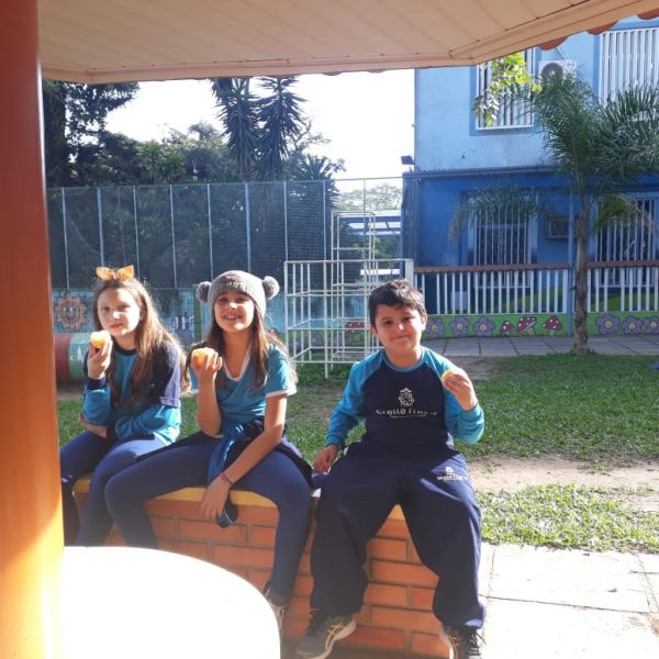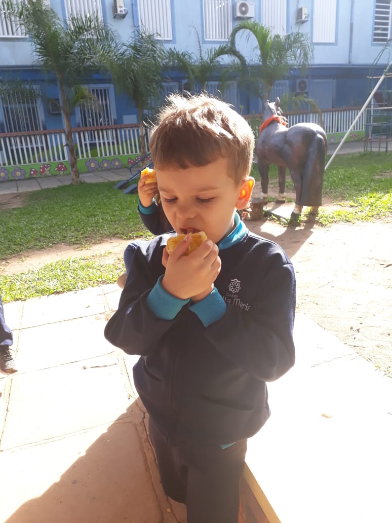 A turma da Atividade Extracurricular aproveitou a linda manhã de sol para visitar a horta e também saborear as deliciosas laranjas que colheram!