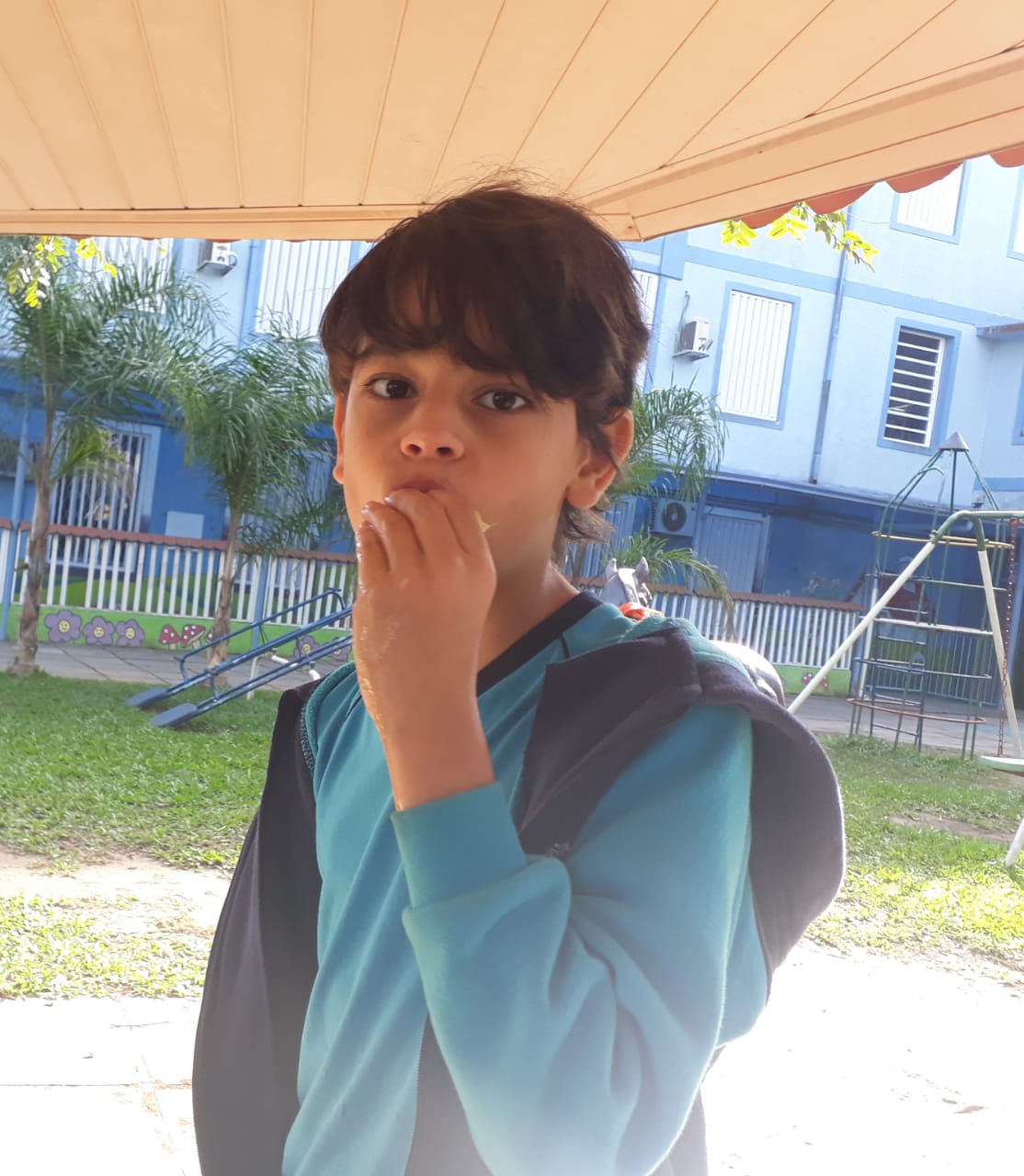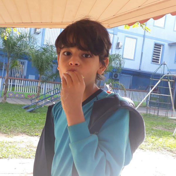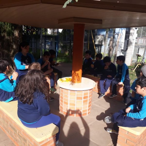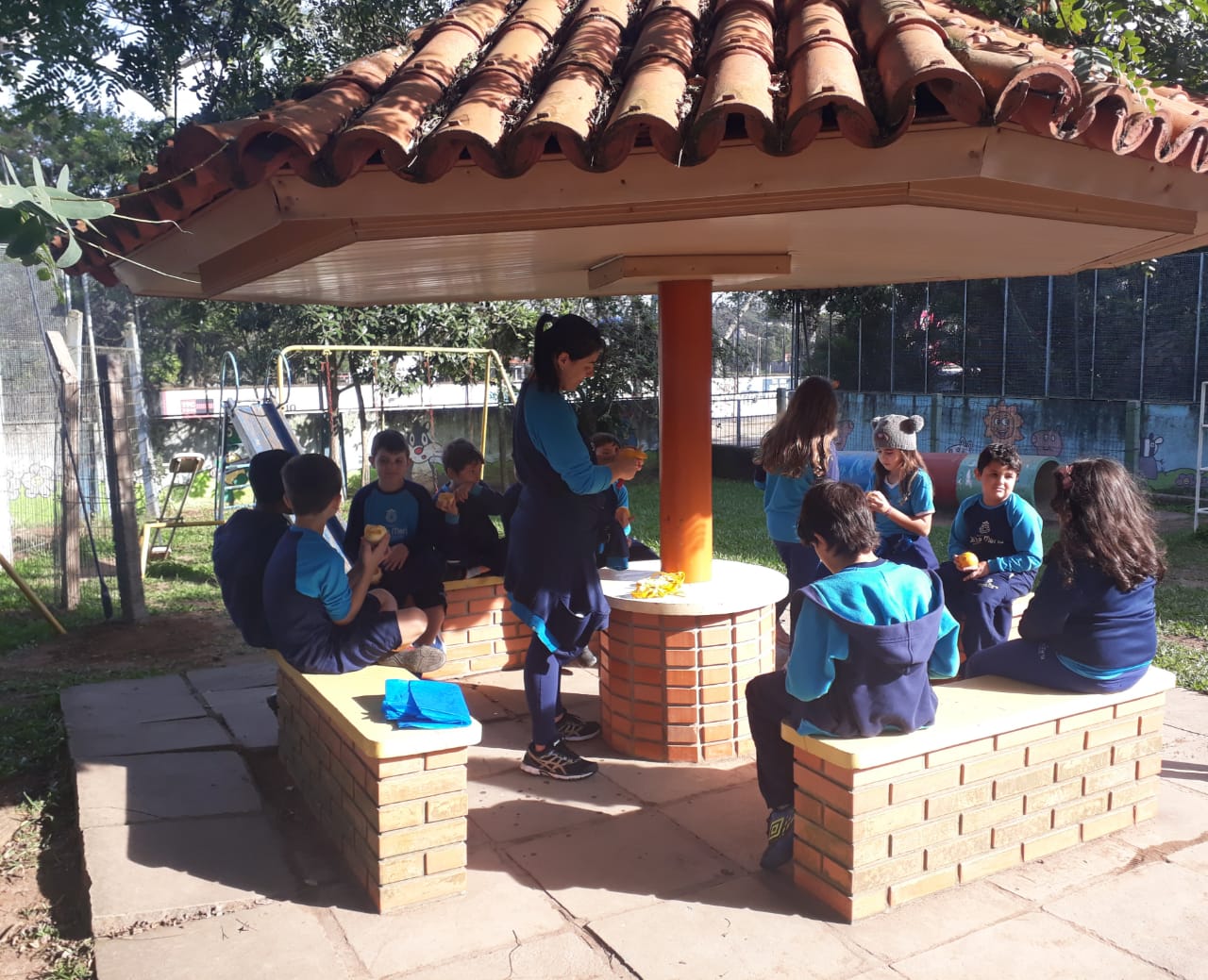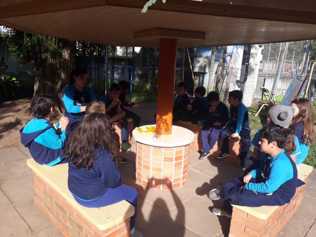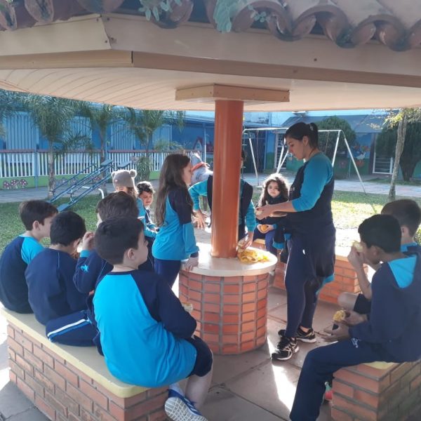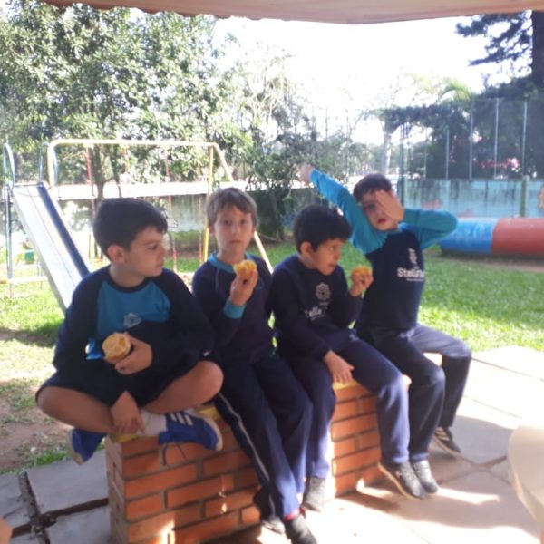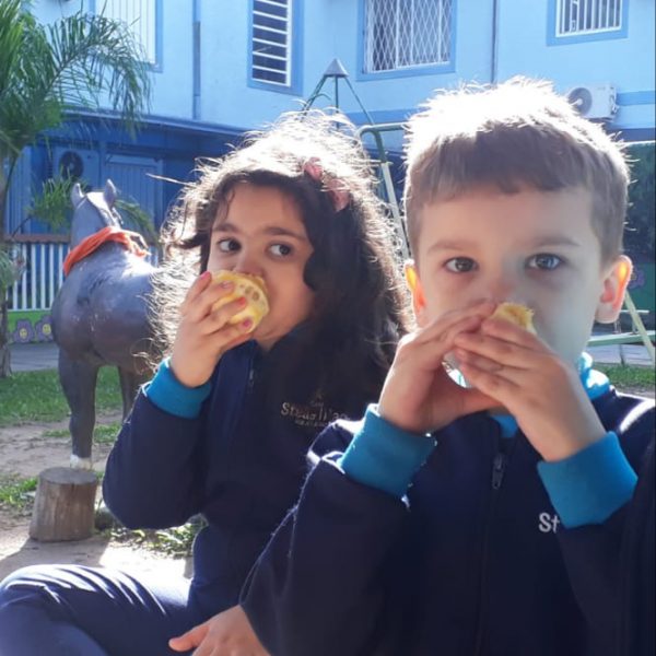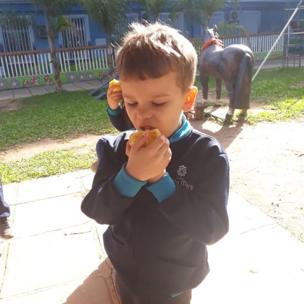 A turma da Atividade Extracurricular aproveitou a linda manhã de sol para visitar a horta e também saborear as deliciosas laranjas que colheram!