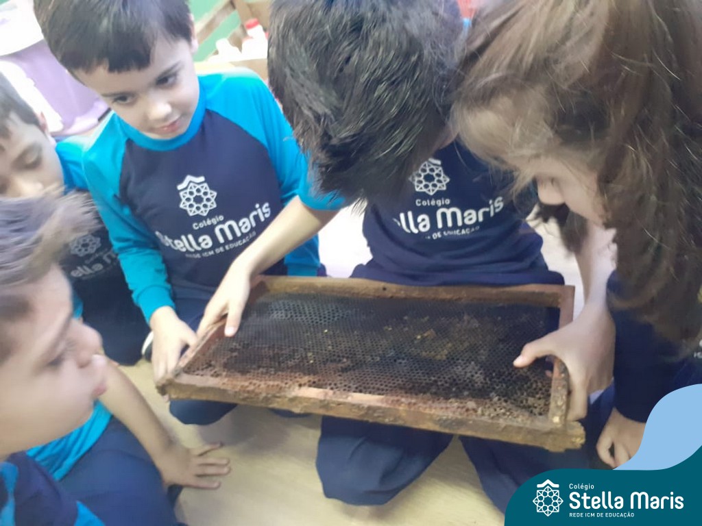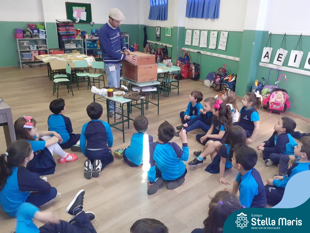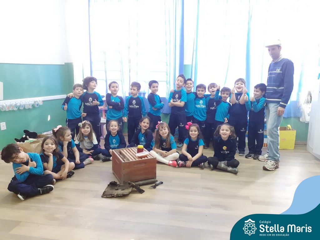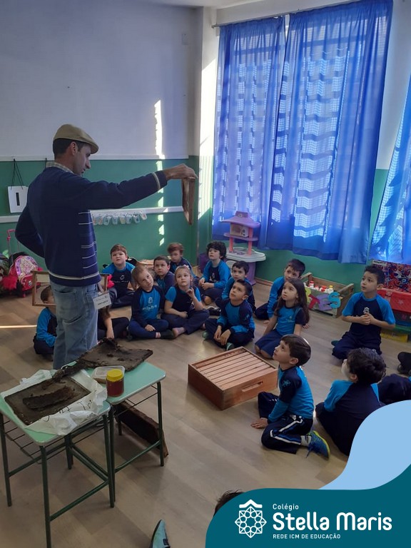 A turma do Pré 2B está com o projeto Abelhas: sua vida e produtividade. Para contribuir com nossas aprendizagens sobre esse inseto tão importante para a vida do ser humano e do mundo, o Alex, pai do estudante Nicollas, trouxe até nossa sala uma caixa coletora de mel. Ele nos ensinou como as abelhas se organizam e o processo para a produção do mel.