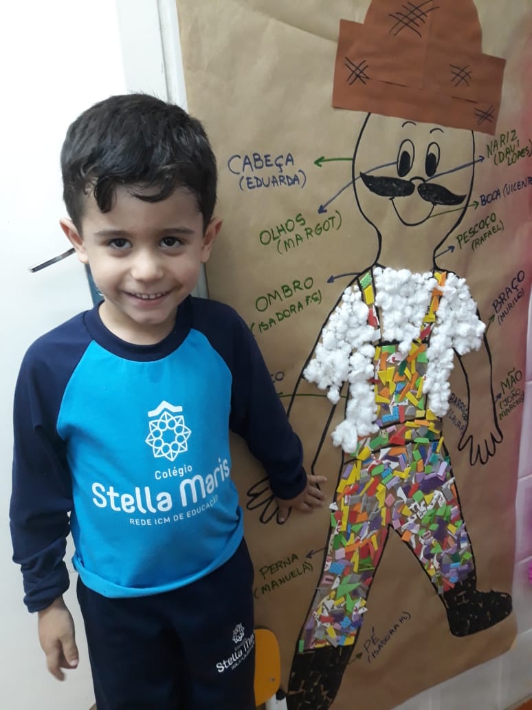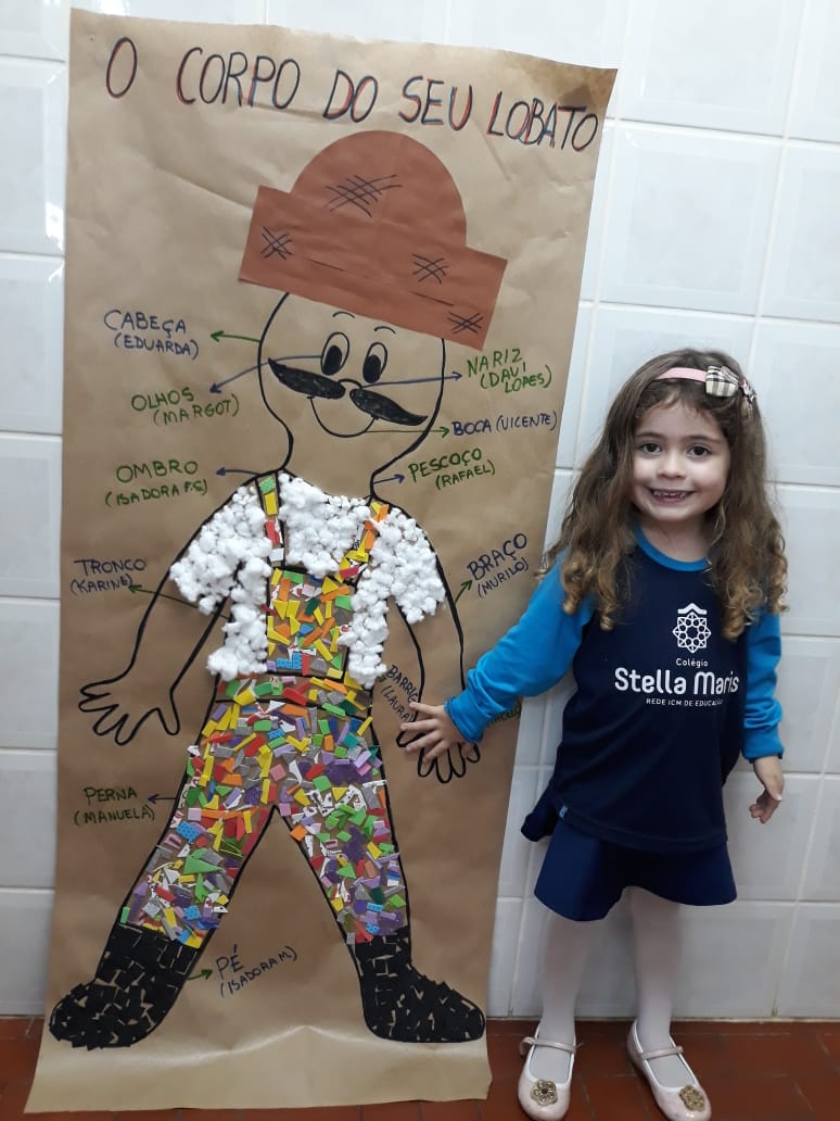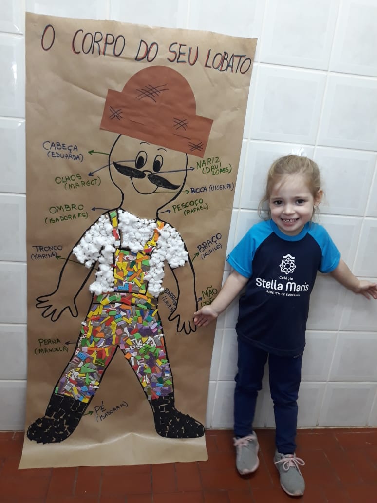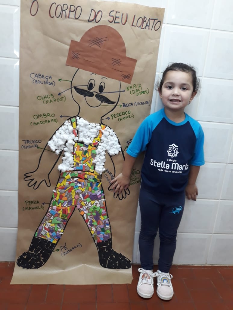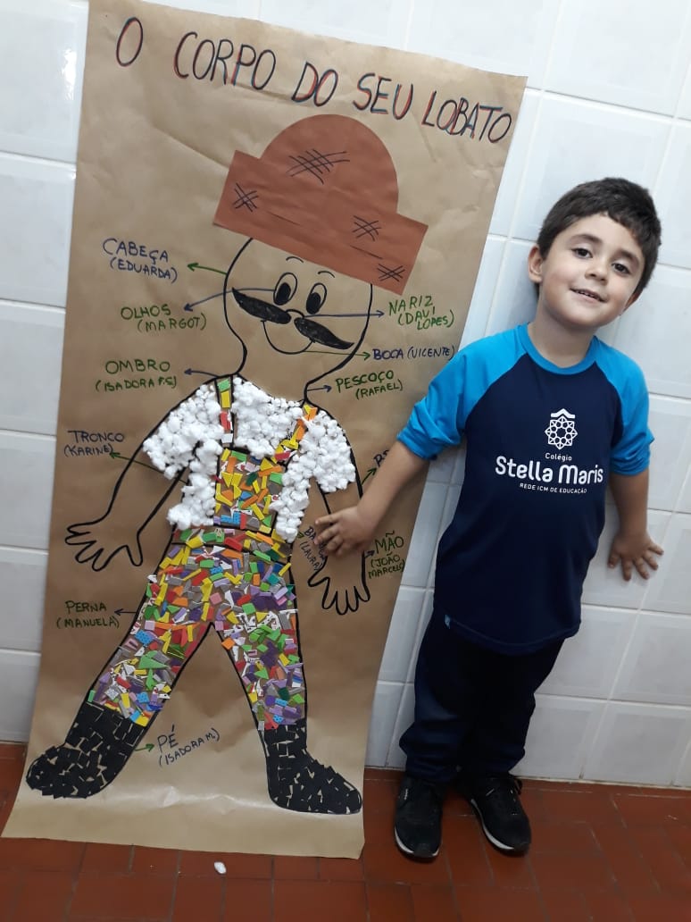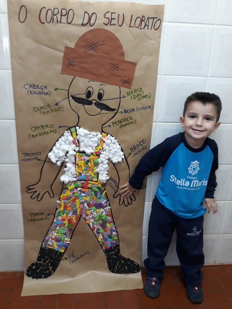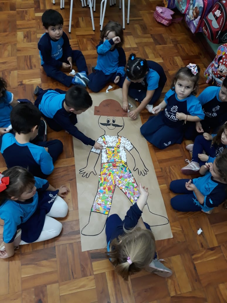 A turma de Maternal 2 está estudando sobre o corpo. Então, pensamos assim: quais partes do corpo que o Seu Lobato tem e que nós também temos? Falamos até no bigode, mas chegamos a conclusão que nem todas as pessoas tem bigodes. Foi muito divertido!
