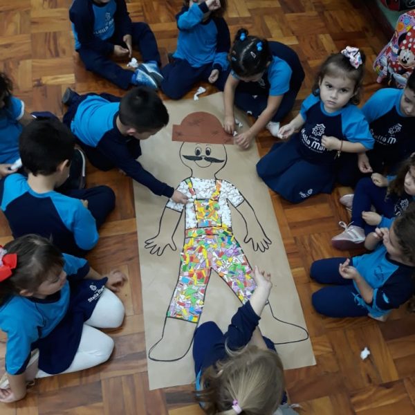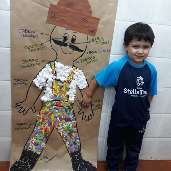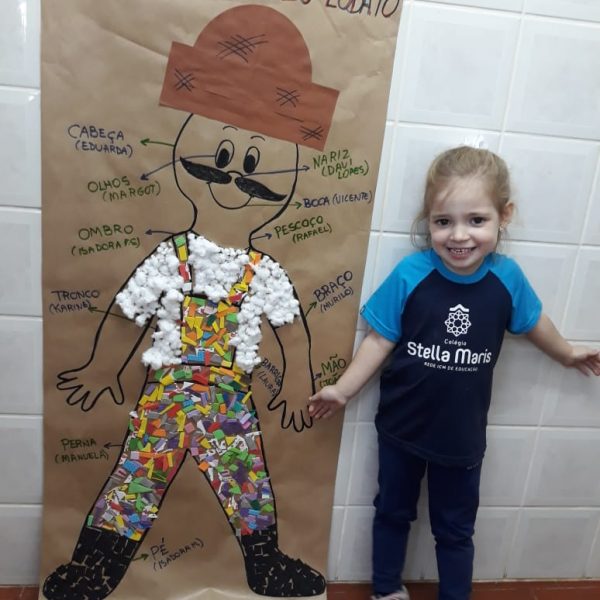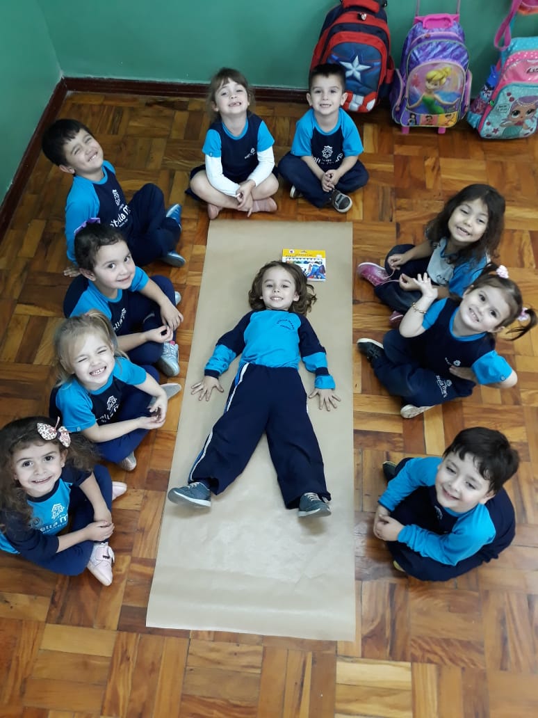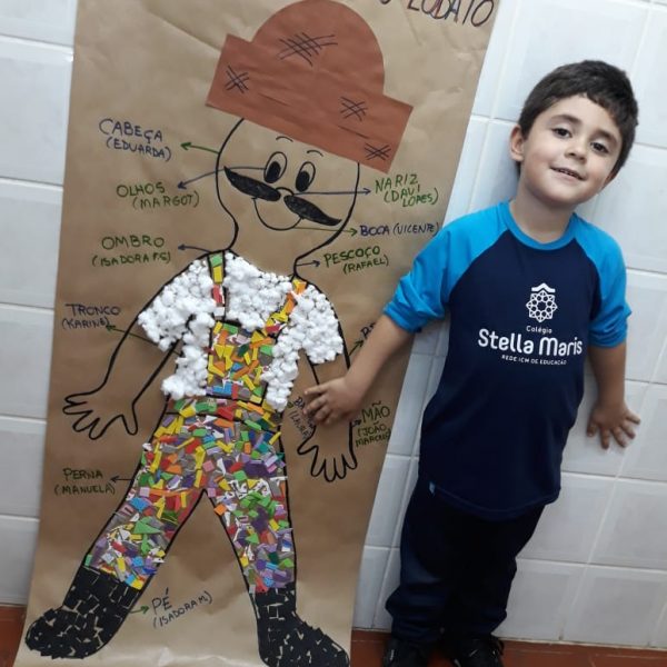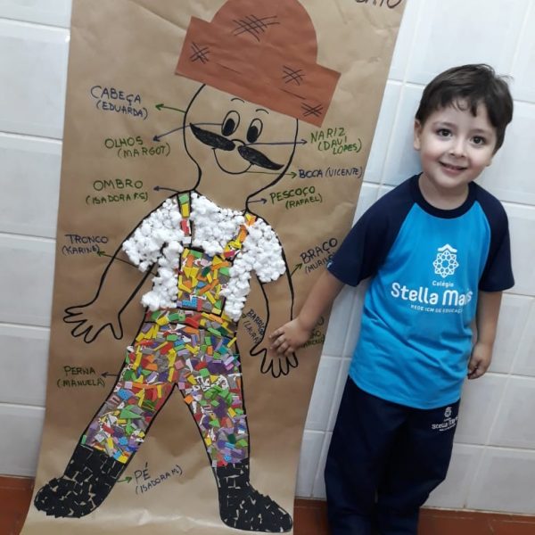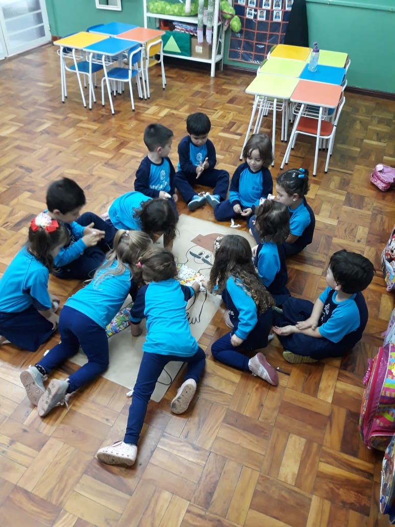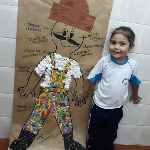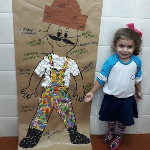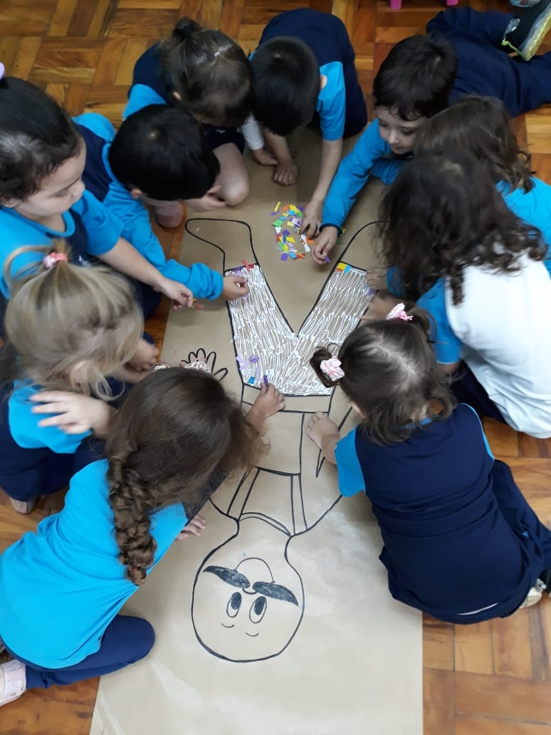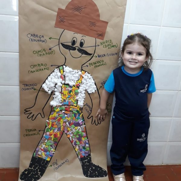 A turma de Maternal 2 está estudando sobre o corpo. Então, pensamos assim: quais partes do corpo que o Seu Lobato tem e que nós também temos? Falamos até no bigode, mas chegamos a conclusão que nem todas as pessoas tem bigodes. Foi muito divertido!