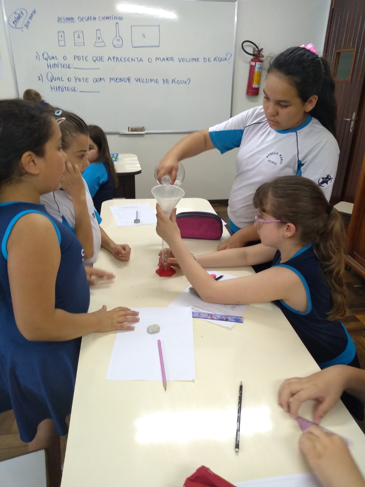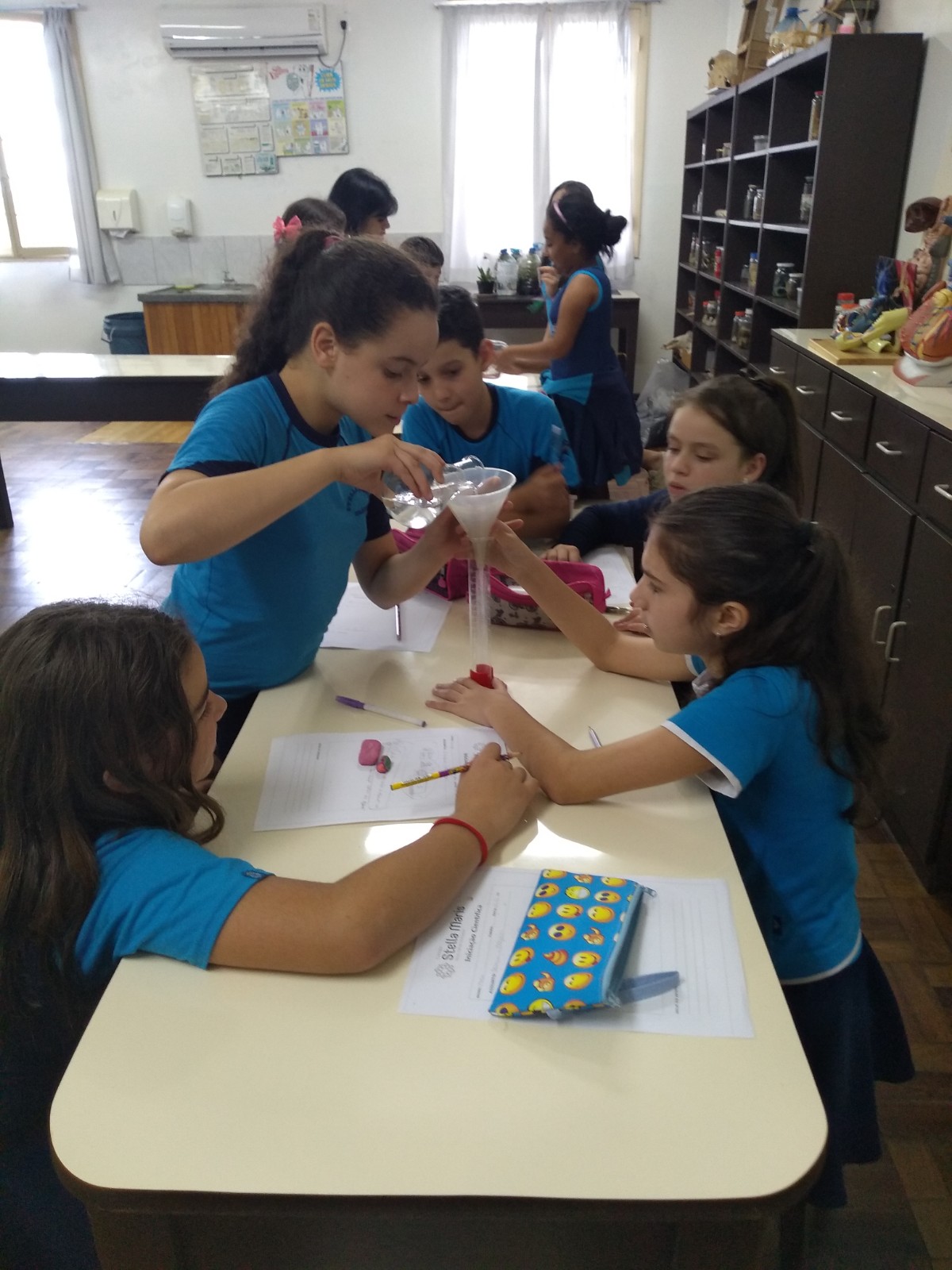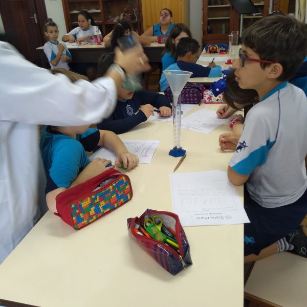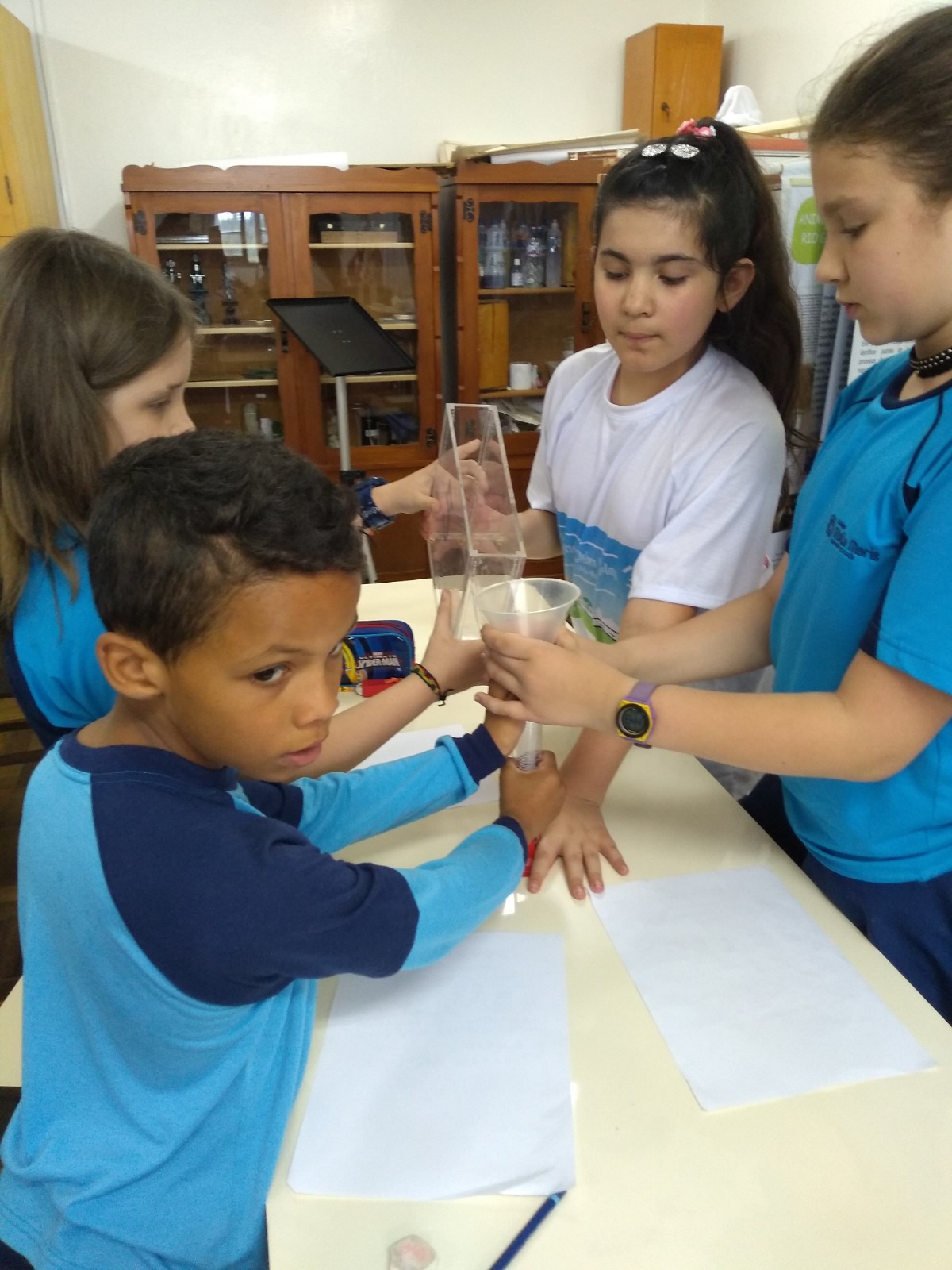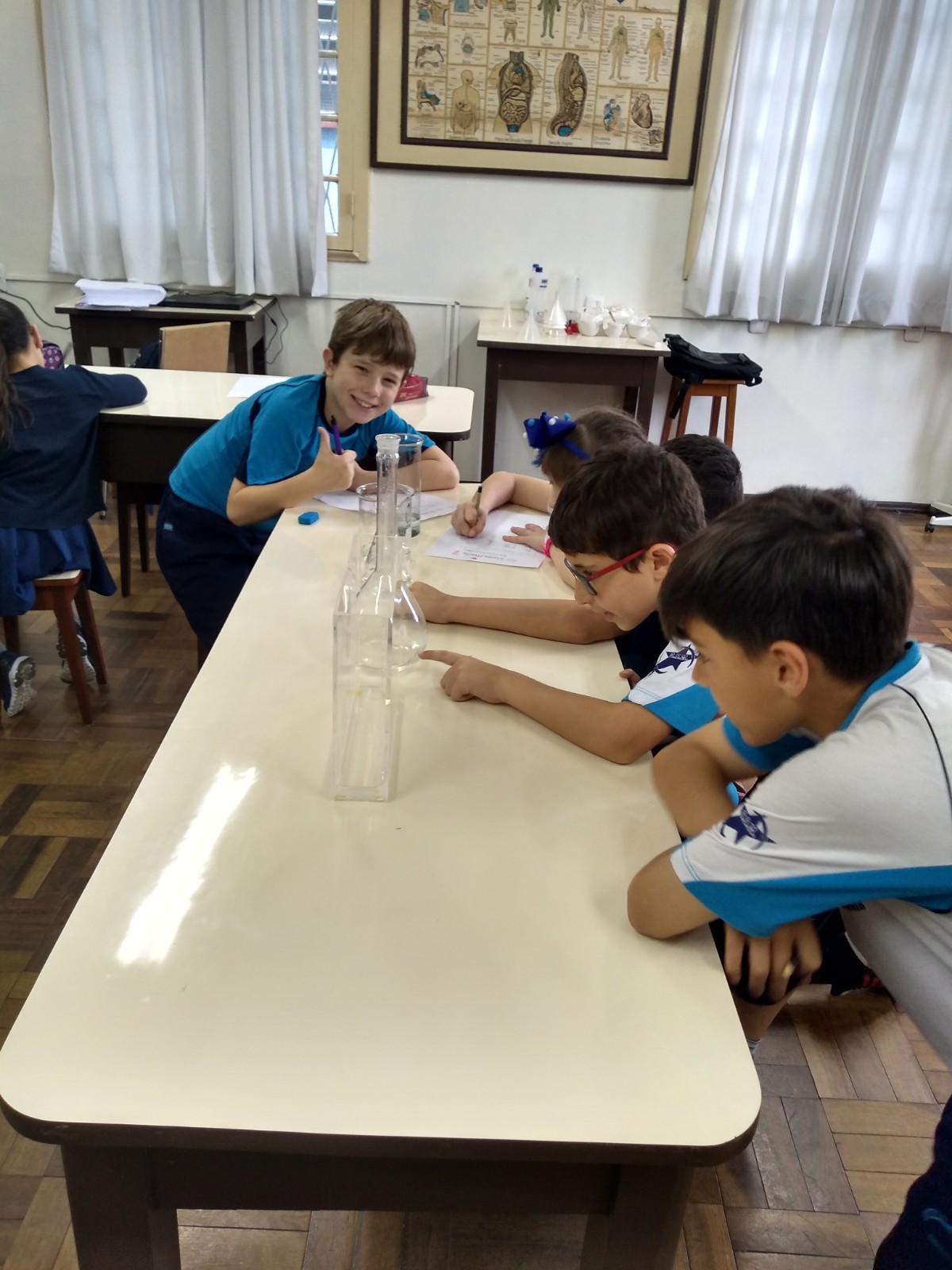 Os alunos da turma 44 aprenderam sobre volume e capacidade, realizando experiências e observações com diversos materiais do laboratório, na aula de Iniciação Científica com a professora Carla.