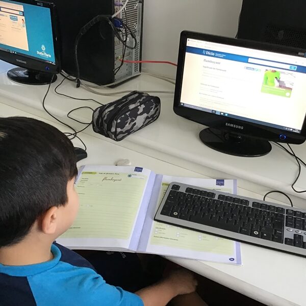 Turma 43 faz pesquisa na informática para a realização das atividades do livro Trajeto I .