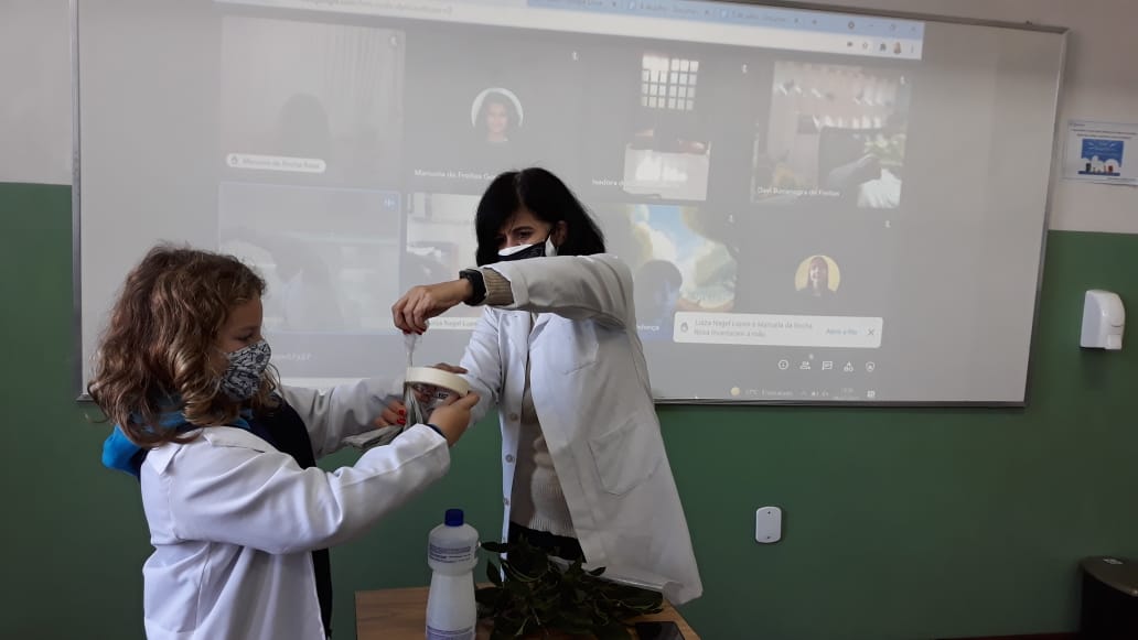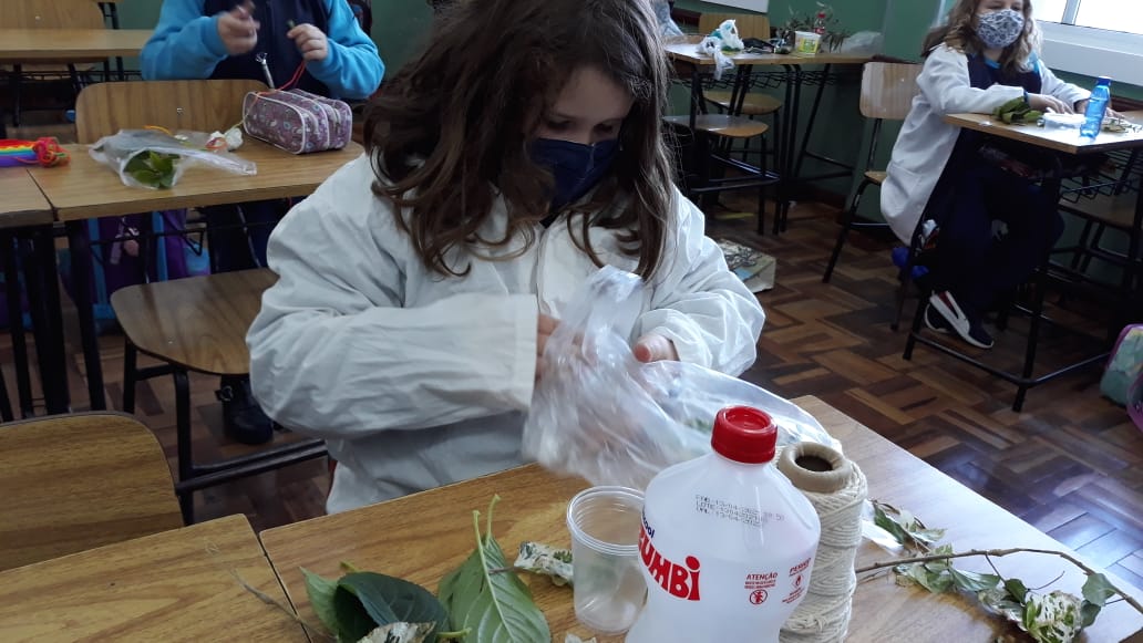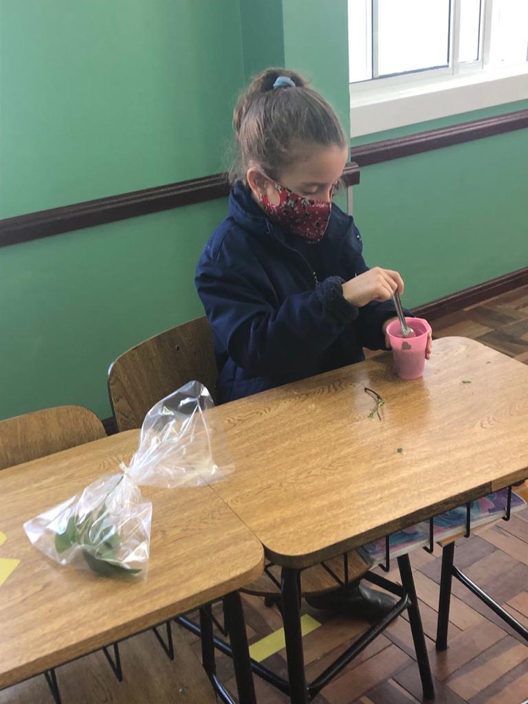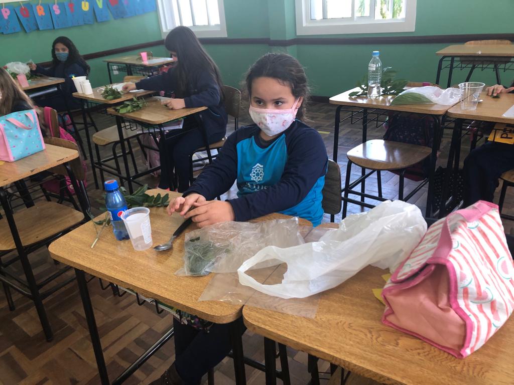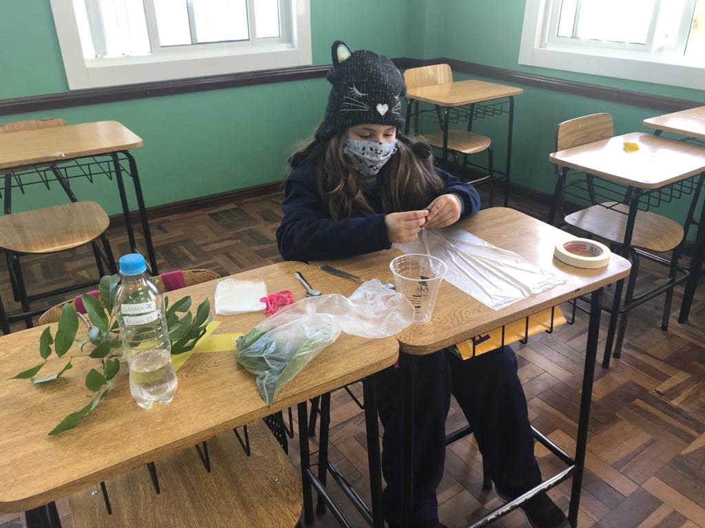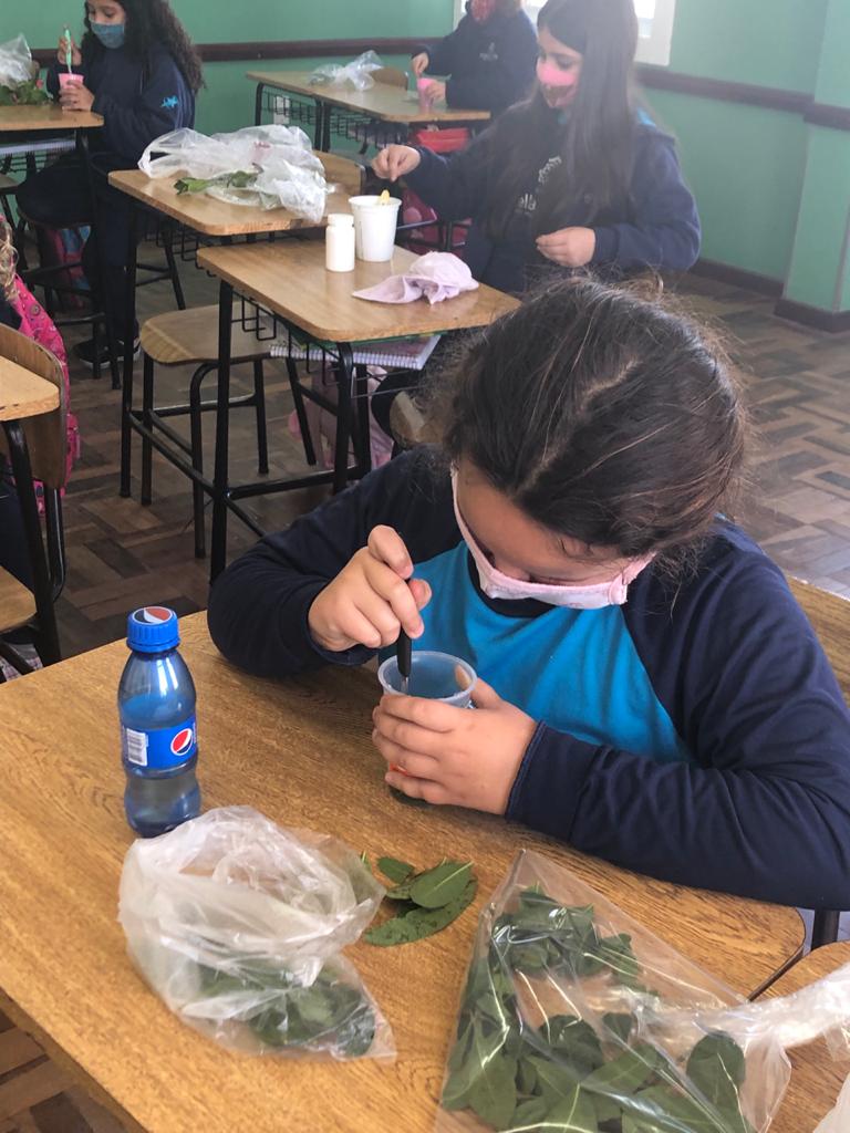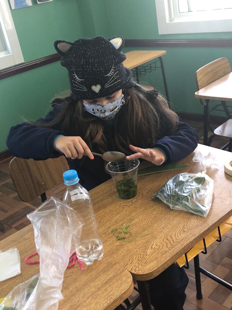 Os estudantes das turmas 22 e 23 também participaram da aula de Iniciação Científica Bimodal com as professoras Carla Ruschel, Cristina e Vacilane. Eles realizaram as duas experiências para compreender a respiração das plantas e sua coloração, extraindo a seiva.