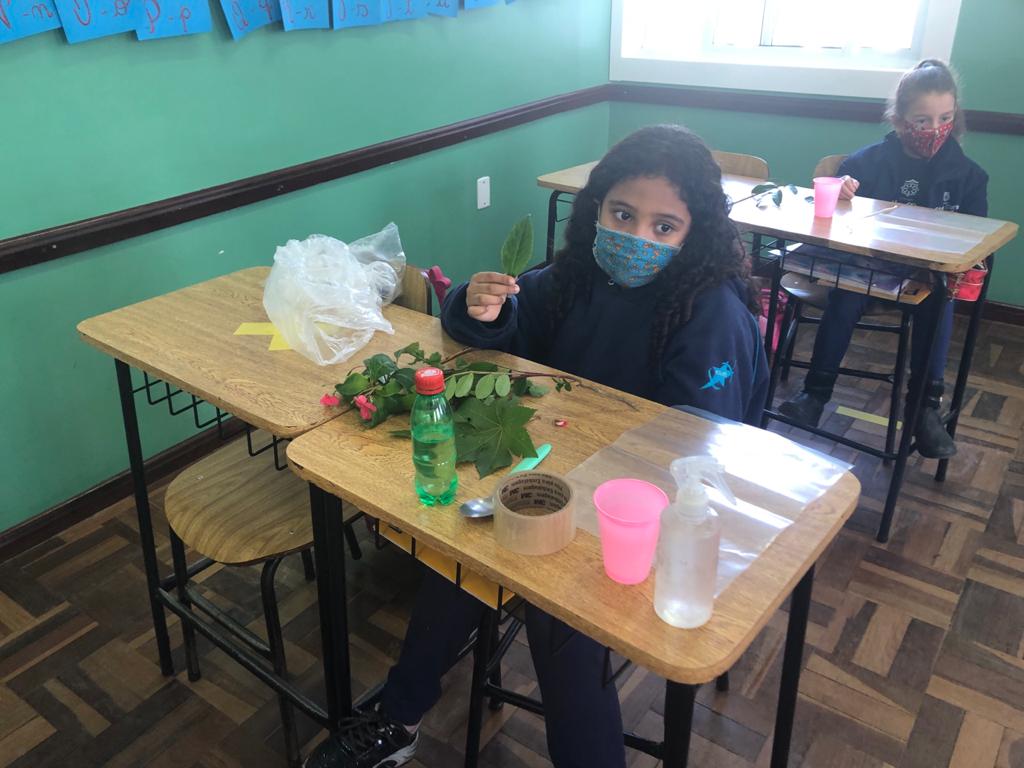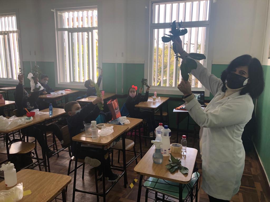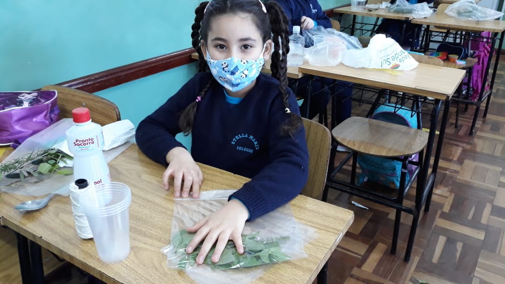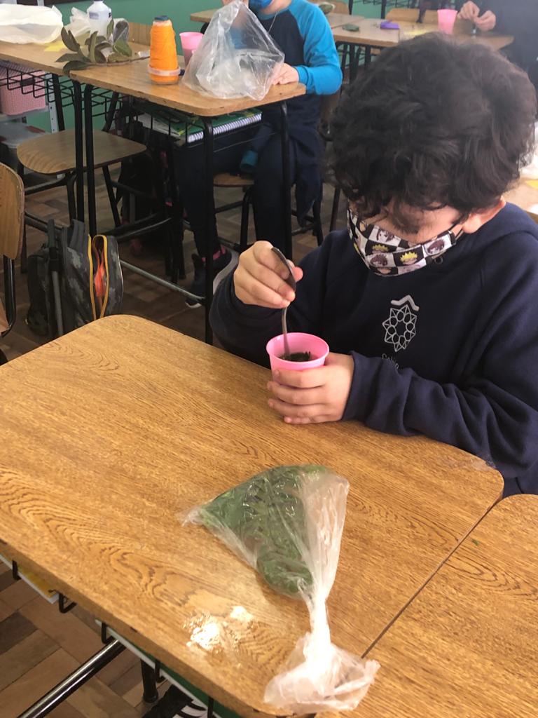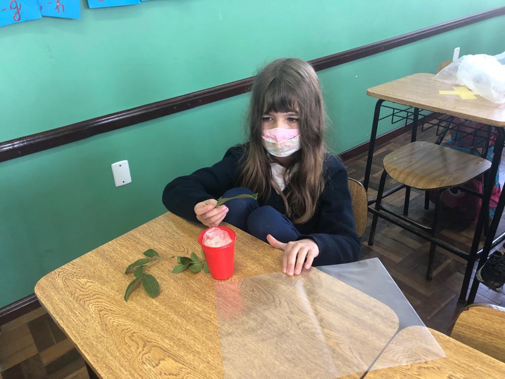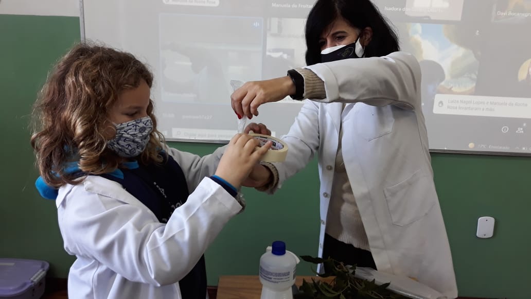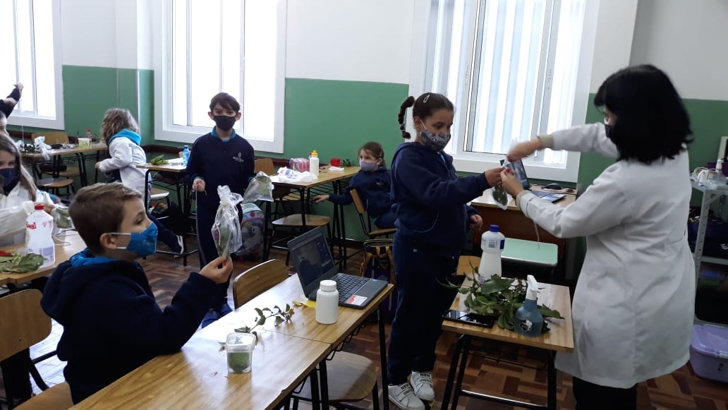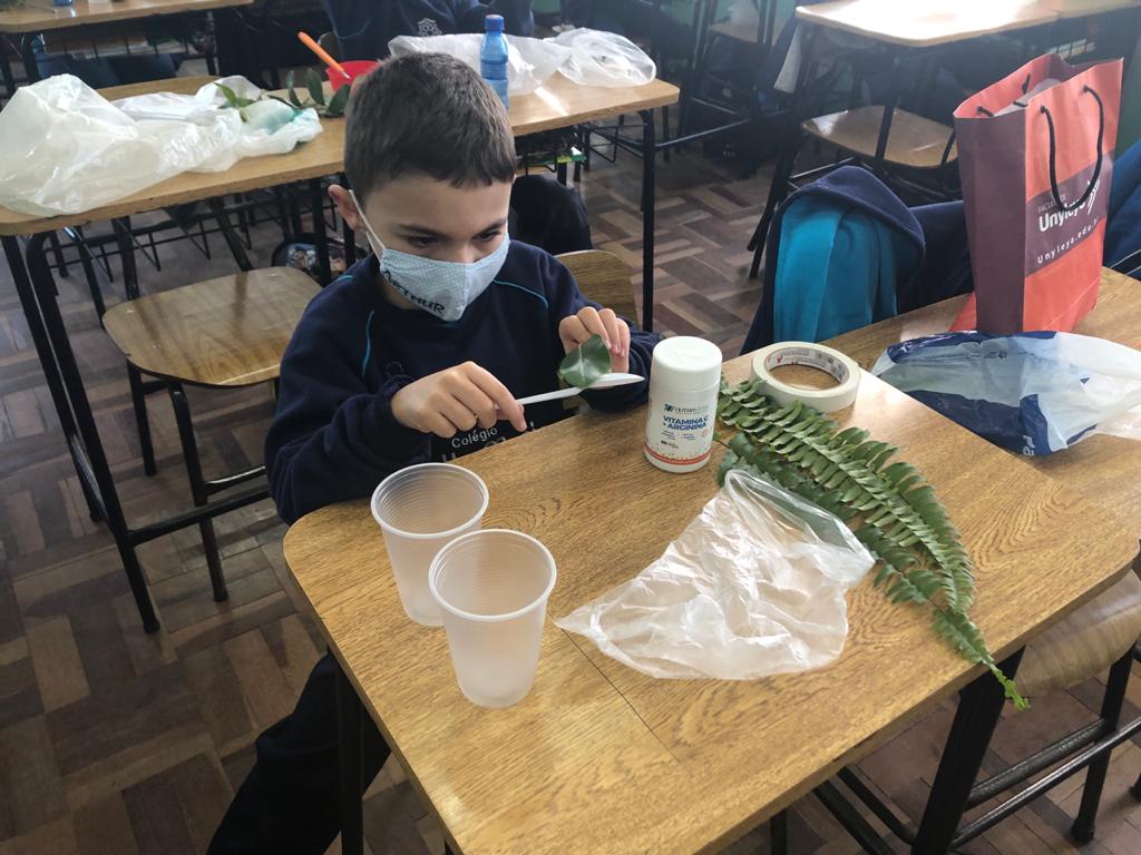 Os estudantes das turmas 22 e 23 também participaram da aula de Iniciação Científica Bimodal com as professoras Carla Ruschel, Cristina e Vacilane. Eles realizaram as duas experiências para compreender a respiração das plantas e sua coloração, extraindo a seiva.