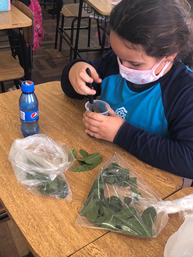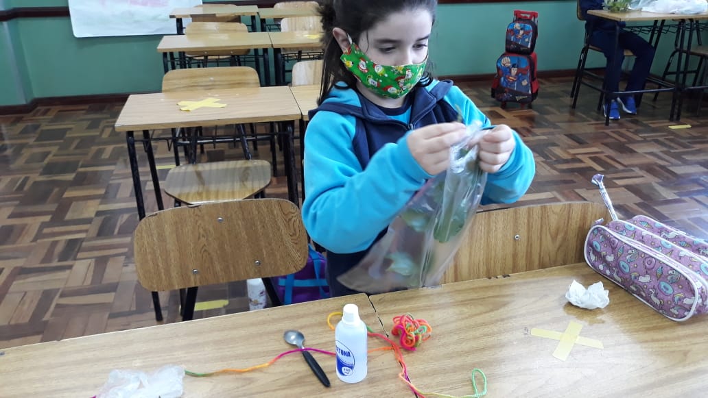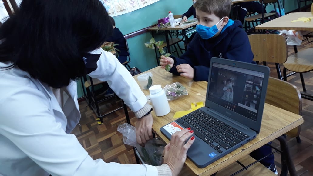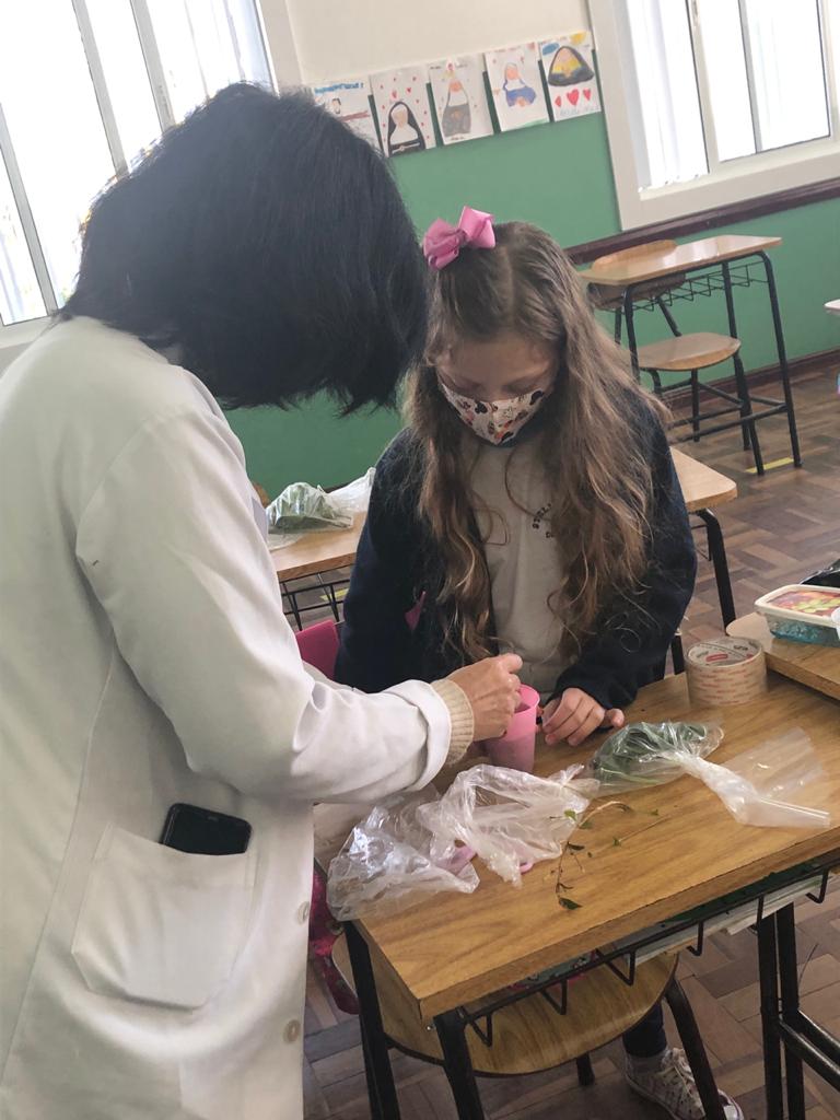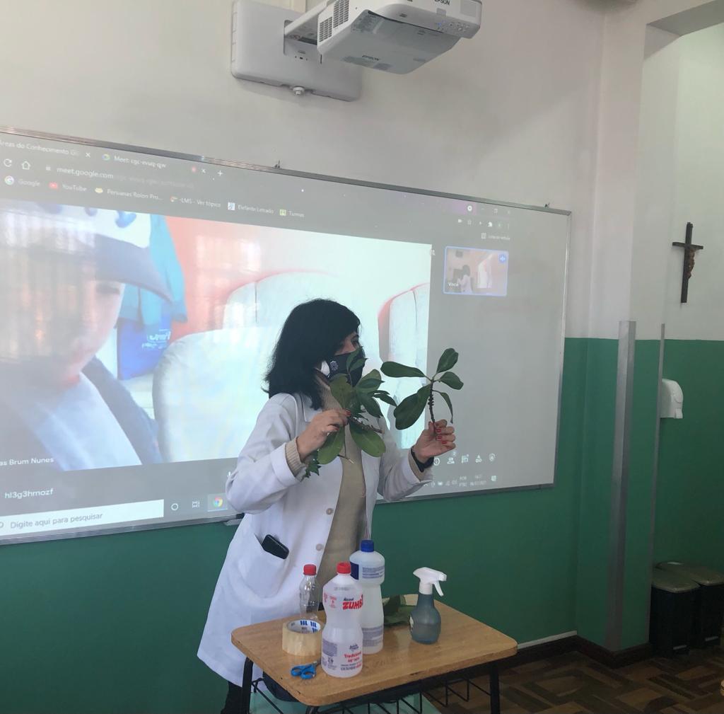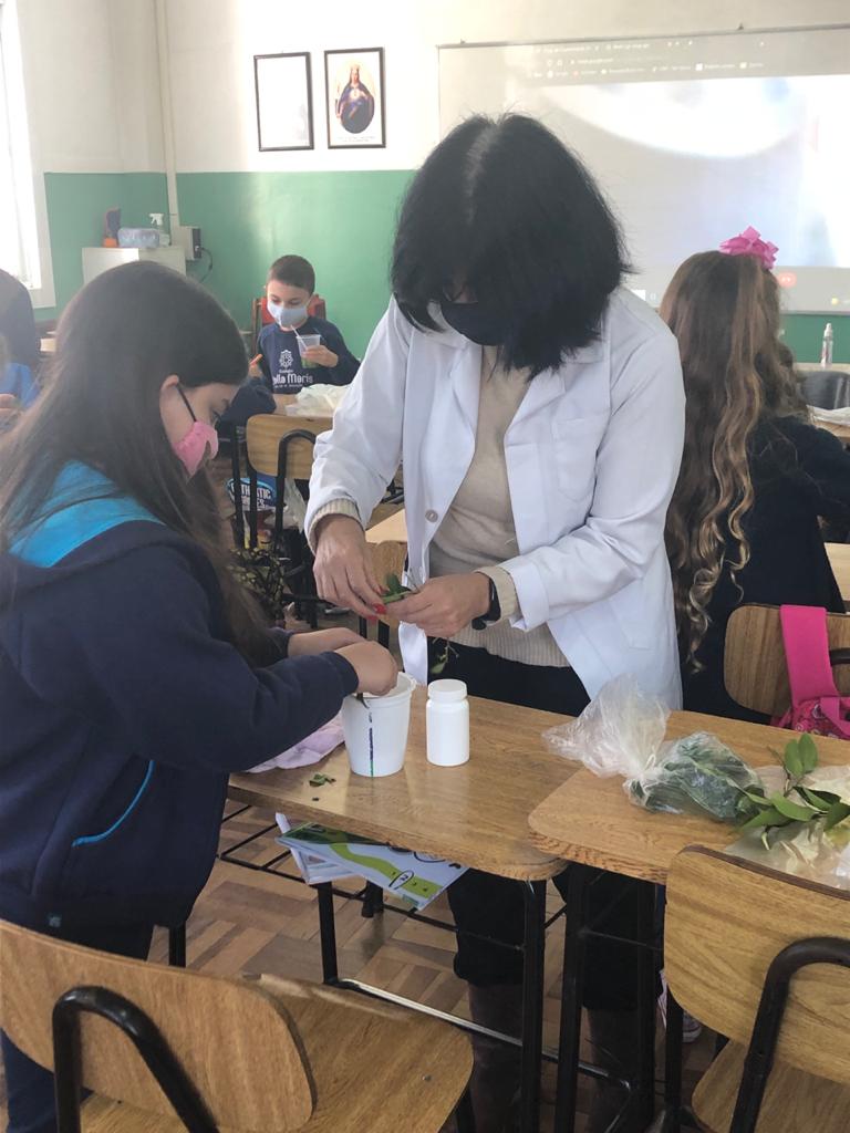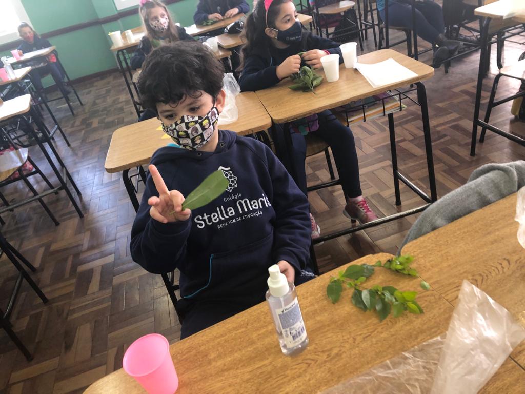 Os estudantes das turmas 22 e 23 também participaram da aula de Iniciação Científica Bimodal com as professoras Carla Ruschel, Cristina e Vacilane. Eles realizaram as duas experiências para compreender a respiração das plantas e sua coloração, extraindo a seiva.